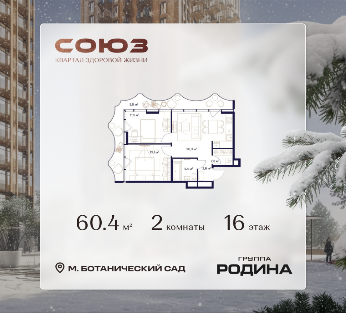 Рассрочка 0% <p> </p> Продаётся 2-комнатная квартира площадью 60.4 м² на 16 этаже в Жилом Комплексе «Союз». <p> </p> Квартал здоровой жизни премиум-класса с рекордным количеством олимпийских видов спорта: <p> </p> - Ледовая арена для хоккея и фигурного катания, - Футбольные поля для тренировок, - Спортивный зал для фехтования, - Бассейн на 6 дорожек, - Центр единоборств, - 4 крытых площадки для настольного тенниса, - 7 теннисных кортов (крытых и открытых), - 4 крытых площадки для сквоша, - Легкоатлетический стадион, - Площадки для баскетбола и волейбола. <p> </p> <p> </p> Уникальные форматы квартир с мастер-спальнями, приватными террасами, балконами, а также пентхаусы с открыточными видами на город. <p> </p> Все квартиры продаются с отделкой Shell&Core и панорамным остеклением. <p> </p> <p> </p> Расположение <p> </p> Пешком: <p> </p> - 2 мин. до парка «Сад Будущего»; - 6 мин. до ст. м. «Ботанический сад»; - 6 мин. до ст. МЦК «Ботанический сад»; - 6 мин. до парка «Леоновская роща»; <p> </p> <p> </p> На автомобиле: <p> </p> - 2 мин. до СВХ (МСД); - 5 мин. до Проспекта Мира; - 10 мин. до ТТК; - 15 мин. до Садового кольца; - 25 мин. до аэропорта «Шереметьево». <p> </p> <p> </p> Благоустройство <p> </p> - собственная спортивная инфраструктура 7 Га; - зона для пикников; - игровые и спортивные площадки для детей всех возрастов; - розарий, а также сосновые, каштановые и дубовые аллеи; - площадки под открытым небом для занятий спортом и йоги; - игровые комнаты для детей; - лаунж-зона для резидентов; - просторная переговорная для деловых встреч; - премиальный ресторан «Шабада» Сосо Павлиашвили с водными арт-объектами на прогулочной аллее, садом ароматных трав и сценой под открытым небом; - кафе, химчистки, аптеки и супермаркеты рядом с домом. <p> </p> <p> </p> Окружение <p> </p> - 8 парков: Сад Будущего, Леоновская роща, Хуамин, Главный ботанический сад РАН, Шереметьевская дубрава, Останкино, парк спорта «Яуза», пойма реки Яуза и музей-усадьба «Останкино»; - 3 ВУЗа: ВГИК, РГСУ, МГПУ; - 12 школ, в том числе: школа 1499 им. И.А. Докукина (топ 100), Brookes Moscow, IThub школа; - 18 детских садов, в том числе билингвальный ALERTUM KIDS; - один из крупнейших океанариумов Европы «Москвариум»; - один из крупнейших в Европе торгово-развлекательных центров «Европолис».