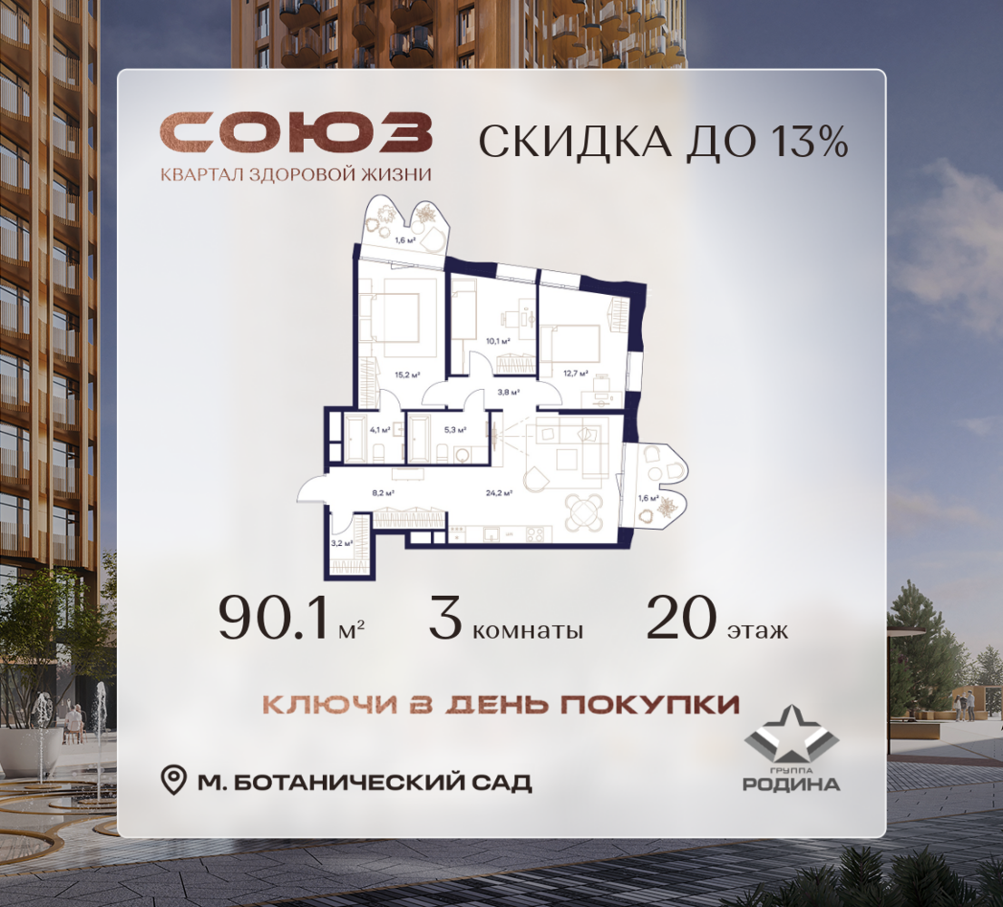 Готовые дома и ключи в день покупки <p> </p> Рассрочка 0% <p> </p> Продаётся 3-комнатная квартира площадью 90.1 м² на 20 этаже в Жилом Комплексе «Союз». <p> </p> Квартал здоровой жизни премиум-класса с рекордным количеством олимпийских видов спорта: <p> </p> - Ледовая арена для хоккея и фигурного катания, - Футбольные поля для тренировок, - Спортивный зал для фехтования, - Бассейн на 6 дорожек, - Центр единоборств, - 4 крытых площадки для настольного тенниса, - 7 теннисных кортов (крытых и открытых), - 4 крытых площадки для сквоша, - Легкоатлетический стадион, - Площадки для баскетбола и волейбола. <p> </p> <p> </p> Уникальные форматы квартир с мастер-спальнями, приватными террасами, балконами, а также пентхаусы с открыточными видами на город. <p> </p> Все квартиры продаются с отделкой Shell&Core и панорамным остеклением. <p> </p> <p> </p> Расположение <p> </p> Пешком: <p> </p> - 2 мин. до парка «Сад Будущего»; - 6 мин. до ст. м. «Ботанический сад»; - 6 мин. до ст. МЦК «Ботанический сад»; - 6 мин. до парка «Леоновская роща»; <p> </p> <p> </p> На автомобиле: <p> </p> - 2 мин. до СВХ (МСД); - 5 мин. до Проспекта Мира; - 10 мин. до ТТК; - 15 мин. до Садового кольца; - 25 мин. до аэропорта «Шереметьево». <p> </p> <p> </p> Благоустройство <p> </p> - собственная спортивная инфраструктура 7 Га; - зона для пикников; - игровые и спортивные площадки для детей всех возрастов; - розарий, а также сосновые, каштановые и дубовые аллеи; - площадки под открытым небом для занятий спортом и йоги; - игровые комнаты для детей; - лаунж-зона для резидентов; - просторная переговорная для деловых встреч; - премиальный ресторан «Шабада» Сосо Павлиашвили с водными арт-объектами на прогулочной аллее, садом ароматных трав и сценой под открытым небом; - кафе, химчистки, аптеки и супермаркеты рядом с домом. <p> </p> <p> </p> Окружение <p> </p> - 8 парков: Сад Будущего, Леоновская роща, Хуамин, Главный ботанический сад РАН, Шереметьевская дубрава, Останкино, парк спорта «Яуза», пойма реки Яуза и музей-усадьба «Останкино»; - 3 ВУЗа: ВГИК, РГСУ, МГПУ; - 12 школ, в том числе: школа 1499 им. И.А. Докукина (топ 100), Brookes Moscow, IThub школа; - 18 детских садов, в том числе билингвальный ALERTUM KIDS; - один из крупнейших океанариумов Европы «Москвариум»; - один из крупнейших в Европе торгово-развлекательных центров «Европолис».