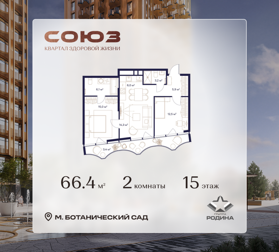 Рассрочка 0% <p> </p> Продаётся 2-комнатная квартира площадью 66.4 м² на 15 этаже в Жилом Комплексе «Союз». <p> </p> Квартал здоровой жизни премиум-класса с рекордным количеством олимпийских видов спорта: <p> </p> - Ледовая арена для хоккея и фигурного катания, - Футбольные поля для тренировок, - Спортивный зал для фехтования, - Бассейн на 6 дорожек, - Центр единоборств, - 4 крытых площадки для настольного тенниса, - 7 теннисных кортов (крытых и открытых), - 4 крытых площадки для сквоша, - Легкоатлетический стадион, - Площадки для баскетбола и волейбола. <p> </p> <p> </p> Уникальные форматы квартир с мастер-спальнями, приватными террасами, балконами, а также пентхаусы с открыточными видами на город. <p> </p> Все квартиры продаются с отделкой Shell&Core и панорамным остеклением. <p> </p> <p> </p> Расположение <p> </p> Пешком: <p> </p> - 2 мин. до парка «Сад Будущего»; - 6 мин. до ст. м. «Ботанический сад»; - 6 мин. до ст. МЦК «Ботанический сад»; - 6 мин. до парка «Леоновская роща»; <p> </p> <p> </p> На автомобиле: <p> </p> - 2 мин. до СВХ (МСД); - 5 мин. до Проспекта Мира; - 10 мин. до ТТК; - 15 мин. до Садового кольца; - 25 мин. до аэропорта «Шереметьево». <p> </p> <p> </p> Благоустройство <p> </p> - собственная спортивная инфраструктура 7 Га; - зона для пикников; - игровые и спортивные площадки для детей всех возрастов; - розарий, а также сосновые, каштановые и дубовые аллеи; - площадки под открытым небом для занятий спортом и йоги; - игровые комнаты для детей; - лаунж-зона для резидентов; - просторная переговорная для деловых встреч; - премиальный ресторан «Шабада» Сосо Павлиашвили с водными арт-объектами на прогулочной аллее, садом ароматных трав и сценой под открытым небом; - кафе, химчистки, аптеки и супермаркеты рядом с домом. <p> </p> <p> </p> Окружение <p> </p> - 8 парков: Сад Будущего, Леоновская роща, Хуамин, Главный ботанический сад РАН, Шереметьевская дубрава, Останкино, парк спорта «Яуза», пойма реки Яуза и музей-усадьба «Останкино»; - 3 ВУЗа: ВГИК, РГСУ, МГПУ; - 12 школ, в том числе: школа 1499 им. И.А. Докукина (топ 100), Brookes Moscow, IThub школа; - 18 детских садов, в том числе билингвальный ALERTUM KIDS; - один из крупнейших океанариумов Европы «Москвариум»; - один из крупнейших в Европе торгово-развлекательных центров «Европолис».