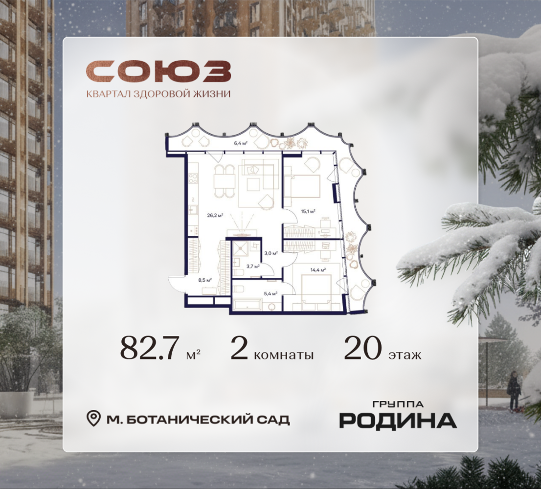 Рассрочка 0% <p> </p> Продаётся 2-комнатная квартира площадью 82.7 м² на 20 этаже в Жилом Комплексе «Союз». <p> </p> Квартал здоровой жизни премиум-класса с рекордным количеством олимпийских видов спорта: <p> </p> - Ледовая арена для хоккея и фигурного катания, - Футбольные поля для тренировок, - Спортивный зал для фехтования, - Бассейн на 6 дорожек, - Центр единоборств, - 4 крытых площадки для настольного тенниса, - 7 теннисных кортов (крытых и открытых), - 4 крытых площадки для сквоша, - Легкоатлетический стадион, - Площадки для баскетбола и волейбола. <p> </p> <p> </p> Уникальные форматы квартир с мастер-спальнями, приватными террасами, балконами, а также пентхаусы с открыточными видами на город. <p> </p> Все квартиры продаются с отделкой Shell&Core и панорамным остеклением. <p> </p> <p> </p> Расположение <p> </p> Пешком: <p> </p> - 2 мин. до парка «Сад Будущего»; - 6 мин. до ст. м. «Ботанический сад»; - 6 мин. до ст. МЦК «Ботанический сад»; - 6 мин. до парка «Леоновская роща»; <p> </p> <p> </p> На автомобиле: <p> </p> - 2 мин. до СВХ (МСД); - 5 мин. до Проспекта Мира; - 10 мин. до ТТК; - 15 мин. до Садового кольца; - 25 мин. до аэропорта «Шереметьево». <p> </p> <p> </p> Благоустройство <p> </p> - собственная спортивная инфраструктура 7 Га; - зона для пикников; - игровые и спортивные площадки для детей всех возрастов; - розарий, а также сосновые, каштановые и дубовые аллеи; - площадки под открытым небом для занятий спортом и йоги; - игровые комнаты для детей; - лаунж-зона для резидентов; - просторная переговорная для деловых встреч; - премиальный ресторан «Шабада» Сосо Павлиашвили с водными арт-объектами на прогулочной аллее, садом ароматных трав и сценой под открытым небом; - кафе, химчистки, аптеки и супермаркеты рядом с домом. <p> </p> <p> </p> Окружение <p> </p> - 8 парков: Сад Будущего, Леоновская роща, Хуамин, Главный ботанический сад РАН, Шереметьевская дубрава, Останкино, парк спорта «Яуза», пойма реки Яуза и музей-усадьба «Останкино»; - 3 ВУЗа: ВГИК, РГСУ, МГПУ; - 12 школ, в том числе: школа 1499 им. И.А. Докукина (топ 100), Brookes Moscow, IThub школа; - 18 детских садов, в том числе билингвальный ALERTUM KIDS; - один из крупнейших океанариумов Европы «Москвариум»; - один из крупнейших в Европе торгово-развлекательных центров «Европолис».