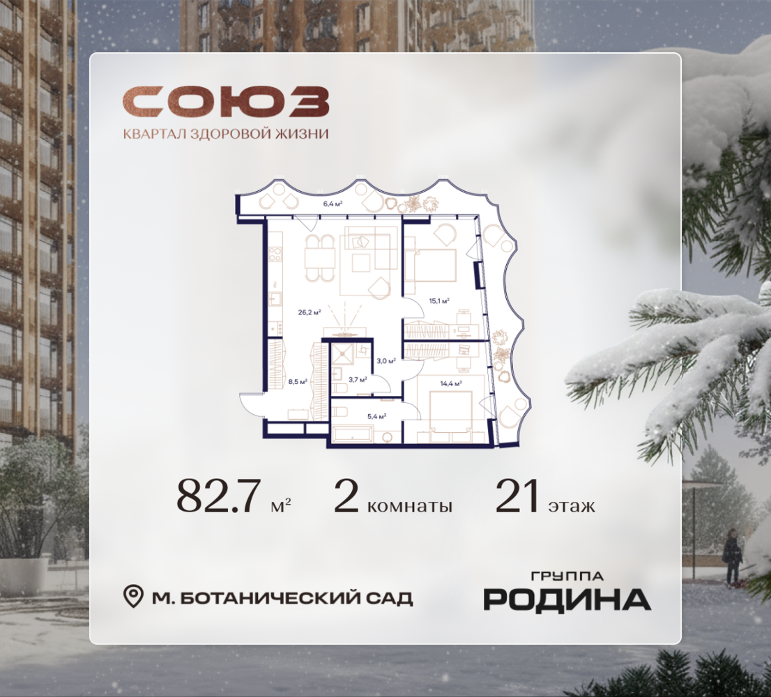 Рассрочка 0% <p> </p> Продаётся 2-комнатная квартира площадью 82.7 м² на 21 этаже в Жилом Комплексе «Союз». <p> </p> Квартал здоровой жизни премиум-класса с рекордным количеством олимпийских видов спорта: <p> </p> - Ледовая арена для хоккея и фигурного катания, - Футбольные поля для тренировок, - Спортивный зал для фехтования, - Бассейн на 6 дорожек, - Центр единоборств, - 4 крытых площадки для настольного тенниса, - 7 теннисных кортов (крытых и открытых), - 4 крытых площадки для сквоша, - Легкоатлетический стадион, - Площадки для баскетбола и волейбола. <p> </p> <p> </p> Уникальные форматы квартир с мастер-спальнями, приватными террасами, балконами, а также пентхаусы с открыточными видами на город. <p> </p> Все квартиры продаются с отделкой Shell&Core и панорамным остеклением. <p> </p> <p> </p> Расположение <p> </p> Пешком: <p> </p> - 2 мин. до парка «Сад Будущего»; - 6 мин. до ст. м. «Ботанический сад»; - 6 мин. до ст. МЦК «Ботанический сад»; - 6 мин. до парка «Леоновская роща»; <p> </p> <p> </p> На автомобиле: <p> </p> - 2 мин. до СВХ (МСД); - 5 мин. до Проспекта Мира; - 10 мин. до ТТК; - 15 мин. до Садового кольца; - 25 мин. до аэропорта «Шереметьево». <p> </p> <p> </p> Благоустройство <p> </p> - собственная спортивная инфраструктура 7 Га; - зона для пикников; - игровые и спортивные площадки для детей всех возрастов; - розарий, а также сосновые, каштановые и дубовые аллеи; - площадки под открытым небом для занятий спортом и йоги; - игровые комнаты для детей; - лаунж-зона для резидентов; - просторная переговорная для деловых встреч; - премиальный ресторан «Шабада» Сосо Павлиашвили с водными арт-объектами на прогулочной аллее, садом ароматных трав и сценой под открытым небом; - кафе, химчистки, аптеки и супермаркеты рядом с домом. <p> </p> <p> </p> Окружение <p> </p> - 8 парков: Сад Будущего, Леоновская роща, Хуамин, Главный ботанический сад РАН, Шереметьевская дубрава, Останкино, парк спорта «Яуза», пойма реки Яуза и музей-усадьба «Останкино»; - 3 ВУЗа: ВГИК, РГСУ, МГПУ; - 12 школ, в том числе: школа 1499 им. И.А. Докукина (топ 100), Brookes Moscow, IThub школа; - 18 детских садов, в том числе билингвальный ALERTUM KIDS; - один из крупнейших океанариумов Европы «Москвариум»; - один из крупнейших в Европе торгово-развлекательных центров «Европолис».