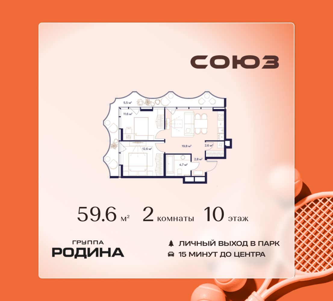 Рассрочка 0% <p> </p> Продаётся 2-комнатная квартира площадью 59.6 м² на 10 этаже в Жилом Комплексе «Союз». <p> </p> Квартал здоровой жизни премиум-класса с рекордным количеством олимпийских видов спорта: <p> </p> - Ледовая арена для хоккея и фигурного катания, - Футбольные поля для тренировок, - Спортивный зал для фехтования, - Бассейн на 6 дорожек, - Центр единоборств, - 4 крытых площадки для настольного тенниса, - 7 теннисных кортов (крытых и открытых), - 4 крытых площадки для сквоша, - Легкоатлетический стадион, - Площадки для баскетбола и волейбола. <p> </p> <p> </p> Уникальные форматы квартир с мастер-спальнями, приватными террасами, балконами, а также пентхаусы с открыточными видами на город. <p> </p> Все квартиры продаются с отделкой Shell&Core и панорамным остеклением. <p> </p> <p> </p> Расположение <p> </p> Пешком: <p> </p> - 2 мин. до парка «Сад Будущего»; - 6 мин. до ст. м. «Ботанический сад»; - 6 мин. до ст. МЦК «Ботанический сад»; - 6 мин. до парка «Леоновская роща»; <p> </p> <p> </p> На автомобиле: <p> </p> - 2 мин. до СВХ (МСД); - 5 мин. до Проспекта Мира; - 10 мин. до ТТК; - 15 мин. до Садового кольца; - 25 мин. до аэропорта «Шереметьево». <p> </p> <p> </p> Благоустройство <p> </p> - собственная спортивная инфраструктура 7 Га; - зона для пикников; - игровые и спортивные площадки для детей всех возрастов; - розарий, а также сосновые, каштановые и дубовые аллеи; - площадки под открытым небом для занятий спортом и йоги; - игровые комнаты для детей; - лаунж-зона для резидентов; - просторная переговорная для деловых встреч; - премиальный ресторан «Шабада» Сосо Павлиашвили с водными арт-объектами на прогулочной аллее, садом ароматных трав и сценой под открытым небом; - кафе, химчистки, аптеки и супермаркеты рядом с домом. <p> </p> <p> </p> Окружение <p> </p> - 8 парков: Сад Будущего, Леоновская роща, Хуамин, Главный ботанический сад РАН, Шереметьевская дубрава, Останкино, парк спорта «Яуза», пойма реки Яуза и музей-усадьба «Останкино»; - 3 ВУЗа: ВГИК, РГСУ, МГПУ; - 12 школ, в том числе: школа 1499 им. И.А. Докукина (топ 100), Brookes Moscow, IThub школа; - 18 детских садов, в том числе билингвальный ALERTUM KIDS; - один из крупнейших океанариумов Европы «Москвариум»; - один из крупнейших в Европе торгово-развлекательных центров «Европолис».