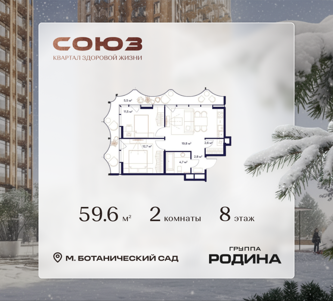 Рассрочка 0% <p> </p> Продаётся 2-комнатная квартира площадью 59.6 м² на 8 этаже в Жилом Комплексе «Союз». <p> </p> Квартал здоровой жизни премиум-класса с рекордным количеством олимпийских видов спорта: <p> </p> - Ледовая арена для хоккея и фигурного катания, - Футбольные поля для тренировок, - Спортивный зал для фехтования, - Бассейн на 6 дорожек, - Центр единоборств, - 4 крытых площадки для настольного тенниса, - 7 теннисных кортов (крытых и открытых), - 4 крытых площадки для сквоша, - Легкоатлетический стадион, - Площадки для баскетбола и волейбола. <p> </p> <p> </p> Уникальные форматы квартир с мастер-спальнями, приватными террасами, балконами, а также пентхаусы с открыточными видами на город. <p> </p> Все квартиры продаются с отделкой Shell&Core и панорамным остеклением. <p> </p> <p> </p> Расположение <p> </p> Пешком: <p> </p> - 2 мин. до парка «Сад Будущего»; - 6 мин. до ст. м. «Ботанический сад»; - 6 мин. до ст. МЦК «Ботанический сад»; - 6 мин. до парка «Леоновская роща»; <p> </p> <p> </p> На автомобиле: <p> </p> - 2 мин. до СВХ (МСД); - 5 мин. до Проспекта Мира; - 10 мин. до ТТК; - 15 мин. до Садового кольца; - 25 мин. до аэропорта «Шереметьево». <p> </p> <p> </p> Благоустройство <p> </p> - собственная спортивная инфраструктура 7 Га; - зона для пикников; - игровые и спортивные площадки для детей всех возрастов; - розарий, а также сосновые, каштановые и дубовые аллеи; - площадки под открытым небом для занятий спортом и йоги; - игровые комнаты для детей; - лаунж-зона для резидентов; - просторная переговорная для деловых встреч; - премиальный ресторан «Шабада» Сосо Павлиашвили с водными арт-объектами на прогулочной аллее, садом ароматных трав и сценой под открытым небом; - кафе, химчистки, аптеки и супермаркеты рядом с домом. <p> </p> <p> </p> Окружение <p> </p> - 8 парков: Сад Будущего, Леоновская роща, Хуамин, Главный ботанический сад РАН, Шереметьевская дубрава, Останкино, парк спорта «Яуза», пойма реки Яуза и музей-усадьба «Останкино»; - 3 ВУЗа: ВГИК, РГСУ, МГПУ; - 12 школ, в том числе: школа 1499 им. И.А. Докукина (топ 100), Brookes Moscow, IThub школа; - 18 детских садов, в том числе билингвальный ALERTUM KIDS; - один из крупнейших океанариумов Европы «Москвариум»; - один из крупнейших в Европе торгово-развлекательных центров «Европолис».
