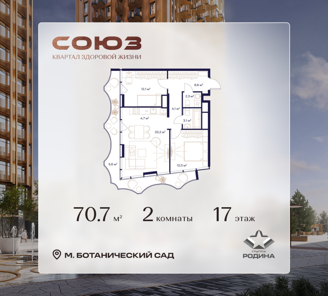 Рассрочка 0% <p> </p> Продаётся 2-комнатная квартира площадью 70.7 м² на 17 этаже в Жилом Комплексе «Союз». <p> </p> Квартал здоровой жизни премиум-класса с рекордным количеством олимпийских видов спорта: <p> </p> - Ледовая арена для хоккея и фигурного катания, - Футбольные поля для тренировок, - Спортивный зал для фехтования, - Бассейн на 6 дорожек, - Центр единоборств, - 4 крытых площадки для настольного тенниса, - 7 теннисных кортов (крытых и открытых), - 4 крытых площадки для сквоша, - Легкоатлетический стадион, - Площадки для баскетбола и волейбола. <p> </p> <p> </p> Уникальные форматы квартир с мастер-спальнями, приватными террасами, балконами, а также пентхаусы с открыточными видами на город. <p> </p> Все квартиры продаются с отделкой Shell&Core и панорамным остеклением. <p> </p> <p> </p> Расположение <p> </p> Пешком: <p> </p> - 2 мин. до парка «Сад Будущего»; - 6 мин. до ст. м. «Ботанический сад»; - 6 мин. до ст. МЦК «Ботанический сад»; - 6 мин. до парка «Леоновская роща»; <p> </p> <p> </p> На автомобиле: <p> </p> - 2 мин. до СВХ (МСД); - 5 мин. до Проспекта Мира; - 10 мин. до ТТК; - 15 мин. до Садового кольца; - 25 мин. до аэропорта «Шереметьево». <p> </p> <p> </p> Благоустройство <p> </p> - собственная спортивная инфраструктура 7 Га; - зона для пикников; - игровые и спортивные площадки для детей всех возрастов; - розарий, а также сосновые, каштановые и дубовые аллеи; - площадки под открытым небом для занятий спортом и йоги; - игровые комнаты для детей; - лаунж-зона для резидентов; - просторная переговорная для деловых встреч; - премиальный ресторан «Шабада» Сосо Павлиашвили с водными арт-объектами на прогулочной аллее, садом ароматных трав и сценой под открытым небом; - кафе, химчистки, аптеки и супермаркеты рядом с домом. <p> </p> <p> </p> Окружение <p> </p> - 8 парков: Сад Будущего, Леоновская роща, Хуамин, Главный ботанический сад РАН, Шереметьевская дубрава, Останкино, парк спорта «Яуза», пойма реки Яуза и музей-усадьба «Останкино»; - 3 ВУЗа: ВГИК, РГСУ, МГПУ; - 12 школ, в том числе: школа 1499 им. И.А. Докукина (топ 100), Brookes Moscow, IThub школа; - 18 детских садов, в том числе билингвальный ALERTUM KIDS; - один из крупнейших океанариумов Европы «Москвариум»; - один из крупнейших в Европе торгово-развлекательных центров «Европолис».