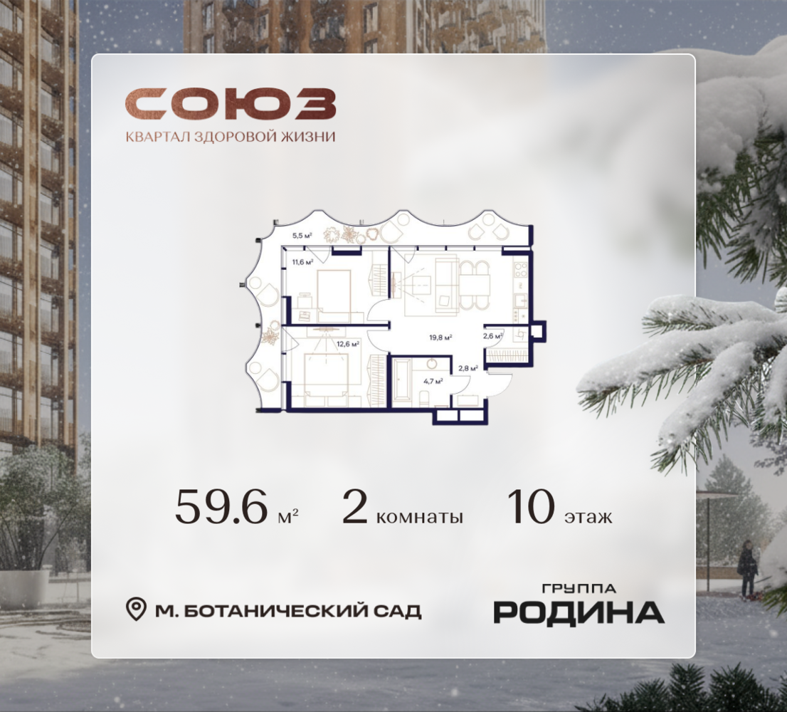 Рассрочка 0% <p> </p> Продаётся 2-комнатная квартира площадью 59.6 м² на 10 этаже в Жилом Комплексе «Союз». <p> </p> Квартал здоровой жизни премиум-класса с рекордным количеством олимпийских видов спорта: <p> </p> - Ледовая арена для хоккея и фигурного катания, - Футбольные поля для тренировок, - Спортивный зал для фехтования, - Бассейн на 6 дорожек, - Центр единоборств, - 4 крытых площадки для настольного тенниса, - 7 теннисных кортов (крытых и открытых), - 4 крытых площадки для сквоша, - Легкоатлетический стадион, - Площадки для баскетбола и волейбола. <p> </p> <p> </p> Уникальные форматы квартир с мастер-спальнями, приватными террасами, балконами, а также пентхаусы с открыточными видами на город. <p> </p> Все квартиры продаются с отделкой Shell&Core и панорамным остеклением. <p> </p> <p> </p> Расположение <p> </p> Пешком: <p> </p> - 2 мин. до парка «Сад Будущего»; - 6 мин. до ст. м. «Ботанический сад»; - 6 мин. до ст. МЦК «Ботанический сад»; - 6 мин. до парка «Леоновская роща»; <p> </p> <p> </p> На автомобиле: <p> </p> - 2 мин. до СВХ (МСД); - 5 мин. до Проспекта Мира; - 10 мин. до ТТК; - 15 мин. до Садового кольца; - 25 мин. до аэропорта «Шереметьево». <p> </p> <p> </p> Благоустройство <p> </p> - собственная спортивная инфраструктура 7 Га; - зона для пикников; - игровые и спортивные площадки для детей всех возрастов; - розарий, а также сосновые, каштановые и дубовые аллеи; - площадки под открытым небом для занятий спортом и йоги; - игровые комнаты для детей; - лаунж-зона для резидентов; - просторная переговорная для деловых встреч; - премиальный ресторан «Шабада» Сосо Павлиашвили с водными арт-объектами на прогулочной аллее, садом ароматных трав и сценой под открытым небом; - кафе, химчистки, аптеки и супермаркеты рядом с домом. <p> </p> <p> </p> Окружение <p> </p> - 8 парков: Сад Будущего, Леоновская роща, Хуамин, Главный ботанический сад РАН, Шереметьевская дубрава, Останкино, парк спорта «Яуза», пойма реки Яуза и музей-усадьба «Останкино»; - 3 ВУЗа: ВГИК, РГСУ, МГПУ; - 12 школ, в том числе: школа 1499 им. И.А. Докукина (топ 100), Brookes Moscow, IThub школа; - 18 детских садов, в том числе билингвальный ALERTUM KIDS; - один из крупнейших океанариумов Европы «Москвариум»; - один из крупнейших в Европе торгово-развлекательных центров «Европолис».