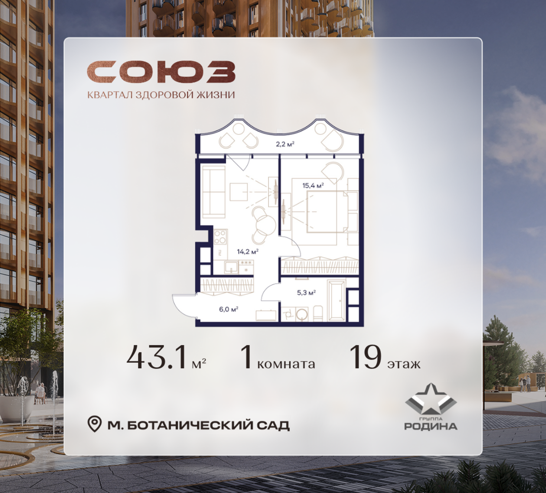 Рассрочка 0% <p> </p> Продаётся 1-комнатная квартира площадью 43.1 м² на 19 этаже в Жилом Комплексе «Союз». <p> </p> Квартал здоровой жизни премиум-класса с рекордным количеством олимпийских видов спорта: <p> </p> - Ледовая арена для хоккея и фигурного катания, - Футбольные поля для тренировок, - Спортивный зал для фехтования, - Бассейн на 6 дорожек, - Центр единоборств, - 4 крытых площадки для настольного тенниса, - 7 теннисных кортов (крытых и открытых), - 4 крытых площадки для сквоша, - Легкоатлетический стадион, - Площадки для баскетбола и волейбола. <p> </p> <p> </p> Уникальные форматы квартир с мастер-спальнями, приватными террасами, балконами, а также пентхаусы с открыточными видами на город. <p> </p> Все квартиры продаются с отделкой Shell&Core и панорамным остеклением. <p> </p> <p> </p> Расположение <p> </p> Пешком: <p> </p> - 2 мин. до парка «Сад Будущего»; - 6 мин. до ст. м. «Ботанический сад»; - 6 мин. до ст. МЦК «Ботанический сад»; - 6 мин. до парка «Леоновская роща»; <p> </p> <p> </p> На автомобиле: <p> </p> - 2 мин. до СВХ (МСД); - 5 мин. до Проспекта Мира; - 10 мин. до ТТК; - 15 мин. до Садового кольца; - 25 мин. до аэропорта «Шереметьево». <p> </p> <p> </p> Благоустройство <p> </p> - собственная спортивная инфраструктура 7 Га; - зона для пикников; - игровые и спортивные площадки для детей всех возрастов; - розарий, а также сосновые, каштановые и дубовые аллеи; - площадки под открытым небом для занятий спортом и йоги; - игровые комнаты для детей; - лаунж-зона для резидентов; - просторная переговорная для деловых встреч; - премиальный ресторан «Шабада» Сосо Павлиашвили с водными арт-объектами на прогулочной аллее, садом ароматных трав и сценой под открытым небом; - кафе, химчистки, аптеки и супермаркеты рядом с домом. <p> </p> <p> </p> Окружение <p> </p> - 8 парков: Сад Будущего, Леоновская роща, Хуамин, Главный ботанический сад РАН, Шереметьевская дубрава, Останкино, парк спорта «Яуза», пойма реки Яуза и музей-усадьба «Останкино»; - 3 ВУЗа: ВГИК, РГСУ, МГПУ; - 12 школ, в том числе: школа 1499 им. И.А. Докукина (топ 100), Brookes Moscow, IThub школа; - 18 детских садов, в том числе билингвальный ALERTUM KIDS; - один из крупнейших океанариумов Европы «Москвариум»; - один из крупнейших в Европе торгово-развлекательных центров «Европолис».