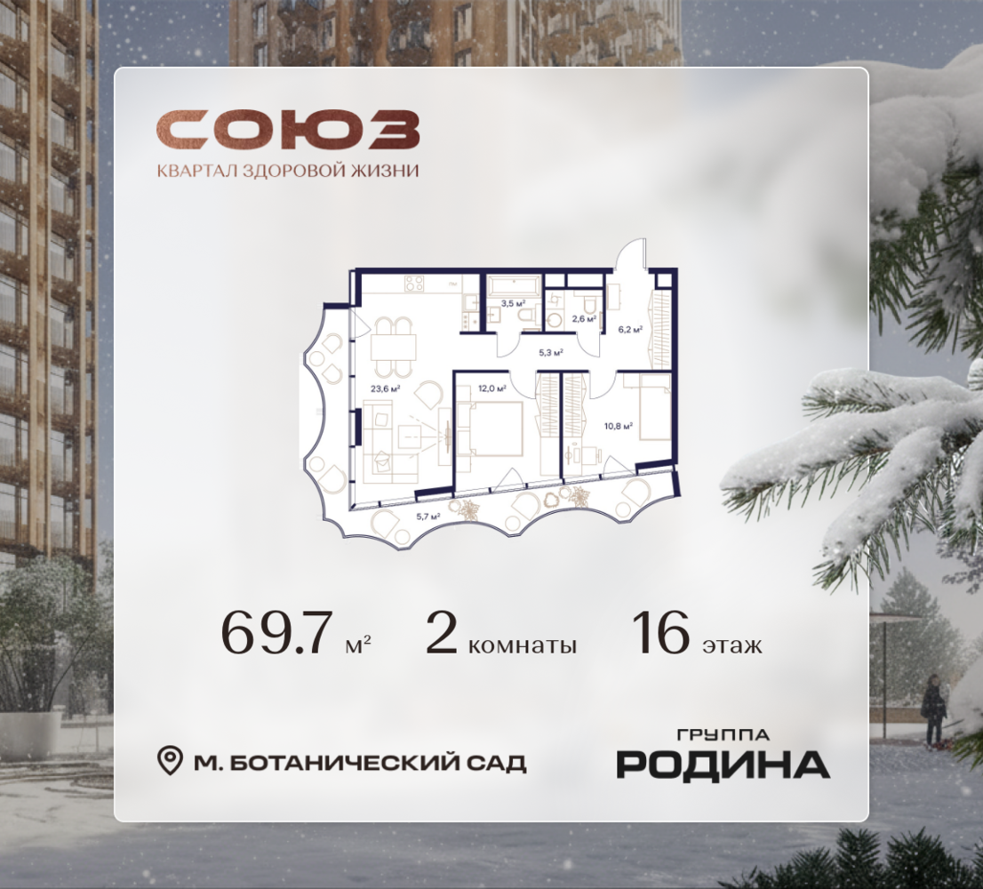 Рассрочка 0% <p> </p> Продаётся 2-комнатная квартира площадью 69.7 м² на 16 этаже в Жилом Комплексе «Союз». <p> </p> Квартал здоровой жизни премиум-класса с рекордным количеством олимпийских видов спорта: <p> </p> - Ледовая арена для хоккея и фигурного катания, - Футбольные поля для тренировок, - Спортивный зал для фехтования, - Бассейн на 6 дорожек, - Центр единоборств, - 4 крытых площадки для настольного тенниса, - 7 теннисных кортов (крытых и открытых), - 4 крытых площадки для сквоша, - Легкоатлетический стадион, - Площадки для баскетбола и волейбола. <p> </p> <p> </p> Уникальные форматы квартир с мастер-спальнями, приватными террасами, балконами, а также пентхаусы с открыточными видами на город. <p> </p> Все квартиры продаются с отделкой Shell&Core и панорамным остеклением. <p> </p> <p> </p> Расположение <p> </p> Пешком: <p> </p> - 2 мин. до парка «Сад Будущего»; - 6 мин. до ст. м. «Ботанический сад»; - 6 мин. до ст. МЦК «Ботанический сад»; - 6 мин. до парка «Леоновская роща»; <p> </p> <p> </p> На автомобиле: <p> </p> - 2 мин. до СВХ (МСД); - 5 мин. до Проспекта Мира; - 10 мин. до ТТК; - 15 мин. до Садового кольца; - 25 мин. до аэропорта «Шереметьево». <p> </p> <p> </p> Благоустройство <p> </p> - собственная спортивная инфраструктура 7 Га; - зона для пикников; - игровые и спортивные площадки для детей всех возрастов; - розарий, а также сосновые, каштановые и дубовые аллеи; - площадки под открытым небом для занятий спортом и йоги; - игровые комнаты для детей; - лаунж-зона для резидентов; - просторная переговорная для деловых встреч; - премиальный ресторан «Шабада» Сосо Павлиашвили с водными арт-объектами на прогулочной аллее, садом ароматных трав и сценой под открытым небом; - кафе, химчистки, аптеки и супермаркеты рядом с домом. <p> </p> <p> </p> Окружение <p> </p> - 8 парков: Сад Будущего, Леоновская роща, Хуамин, Главный ботанический сад РАН, Шереметьевская дубрава, Останкино, парк спорта «Яуза», пойма реки Яуза и музей-усадьба «Останкино»; - 3 ВУЗа: ВГИК, РГСУ, МГПУ; - 12 школ, в том числе: школа 1499 им. И.А. Докукина (топ 100), Brookes Moscow, IThub школа; - 18 детских садов, в том числе билингвальный ALERTUM KIDS; - один из крупнейших океанариумов Европы «Москвариум»; - один из крупнейших в Европе торгово-развлекательных центров «Европолис».