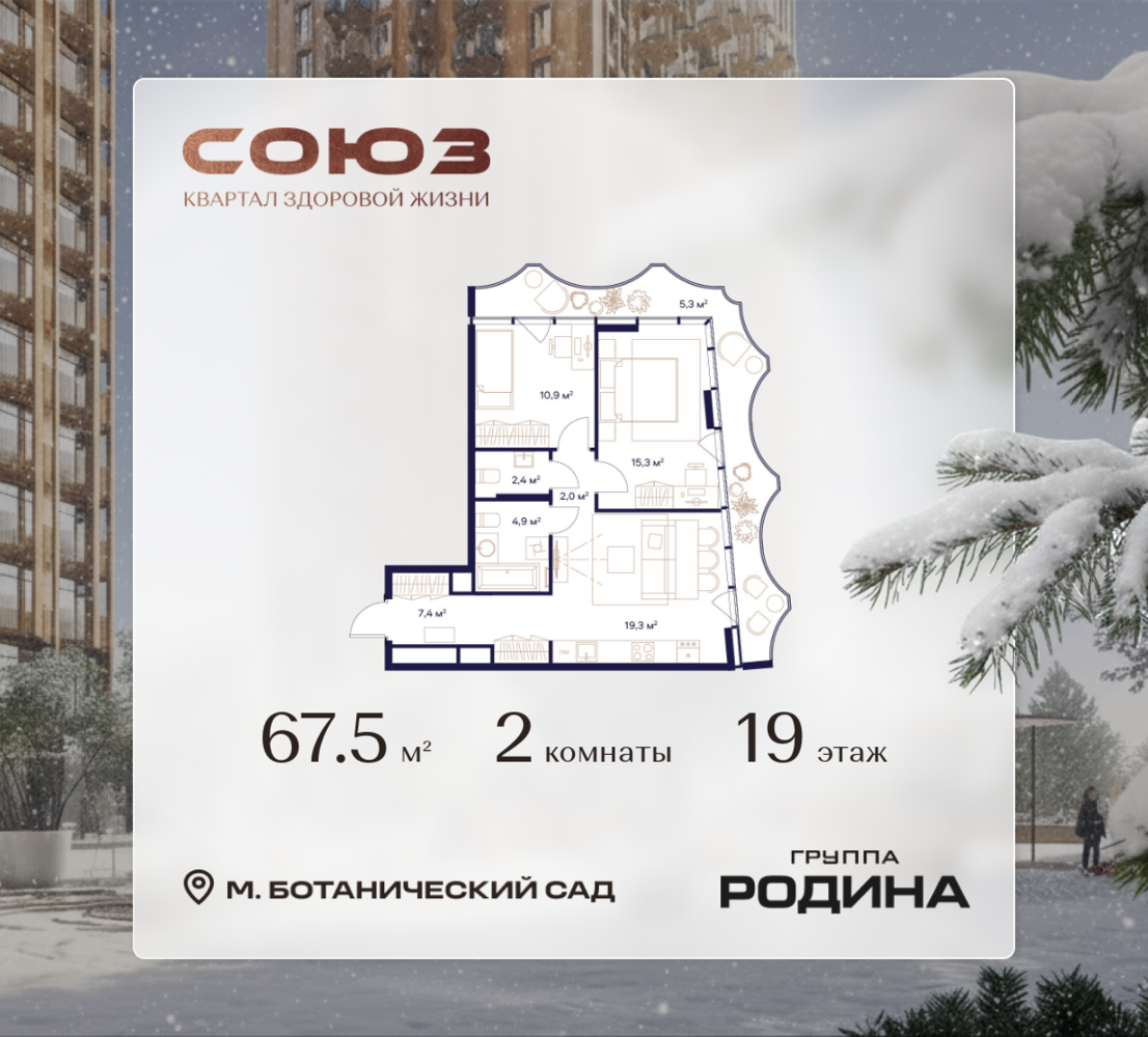 Рассрочка 0% <p> </p> Продаётся 2-комнатная квартира площадью 67.5 м² на 19 этаже в Жилом Комплексе «Союз». <p> </p> Квартал здоровой жизни премиум-класса с рекордным количеством олимпийских видов спорта: <p> </p> - Ледовая арена для хоккея и фигурного катания, - Футбольные поля для тренировок, - Спортивный зал для фехтования, - Бассейн на 6 дорожек, - Центр единоборств, - 4 крытых площадки для настольного тенниса, - 7 теннисных кортов (крытых и открытых), - 4 крытых площадки для сквоша, - Легкоатлетический стадион, - Площадки для баскетбола и волейбола. <p> </p> <p> </p> Уникальные форматы квартир с мастер-спальнями, приватными террасами, балконами, а также пентхаусы с открыточными видами на город. <p> </p> Все квартиры продаются с отделкой Shell&Core и панорамным остеклением. <p> </p> <p> </p> Расположение <p> </p> Пешком: <p> </p> - 2 мин. до парка «Сад Будущего»; - 6 мин. до ст. м. «Ботанический сад»; - 6 мин. до ст. МЦК «Ботанический сад»; - 6 мин. до парка «Леоновская роща»; <p> </p> <p> </p> На автомобиле: <p> </p> - 2 мин. до СВХ (МСД); - 5 мин. до Проспекта Мира; - 10 мин. до ТТК; - 15 мин. до Садового кольца; - 25 мин. до аэропорта «Шереметьево». <p> </p> <p> </p> Благоустройство <p> </p> - собственная спортивная инфраструктура 7 Га; - зона для пикников; - игровые и спортивные площадки для детей всех возрастов; - розарий, а также сосновые, каштановые и дубовые аллеи; - площадки под открытым небом для занятий спортом и йоги; - игровые комнаты для детей; - лаунж-зона для резидентов; - просторная переговорная для деловых встреч; - премиальный ресторан «Шабада» Сосо Павлиашвили с водными арт-объектами на прогулочной аллее, садом ароматных трав и сценой под открытым небом; - кафе, химчистки, аптеки и супермаркеты рядом с домом. <p> </p> <p> </p> Окружение <p> </p> - 8 парков: Сад Будущего, Леоновская роща, Хуамин, Главный ботанический сад РАН, Шереметьевская дубрава, Останкино, парк спорта «Яуза», пойма реки Яуза и музей-усадьба «Останкино»; - 3 ВУЗа: ВГИК, РГСУ, МГПУ; - 12 школ, в том числе: школа 1499 им. И.А. Докукина (топ 100), Brookes Moscow, IThub школа; - 18 детских садов, в том числе билингвальный ALERTUM KIDS; - один из крупнейших океанариумов Европы «Москвариум»; - один из крупнейших в Европе торгово-развлекательных центров «Европолис».