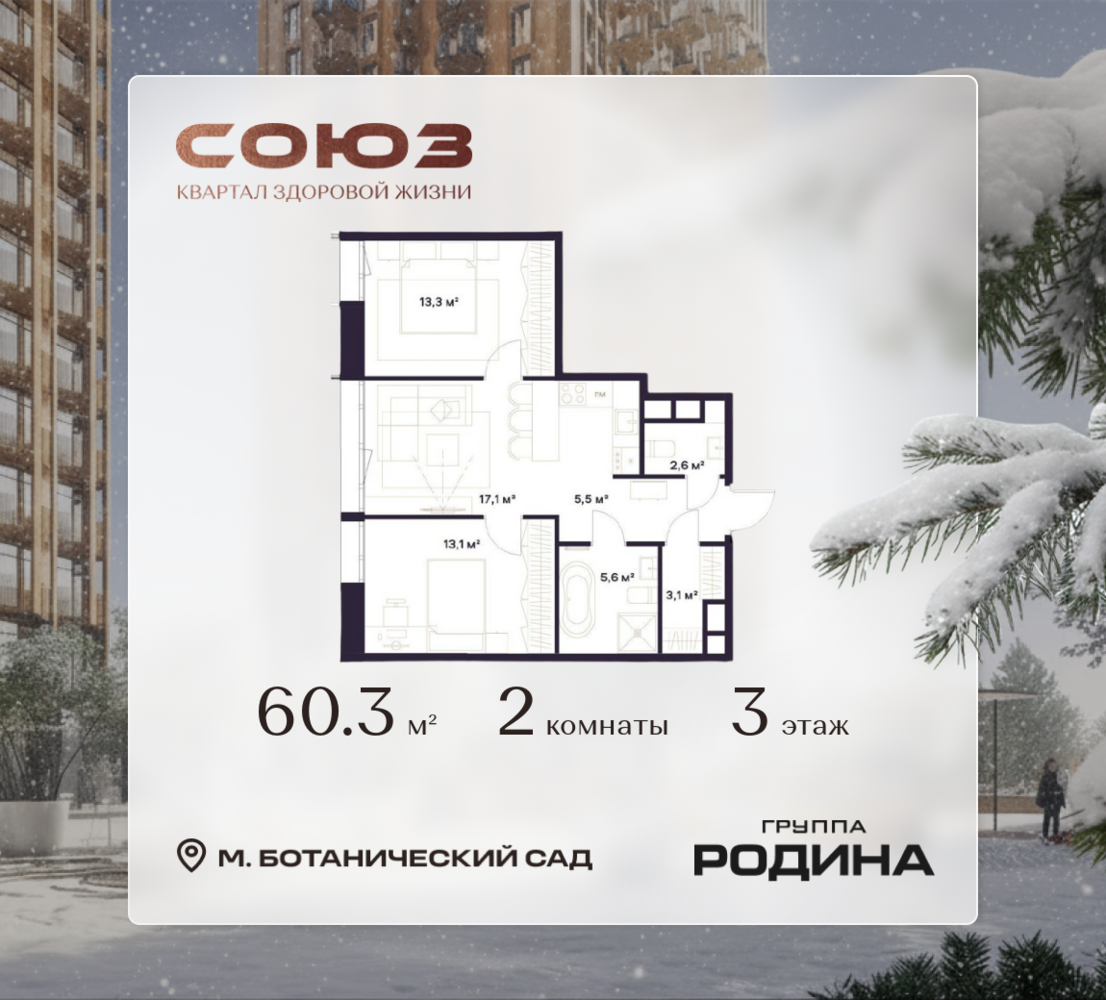 Рассрочка 0% <p> </p> Продаётся 2-комнатная квартира площадью 60.3 м² на 3 этаже в Жилом Комплексе «Союз». <p> </p> Квартал здоровой жизни премиум-класса с рекордным количеством олимпийских видов спорта: <p> </p> - Ледовая арена для хоккея и фигурного катания, - Футбольные поля для тренировок, - Спортивный зал для фехтования, - Бассейн на 6 дорожек, - Центр единоборств, - 4 крытых площадки для настольного тенниса, - 7 теннисных кортов (крытых и открытых), - 4 крытых площадки для сквоша, - Легкоатлетический стадион, - Площадки для баскетбола и волейбола. <p> </p> <p> </p> Уникальные форматы квартир с мастер-спальнями, приватными террасами, балконами, а также пентхаусы с открыточными видами на город. <p> </p> Все квартиры продаются с отделкой Shell&Core и панорамным остеклением. <p> </p> <p> </p> Расположение <p> </p> Пешком: <p> </p> - 2 мин. до парка «Сад Будущего»; - 6 мин. до ст. м. «Ботанический сад»; - 6 мин. до ст. МЦК «Ботанический сад»; - 6 мин. до парка «Леоновская роща»; <p> </p> <p> </p> На автомобиле: <p> </p> - 2 мин. до СВХ (МСД); - 5 мин. до Проспекта Мира; - 10 мин. до ТТК; - 15 мин. до Садового кольца; - 25 мин. до аэропорта «Шереметьево». <p> </p> <p> </p> Благоустройство <p> </p> - собственная спортивная инфраструктура 7 Га; - зона для пикников; - игровые и спортивные площадки для детей всех возрастов; - розарий, а также сосновые, каштановые и дубовые аллеи; - площадки под открытым небом для занятий спортом и йоги; - игровые комнаты для детей; - лаунж-зона для резидентов; - просторная переговорная для деловых встреч; - премиальный ресторан «Шабада» Сосо Павлиашвили с водными арт-объектами на прогулочной аллее, садом ароматных трав и сценой под открытым небом; - кафе, химчистки, аптеки и супермаркеты рядом с домом. <p> </p> <p> </p> Окружение <p> </p> - 8 парков: Сад Будущего, Леоновская роща, Хуамин, Главный ботанический сад РАН, Шереметьевская дубрава, Останкино, парк спорта «Яуза», пойма реки Яуза и музей-усадьба «Останкино»; - 3 ВУЗа: ВГИК, РГСУ, МГПУ; - 12 школ, в том числе: школа 1499 им. И.А. Докукина (топ 100), Brookes Moscow, IThub школа; - 18 детских садов, в том числе билингвальный ALERTUM KIDS; - один из крупнейших океанариумов Европы «Москвариум»; - один из крупнейших в Европе торгово-развлекательных центров «Европолис».