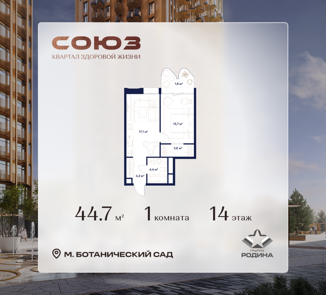 Рассрочка 0% <p> </p> Продаётся 1-комнатная квартира площадью 44.7 м² на 14 этаже в Жилом Комплексе «Союз». <p> </p> Квартал здоровой жизни премиум-класса с рекордным количеством олимпийских видов спорта: <p> </p> - Ледовая арена для хоккея и фигурного катания, - Футбольные поля для тренировок, - Спортивный зал для фехтования, - Бассейн на 6 дорожек, - Центр единоборств, - 4 крытых площадки для настольного тенниса, - 7 теннисных кортов (крытых и открытых), - 4 крытых площадки для сквоша, - Легкоатлетический стадион, - Площадки для баскетбола и волейбола. <p> </p> <p> </p> Уникальные форматы квартир с мастер-спальнями, приватными террасами, балконами, а также пентхаусы с открыточными видами на город. <p> </p> Все квартиры продаются с отделкой Shell&Core и панорамным остеклением. <p> </p> <p> </p> Расположение <p> </p> Пешком: <p> </p> - 2 мин. до парка «Сад Будущего»; - 6 мин. до ст. м. «Ботанический сад»; - 6 мин. до ст. МЦК «Ботанический сад»; - 6 мин. до парка «Леоновская роща»; <p> </p> <p> </p> На автомобиле: <p> </p> - 2 мин. до СВХ (МСД); - 5 мин. до Проспекта Мира; - 10 мин. до ТТК; - 15 мин. до Садового кольца; - 25 мин. до аэропорта «Шереметьево». <p> </p> <p> </p> Благоустройство <p> </p> - собственная спортивная инфраструктура 7 Га; - зона для пикников; - игровые и спортивные площадки для детей всех возрастов; - розарий, а также сосновые, каштановые и дубовые аллеи; - площадки под открытым небом для занятий спортом и йоги; - игровые комнаты для детей; - лаунж-зона для резидентов; - просторная переговорная для деловых встреч; - премиальный ресторан «Шабада» Сосо Павлиашвили с водными арт-объектами на прогулочной аллее, садом ароматных трав и сценой под открытым небом; - кафе, химчистки, аптеки и супермаркеты рядом с домом. <p> </p> <p> </p> Окружение <p> </p> - 8 парков: Сад Будущего, Леоновская роща, Хуамин, Главный ботанический сад РАН, Шереметьевская дубрава, Останкино, парк спорта «Яуза», пойма реки Яуза и музей-усадьба «Останкино»; - 3 ВУЗа: ВГИК, РГСУ, МГПУ; - 12 школ, в том числе: школа 1499 им. И.А. Докукина (топ 100), Brookes Moscow, IThub школа; - 18 детских садов, в том числе билингвальный ALERTUM KIDS; - один из крупнейших океанариумов Европы «Москвариум»; - один из крупнейших в Европе торгово-развлекательных центров «Европолис».
