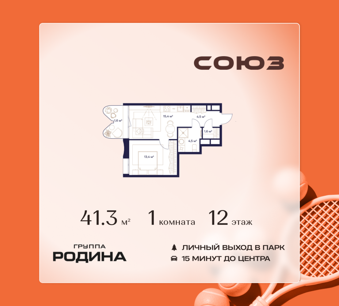 Готовые дома и ключи в день покупки <p> </p> Рассрочка 0% <p> </p> Продаётся 1-комнатная квартира площадью 41.3 м² на 12 этаже в Жилом Комплексе «Союз». <p> </p> Квартал здоровой жизни премиум-класса с рекордным количеством олимпийских видов спорта: <p> </p> - Ледовая арена для хоккея и фигурного катания, - Футбольные поля для тренировок, - Спортивный зал для фехтования, - Бассейн на 6 дорожек, - Центр единоборств, - 4 крытых площадки для настольного тенниса, - 7 теннисных кортов (крытых и открытых), - 4 крытых площадки для сквоша, - Легкоатлетический стадион, - Площадки для баскетбола и волейбола. <p> </p> <p> </p> Уникальные форматы квартир с мастер-спальнями, приватными террасами, балконами, а также пентхаусы с открыточными видами на город. <p> </p> Все квартиры продаются с отделкой Shell&Core и панорамным остеклением. <p> </p> <p> </p> Расположение <p> </p> Пешком: <p> </p> - 2 мин. до парка «Сад Будущего»; - 6 мин. до ст. м. «Ботанический сад»; - 6 мин. до ст. МЦК «Ботанический сад»; - 6 мин. до парка «Леоновская роща»; <p> </p> <p> </p> На автомобиле: <p> </p> - 2 мин. до СВХ (МСД); - 5 мин. до Проспекта Мира; - 10 мин. до ТТК; - 15 мин. до Садового кольца; - 25 мин. до аэропорта «Шереметьево». <p> </p> <p> </p> Благоустройство <p> </p> - собственная спортивная инфраструктура 7 Га; - зона для пикников; - игровые и спортивные площадки для детей всех возрастов; - розарий, а также сосновые, каштановые и дубовые аллеи; - площадки под открытым небом для занятий спортом и йоги; - игровые комнаты для детей; - лаунж-зона для резидентов; - просторная переговорная для деловых встреч; - премиальный ресторан «Шабада» Сосо Павлиашвили с водными арт-объектами на прогулочной аллее, садом ароматных трав и сценой под открытым небом; - кафе, химчистки, аптеки и супермаркеты рядом с домом. <p> </p> <p> </p> Окружение <p> </p> - 8 парков: Сад Будущего, Леоновская роща, Хуамин, Главный ботанический сад РАН, Шереметьевская дубрава, Останкино, парк спорта «Яуза», пойма реки Яуза и музей-усадьба «Останкино»; - 3 ВУЗа: ВГИК, РГСУ, МГПУ; - 12 школ, в том числе: школа 1499 им. И.А. Докукина (топ 100), Brookes Moscow, IThub школа; - 18 детских садов, в том числе билингвальный ALERTUM KIDS; - один из крупнейших океанариумов Европы «Москвариум»; - один из крупнейших в Европе торгово-развлекательных центров «Европолис».