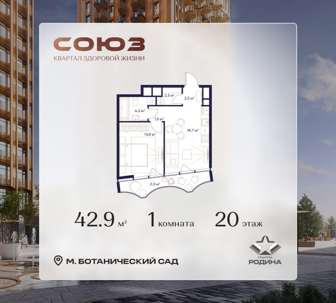 Рассрочка 0% <p> </p> Продаётся 1-комнатная квартира площадью 42.9 м² на 20 этаже в Жилом Комплексе «Союз». <p> </p> Квартал здоровой жизни премиум-класса с рекордным количеством олимпийских видов спорта: <p> </p> - Ледовая арена для хоккея и фигурного катания, - Футбольные поля для тренировок, - Спортивный зал для фехтования, - Бассейн на 6 дорожек, - Центр единоборств, - 4 крытых площадки для настольного тенниса, - 7 теннисных кортов (крытых и открытых), - 4 крытых площадки для сквоша, - Легкоатлетический стадион, - Площадки для баскетбола и волейбола. <p> </p> <p> </p> Уникальные форматы квартир с мастер-спальнями, приватными террасами, балконами, а также пентхаусы с открыточными видами на город. <p> </p> Все квартиры продаются с отделкой Shell&Core и панорамным остеклением. <p> </p> <p> </p> Расположение <p> </p> Пешком: <p> </p> - 2 мин. до парка «Сад Будущего»; - 6 мин. до ст. м. «Ботанический сад»; - 6 мин. до ст. МЦК «Ботанический сад»; - 6 мин. до парка «Леоновская роща»; <p> </p> <p> </p> На автомобиле: <p> </p> - 2 мин. до СВХ (МСД); - 5 мин. до Проспекта Мира; - 10 мин. до ТТК; - 15 мин. до Садового кольца; - 25 мин. до аэропорта «Шереметьево». <p> </p> <p> </p> Благоустройство <p> </p> - собственная спортивная инфраструктура 7 Га; - зона для пикников; - игровые и спортивные площадки для детей всех возрастов; - розарий, а также сосновые, каштановые и дубовые аллеи; - площадки под открытым небом для занятий спортом и йоги; - игровые комнаты для детей; - лаунж-зона для резидентов; - просторная переговорная для деловых встреч; - премиальный ресторан «Шабада» Сосо Павлиашвили с водными арт-объектами на прогулочной аллее, садом ароматных трав и сценой под открытым небом; - кафе, химчистки, аптеки и супермаркеты рядом с домом. <p> </p> <p> </p> Окружение <p> </p> - 8 парков: Сад Будущего, Леоновская роща, Хуамин, Главный ботанический сад РАН, Шереметьевская дубрава, Останкино, парк спорта «Яуза», пойма реки Яуза и музей-усадьба «Останкино»; - 3 ВУЗа: ВГИК, РГСУ, МГПУ; - 12 школ, в том числе: школа 1499 им. И.А. Докукина (топ 100), Brookes Moscow, IThub школа; - 18 детских садов, в том числе билингвальный ALERTUM KIDS; - один из крупнейших океанариумов Европы «Москвариум»; - один из крупнейших в Европе торгово-развлекательных центров «Европолис».