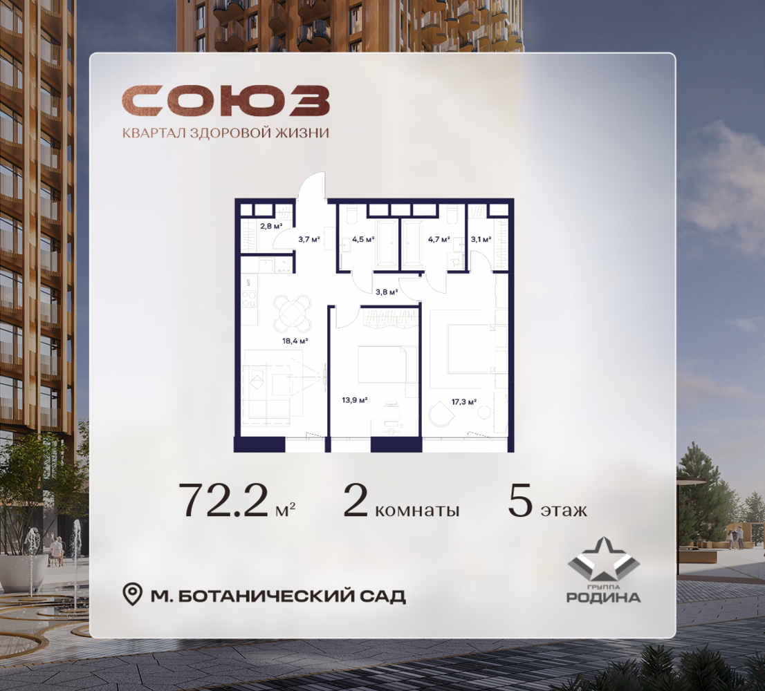 Рассрочка 0% <p> </p> Продаётся 2-комнатная квартира площадью 72.2 м² на 5 этаже в Жилом Комплексе «Союз». <p> </p> Квартал здоровой жизни премиум-класса с рекордным количеством олимпийских видов спорта: <p> </p> - Ледовая арена для хоккея и фигурного катания, - Футбольные поля для тренировок, - Спортивный зал для фехтования, - Бассейн на 6 дорожек, - Центр единоборств, - 4 крытых площадки для настольного тенниса, - 7 теннисных кортов (крытых и открытых), - 4 крытых площадки для сквоша, - Легкоатлетический стадион, - Площадки для баскетбола и волейбола. <p> </p> <p> </p> Уникальные форматы квартир с мастер-спальнями, приватными террасами, балконами, а также пентхаусы с открыточными видами на город. <p> </p> Все квартиры продаются с отделкой Shell&Core и панорамным остеклением. <p> </p> <p> </p> Расположение <p> </p> Пешком: <p> </p> - 2 мин. до парка «Сад Будущего»; - 6 мин. до ст. м. «Ботанический сад»; - 6 мин. до ст. МЦК «Ботанический сад»; - 6 мин. до парка «Леоновская роща»; <p> </p> <p> </p> На автомобиле: <p> </p> - 2 мин. до СВХ (МСД); - 5 мин. до Проспекта Мира; - 10 мин. до ТТК; - 15 мин. до Садового кольца; - 25 мин. до аэропорта «Шереметьево». <p> </p> <p> </p> Благоустройство <p> </p> - собственная спортивная инфраструктура 7 Га; - зона для пикников; - игровые и спортивные площадки для детей всех возрастов; - розарий, а также сосновые, каштановые и дубовые аллеи; - площадки под открытым небом для занятий спортом и йоги; - игровые комнаты для детей; - лаунж-зона для резидентов; - просторная переговорная для деловых встреч; - премиальный ресторан «Шабада» Сосо Павлиашвили с водными арт-объектами на прогулочной аллее, садом ароматных трав и сценой под открытым небом; - кафе, химчистки, аптеки и супермаркеты рядом с домом. <p> </p> <p> </p> Окружение <p> </p> - 8 парков: Сад Будущего, Леоновская роща, Хуамин, Главный ботанический сад РАН, Шереметьевская дубрава, Останкино, парк спорта «Яуза», пойма реки Яуза и музей-усадьба «Останкино»; - 3 ВУЗа: ВГИК, РГСУ, МГПУ; - 12 школ, в том числе: школа 1499 им. И.А. Докукина (топ 100), Brookes Moscow, IThub школа; - 18 детских садов, в том числе билингвальный ALERTUM KIDS; - один из крупнейших океанариумов Европы «Москвариум»; - один из крупнейших в Европе торгово-развлекательных центров «Европолис».