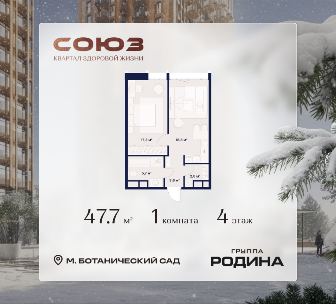 Рассрочка 0% <p> </p> Продаётся 1-комнатная квартира площадью 47.7 м² на 4 этаже в Жилом Комплексе «Союз». <p> </p> Квартал здоровой жизни премиум-класса с рекордным количеством олимпийских видов спорта: <p> </p> - Ледовая арена для хоккея и фигурного катания, - Футбольные поля для тренировок, - Спортивный зал для фехтования, - Бассейн на 6 дорожек, - Центр единоборств, - 4 крытых площадки для настольного тенниса, - 7 теннисных кортов (крытых и открытых), - 4 крытых площадки для сквоша, - Легкоатлетический стадион, - Площадки для баскетбола и волейбола. <p> </p> <p> </p> Уникальные форматы квартир с мастер-спальнями, приватными террасами, балконами, а также пентхаусы с открыточными видами на город. <p> </p> Все квартиры продаются с отделкой Shell&Core и панорамным остеклением. <p> </p> <p> </p> Расположение <p> </p> Пешком: <p> </p> - 2 мин. до парка «Сад Будущего»; - 6 мин. до ст. м. «Ботанический сад»; - 6 мин. до ст. МЦК «Ботанический сад»; - 6 мин. до парка «Леоновская роща»; <p> </p> <p> </p> На автомобиле: <p> </p> - 2 мин. до СВХ (МСД); - 5 мин. до Проспекта Мира; - 10 мин. до ТТК; - 15 мин. до Садового кольца; - 25 мин. до аэропорта «Шереметьево». <p> </p> <p> </p> Благоустройство <p> </p> - собственная спортивная инфраструктура 7 Га; - зона для пикников; - игровые и спортивные площадки для детей всех возрастов; - розарий, а также сосновые, каштановые и дубовые аллеи; - площадки под открытым небом для занятий спортом и йоги; - игровые комнаты для детей; - лаунж-зона для резидентов; - просторная переговорная для деловых встреч; - премиальный ресторан «Шабада» Сосо Павлиашвили с водными арт-объектами на прогулочной аллее, садом ароматных трав и сценой под открытым небом; - кафе, химчистки, аптеки и супермаркеты рядом с домом. <p> </p> <p> </p> Окружение <p> </p> - 8 парков: Сад Будущего, Леоновская роща, Хуамин, Главный ботанический сад РАН, Шереметьевская дубрава, Останкино, парк спорта «Яуза», пойма реки Яуза и музей-усадьба «Останкино»; - 3 ВУЗа: ВГИК, РГСУ, МГПУ; - 12 школ, в том числе: школа 1499 им. И.А. Докукина (топ 100), Brookes Moscow, IThub школа; - 18 детских садов, в том числе билингвальный ALERTUM KIDS; - один из крупнейших океанариумов Европы «Москвариум»; - один из крупнейших в Европе торгово-развлекательных центров «Европолис».