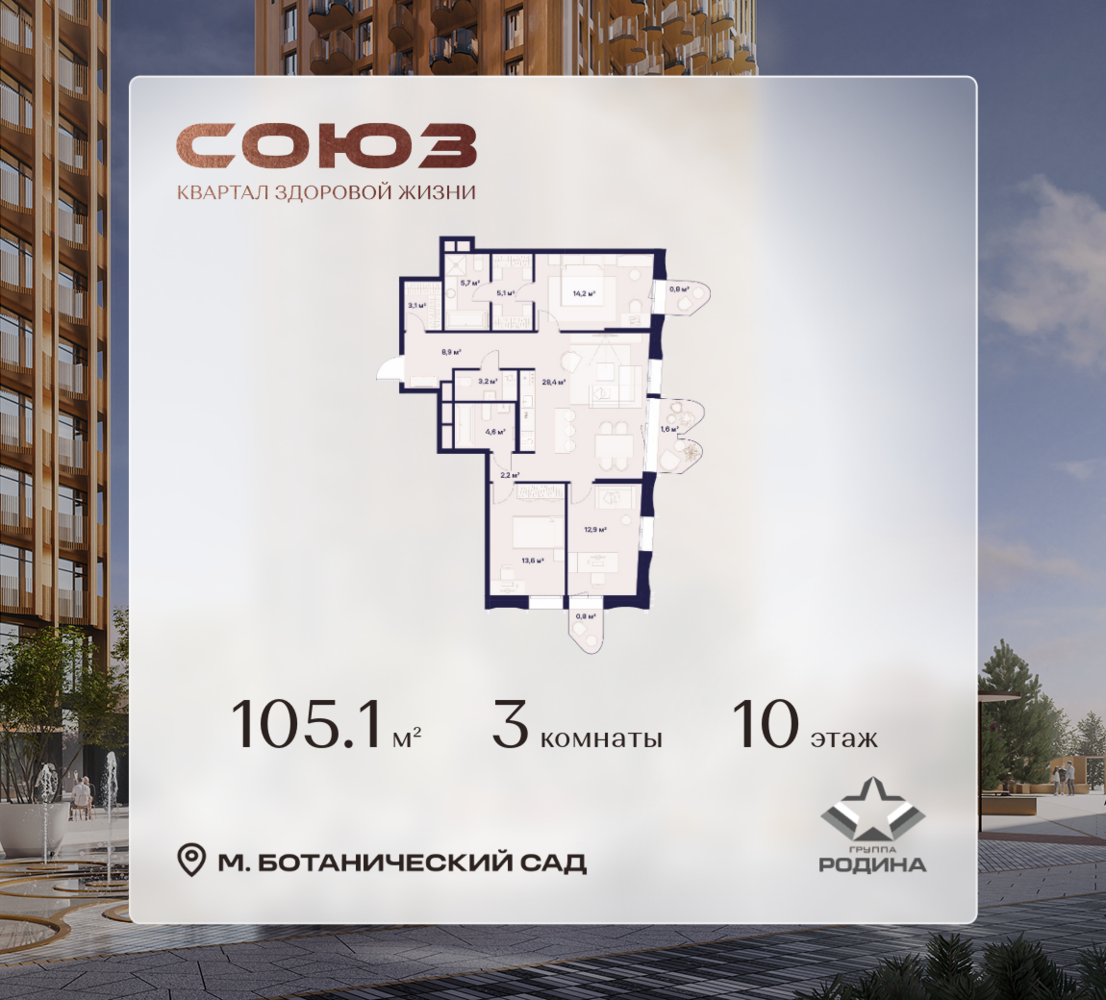 Рассрочка 0% <p> </p> Продаётся 3-комнатная квартира площадью 105.1 м² на 10 этаже в Жилом Комплексе «Союз». <p> </p> Квартал здоровой жизни премиум-класса с рекордным количеством олимпийских видов спорта: <p> </p> - Ледовая арена для хоккея и фигурного катания, - Футбольные поля для тренировок, - Спортивный зал для фехтования, - Бассейн на 6 дорожек, - Центр единоборств, - 4 крытых площадки для настольного тенниса, - 7 теннисных кортов (крытых и открытых), - 4 крытых площадки для сквоша, - Легкоатлетический стадион, - Площадки для баскетбола и волейбола. <p> </p> <p> </p> Уникальные форматы квартир с мастер-спальнями, приватными террасами, балконами, а также пентхаусы с открыточными видами на город. <p> </p> Все квартиры продаются с отделкой Shell&Core и панорамным остеклением. <p> </p> <p> </p> Расположение <p> </p> Пешком: <p> </p> - 2 мин. до парка «Сад Будущего»; - 6 мин. до ст. м. «Ботанический сад»; - 6 мин. до ст. МЦК «Ботанический сад»; - 6 мин. до парка «Леоновская роща»; <p> </p> <p> </p> На автомобиле: <p> </p> - 2 мин. до СВХ (МСД); - 5 мин. до Проспекта Мира; - 10 мин. до ТТК; - 15 мин. до Садового кольца; - 25 мин. до аэропорта «Шереметьево». <p> </p> <p> </p> Благоустройство <p> </p> - собственная спортивная инфраструктура 7 Га; - зона для пикников; - игровые и спортивные площадки для детей всех возрастов; - розарий, а также сосновые, каштановые и дубовые аллеи; - площадки под открытым небом для занятий спортом и йоги; - игровые комнаты для детей; - лаунж-зона для резидентов; - просторная переговорная для деловых встреч; - премиальный ресторан «Шабада» Сосо Павлиашвили с водными арт-объектами на прогулочной аллее, садом ароматных трав и сценой под открытым небом; - кафе, химчистки, аптеки и супермаркеты рядом с домом. <p> </p> <p> </p> Окружение <p> </p> - 8 парков: Сад Будущего, Леоновская роща, Хуамин, Главный ботанический сад РАН, Шереметьевская дубрава, Останкино, парк спорта «Яуза», пойма реки Яуза и музей-усадьба «Останкино»; - 3 ВУЗа: ВГИК, РГСУ, МГПУ; - 12 школ, в том числе: школа 1499 им. И.А. Докукина (топ 100), Brookes Moscow, IThub школа; - 18 детских садов, в том числе билингвальный ALERTUM KIDS; - один из крупнейших океанариумов Европы «Москвариум»; - один из крупнейших в Европе торгово-развлекательных центров «Европолис».