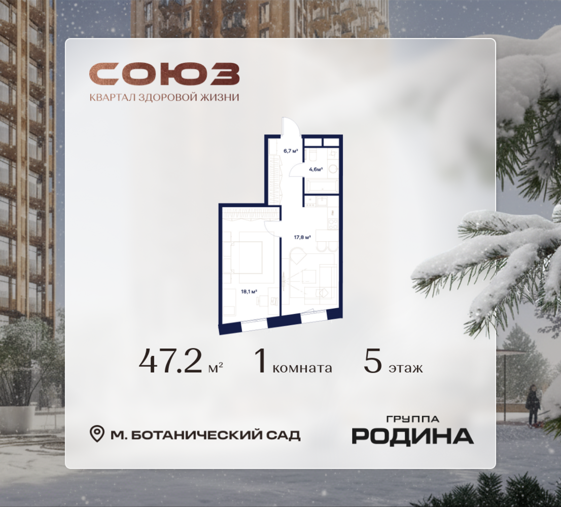 Рассрочка 0% <p> </p> Продаётся 1-комнатная квартира площадью 47.2 м² на 5 этаже в Жилом Комплексе «Союз». <p> </p> Квартал здоровой жизни премиум-класса с рекордным количеством олимпийских видов спорта: <p> </p> - Ледовая арена для хоккея и фигурного катания, - Футбольные поля для тренировок, - Спортивный зал для фехтования, - Бассейн на 6 дорожек, - Центр единоборств, - 4 крытых площадки для настольного тенниса, - 7 теннисных кортов (крытых и открытых), - 4 крытых площадки для сквоша, - Легкоатлетический стадион, - Площадки для баскетбола и волейбола. <p> </p> <p> </p> Уникальные форматы квартир с мастер-спальнями, приватными террасами, балконами, а также пентхаусы с открыточными видами на город. <p> </p> Все квартиры продаются с отделкой Shell&Core и панорамным остеклением. <p> </p> <p> </p> Расположение <p> </p> Пешком: <p> </p> - 2 мин. до парка «Сад Будущего»; - 6 мин. до ст. м. «Ботанический сад»; - 6 мин. до ст. МЦК «Ботанический сад»; - 6 мин. до парка «Леоновская роща»; <p> </p> <p> </p> На автомобиле: <p> </p> - 2 мин. до СВХ (МСД); - 5 мин. до Проспекта Мира; - 10 мин. до ТТК; - 15 мин. до Садового кольца; - 25 мин. до аэропорта «Шереметьево». <p> </p> <p> </p> Благоустройство <p> </p> - собственная спортивная инфраструктура 7 Га; - зона для пикников; - игровые и спортивные площадки для детей всех возрастов; - розарий, а также сосновые, каштановые и дубовые аллеи; - площадки под открытым небом для занятий спортом и йоги; - игровые комнаты для детей; - лаунж-зона для резидентов; - просторная переговорная для деловых встреч; - премиальный ресторан «Шабада» Сосо Павлиашвили с водными арт-объектами на прогулочной аллее, садом ароматных трав и сценой под открытым небом; - кафе, химчистки, аптеки и супермаркеты рядом с домом. <p> </p> <p> </p> Окружение <p> </p> - 8 парков: Сад Будущего, Леоновская роща, Хуамин, Главный ботанический сад РАН, Шереметьевская дубрава, Останкино, парк спорта «Яуза», пойма реки Яуза и музей-усадьба «Останкино»; - 3 ВУЗа: ВГИК, РГСУ, МГПУ; - 12 школ, в том числе: школа 1499 им. И.А. Докукина (топ 100), Brookes Moscow, IThub школа; - 18 детских садов, в том числе билингвальный ALERTUM KIDS; - один из крупнейших океанариумов Европы «Москвариум»; - один из крупнейших в Европе торгово-развлекательных центров «Европолис».