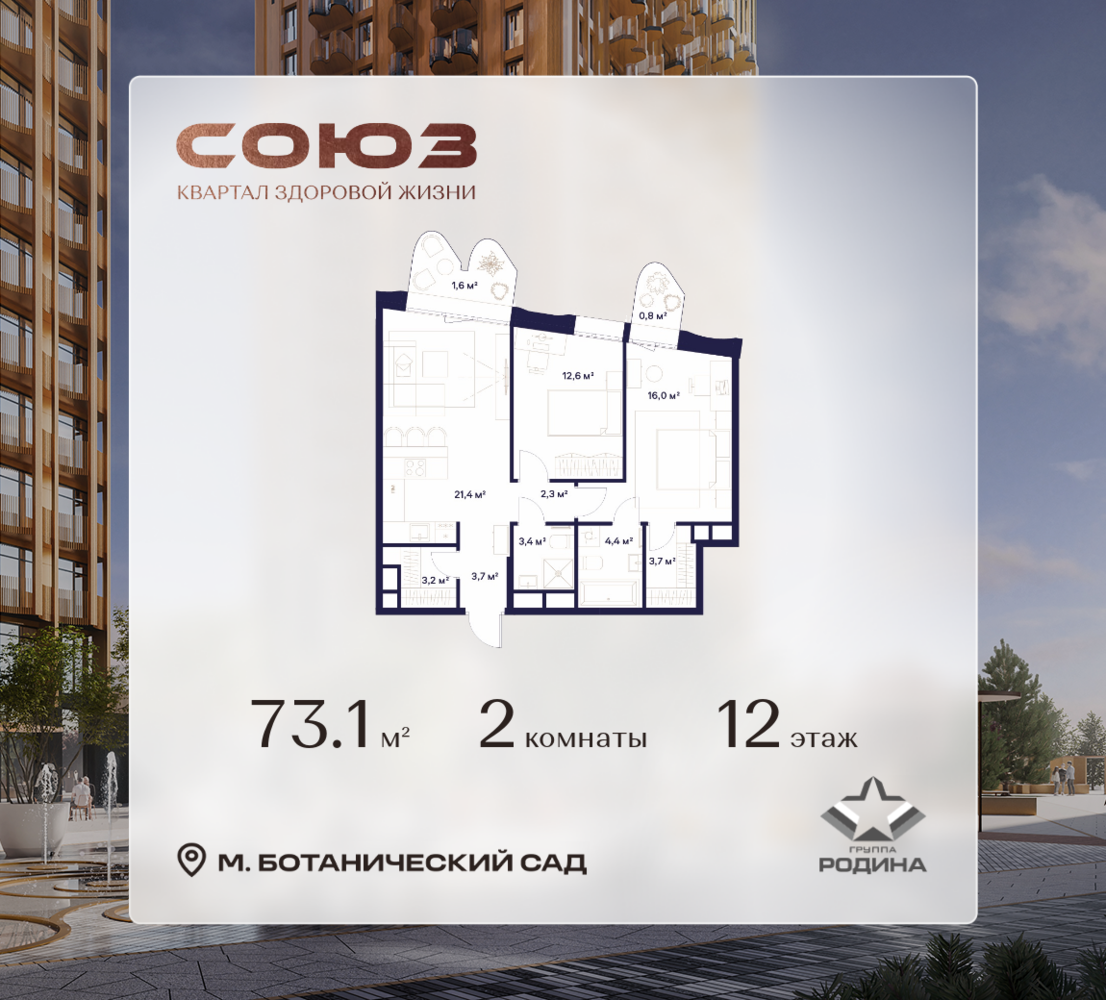 Рассрочка 0% <p> </p> Продаётся 2-комнатная квартира площадью 73.1 м² на 12 этаже в Жилом Комплексе «Союз». <p> </p> Квартал здоровой жизни премиум-класса с рекордным количеством олимпийских видов спорта: <p> </p> - Ледовая арена для хоккея и фигурного катания, - Футбольные поля для тренировок, - Спортивный зал для фехтования, - Бассейн на 6 дорожек, - Центр единоборств, - 4 крытых площадки для настольного тенниса, - 7 теннисных кортов (крытых и открытых), - 4 крытых площадки для сквоша, - Легкоатлетический стадион, - Площадки для баскетбола и волейбола. <p> </p> <p> </p> Уникальные форматы квартир с мастер-спальнями, приватными террасами, балконами, а также пентхаусы с открыточными видами на город. <p> </p> Все квартиры продаются с отделкой Shell&Core и панорамным остеклением. <p> </p> <p> </p> Расположение <p> </p> Пешком: <p> </p> - 2 мин. до парка «Сад Будущего»; - 6 мин. до ст. м. «Ботанический сад»; - 6 мин. до ст. МЦК «Ботанический сад»; - 6 мин. до парка «Леоновская роща»; <p> </p> <p> </p> На автомобиле: <p> </p> - 2 мин. до СВХ (МСД); - 5 мин. до Проспекта Мира; - 10 мин. до ТТК; - 15 мин. до Садового кольца; - 25 мин. до аэропорта «Шереметьево». <p> </p> <p> </p> Благоустройство <p> </p> - собственная спортивная инфраструктура 7 Га; - зона для пикников; - игровые и спортивные площадки для детей всех возрастов; - розарий, а также сосновые, каштановые и дубовые аллеи; - площадки под открытым небом для занятий спортом и йоги; - игровые комнаты для детей; - лаунж-зона для резидентов; - просторная переговорная для деловых встреч; - премиальный ресторан «Шабада» Сосо Павлиашвили с водными арт-объектами на прогулочной аллее, садом ароматных трав и сценой под открытым небом; - кафе, химчистки, аптеки и супермаркеты рядом с домом. <p> </p> <p> </p> Окружение <p> </p> - 8 парков: Сад Будущего, Леоновская роща, Хуамин, Главный ботанический сад РАН, Шереметьевская дубрава, Останкино, парк спорта «Яуза», пойма реки Яуза и музей-усадьба «Останкино»; - 3 ВУЗа: ВГИК, РГСУ, МГПУ; - 12 школ, в том числе: школа 1499 им. И.А. Докукина (топ 100), Brookes Moscow, IThub школа; - 18 детских садов, в том числе билингвальный ALERTUM KIDS; - один из крупнейших океанариумов Европы «Москвариум»; - один из крупнейших в Европе торгово-развлекательных центров «Европолис».
