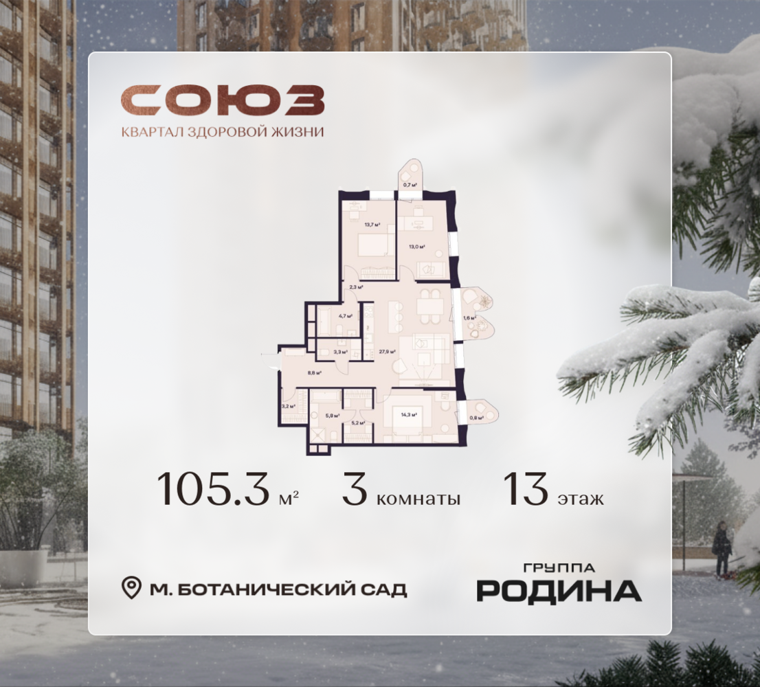 Рассрочка 0% <p> </p> Продаётся 3-комнатная квартира площадью 105.3 м² на 13 этаже в Жилом Комплексе «Союз». <p> </p> Квартал здоровой жизни премиум-класса с рекордным количеством олимпийских видов спорта: <p> </p> - Ледовая арена для хоккея и фигурного катания, - Футбольные поля для тренировок, - Спортивный зал для фехтования, - Бассейн на 6 дорожек, - Центр единоборств, - 4 крытых площадки для настольного тенниса, - 7 теннисных кортов (крытых и открытых), - 4 крытых площадки для сквоша, - Легкоатлетический стадион, - Площадки для баскетбола и волейбола. <p> </p> <p> </p> Уникальные форматы квартир с мастер-спальнями, приватными террасами, балконами, а также пентхаусы с открыточными видами на город. <p> </p> Все квартиры продаются с отделкой Shell&Core и панорамным остеклением. <p> </p> <p> </p> Расположение <p> </p> Пешком: <p> </p> - 2 мин. до парка «Сад Будущего»; - 6 мин. до ст. м. «Ботанический сад»; - 6 мин. до ст. МЦК «Ботанический сад»; - 6 мин. до парка «Леоновская роща»; <p> </p> <p> </p> На автомобиле: <p> </p> - 2 мин. до СВХ (МСД); - 5 мин. до Проспекта Мира; - 10 мин. до ТТК; - 15 мин. до Садового кольца; - 25 мин. до аэропорта «Шереметьево». <p> </p> <p> </p> Благоустройство <p> </p> - собственная спортивная инфраструктура 7 Га; - зона для пикников; - игровые и спортивные площадки для детей всех возрастов; - розарий, а также сосновые, каштановые и дубовые аллеи; - площадки под открытым небом для занятий спортом и йоги; - игровые комнаты для детей; - лаунж-зона для резидентов; - просторная переговорная для деловых встреч; - премиальный ресторан «Шабада» Сосо Павлиашвили с водными арт-объектами на прогулочной аллее, садом ароматных трав и сценой под открытым небом; - кафе, химчистки, аптеки и супермаркеты рядом с домом. <p> </p> <p> </p> Окружение <p> </p> - 8 парков: Сад Будущего, Леоновская роща, Хуамин, Главный ботанический сад РАН, Шереметьевская дубрава, Останкино, парк спорта «Яуза», пойма реки Яуза и музей-усадьба «Останкино»; - 3 ВУЗа: ВГИК, РГСУ, МГПУ; - 12 школ, в том числе: школа 1499 им. И.А. Докукина (топ 100), Brookes Moscow, IThub школа; - 18 детских садов, в том числе билингвальный ALERTUM KIDS; - один из крупнейших океанариумов Европы «Москвариум»; - один из крупнейших в Европе торгово-развлекательных центров «Европолис».