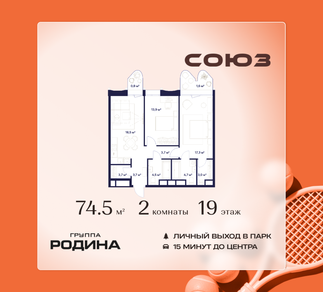Рассрочка 0% <p> </p> Продаётся 2-комнатная квартира площадью 74.5 м² на 19 этаже в Жилом Комплексе «Союз». <p> </p> Квартал здоровой жизни премиум-класса с рекордным количеством олимпийских видов спорта: <p> </p> - Ледовая арена для хоккея и фигурного катания, - Футбольные поля для тренировок, - Спортивный зал для фехтования, - Бассейн на 6 дорожек, - Центр единоборств, - 4 крытых площадки для настольного тенниса, - 7 теннисных кортов (крытых и открытых), - 4 крытых площадки для сквоша, - Легкоатлетический стадион, - Площадки для баскетбола и волейбола. <p> </p> <p> </p> Уникальные форматы квартир с мастер-спальнями, приватными террасами, балконами, а также пентхаусы с открыточными видами на город. <p> </p> Все квартиры продаются с отделкой Shell&Core и панорамным остеклением. <p> </p> <p> </p> Расположение <p> </p> Пешком: <p> </p> - 2 мин. до парка «Сад Будущего»; - 6 мин. до ст. м. «Ботанический сад»; - 6 мин. до ст. МЦК «Ботанический сад»; - 6 мин. до парка «Леоновская роща»; <p> </p> <p> </p> На автомобиле: <p> </p> - 2 мин. до СВХ (МСД); - 5 мин. до Проспекта Мира; - 10 мин. до ТТК; - 15 мин. до Садового кольца; - 25 мин. до аэропорта «Шереметьево». <p> </p> <p> </p> Благоустройство <p> </p> - собственная спортивная инфраструктура 7 Га; - зона для пикников; - игровые и спортивные площадки для детей всех возрастов; - розарий, а также сосновые, каштановые и дубовые аллеи; - площадки под открытым небом для занятий спортом и йоги; - игровые комнаты для детей; - лаунж-зона для резидентов; - просторная переговорная для деловых встреч; - премиальный ресторан «Шабада» Сосо Павлиашвили с водными арт-объектами на прогулочной аллее, садом ароматных трав и сценой под открытым небом; - кафе, химчистки, аптеки и супермаркеты рядом с домом. <p> </p> <p> </p> Окружение <p> </p> - 8 парков: Сад Будущего, Леоновская роща, Хуамин, Главный ботанический сад РАН, Шереметьевская дубрава, Останкино, парк спорта «Яуза», пойма реки Яуза и музей-усадьба «Останкино»; - 3 ВУЗа: ВГИК, РГСУ, МГПУ; - 12 школ, в том числе: школа 1499 им. И.А. Докукина (топ 100), Brookes Moscow, IThub школа; - 18 детских садов, в том числе билингвальный ALERTUM KIDS; - один из крупнейших океанариумов Европы «Москвариум»; - один из крупнейших в Европе торгово-развлекательных центров «Европолис».
