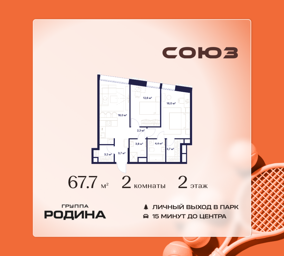 Рассрочка 0% <p> </p> Продаётся 2-комнатная квартира площадью 67.7 м² на 2 этаже в Жилом Комплексе «Союз». <p> </p> Квартал здоровой жизни премиум-класса с рекордным количеством олимпийских видов спорта: <p> </p> - Ледовая арена для хоккея и фигурного катания, - Футбольные поля для тренировок, - Спортивный зал для фехтования, - Бассейн на 6 дорожек, - Центр единоборств, - 4 крытых площадки для настольного тенниса, - 7 теннисных кортов (крытых и открытых), - 4 крытых площадки для сквоша, - Легкоатлетический стадион, - Площадки для баскетбола и волейбола. <p> </p> <p> </p> Уникальные форматы квартир с мастер-спальнями, приватными террасами, балконами, а также пентхаусы с открыточными видами на город. <p> </p> Все квартиры продаются с отделкой Shell&Core и панорамным остеклением. <p> </p> <p> </p> Расположение <p> </p> Пешком: <p> </p> - 2 мин. до парка «Сад Будущего»; - 6 мин. до ст. м. «Ботанический сад»; - 6 мин. до ст. МЦК «Ботанический сад»; - 6 мин. до парка «Леоновская роща»; <p> </p> <p> </p> На автомобиле: <p> </p> - 2 мин. до СВХ (МСД); - 5 мин. до Проспекта Мира; - 10 мин. до ТТК; - 15 мин. до Садового кольца; - 25 мин. до аэропорта «Шереметьево». <p> </p> <p> </p> Благоустройство <p> </p> - собственная спортивная инфраструктура 7 Га; - зона для пикников; - игровые и спортивные площадки для детей всех возрастов; - розарий, а также сосновые, каштановые и дубовые аллеи; - площадки под открытым небом для занятий спортом и йоги; - игровые комнаты для детей; - лаунж-зона для резидентов; - просторная переговорная для деловых встреч; - премиальный ресторан «Шабада» Сосо Павлиашвили с водными арт-объектами на прогулочной аллее, садом ароматных трав и сценой под открытым небом; - кафе, химчистки, аптеки и супермаркеты рядом с домом. <p> </p> <p> </p> Окружение <p> </p> - 8 парков: Сад Будущего, Леоновская роща, Хуамин, Главный ботанический сад РАН, Шереметьевская дубрава, Останкино, парк спорта «Яуза», пойма реки Яуза и музей-усадьба «Останкино»; - 3 ВУЗа: ВГИК, РГСУ, МГПУ; - 12 школ, в том числе: школа 1499 им. И.А. Докукина (топ 100), Brookes Moscow, IThub школа; - 18 детских садов, в том числе билингвальный ALERTUM KIDS; - один из крупнейших океанариумов Европы «Москвариум»; - один из крупнейших в Европе торгово-развлекательных центров «Европолис».