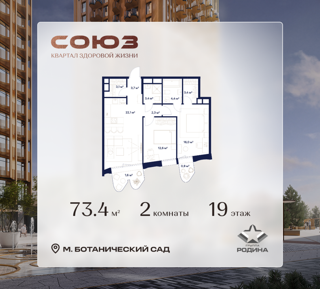 Рассрочка 0% <p> </p> Продаётся 2-комнатная квартира площадью 73.4 м² на 19 этаже в Жилом Комплексе «Союз». <p> </p> Квартал здоровой жизни премиум-класса с рекордным количеством олимпийских видов спорта: <p> </p> - Ледовая арена для хоккея и фигурного катания, - Футбольные поля для тренировок, - Спортивный зал для фехтования, - Бассейн на 6 дорожек, - Центр единоборств, - 4 крытых площадки для настольного тенниса, - 7 теннисных кортов (крытых и открытых), - 4 крытых площадки для сквоша, - Легкоатлетический стадион, - Площадки для баскетбола и волейбола. <p> </p> <p> </p> Уникальные форматы квартир с мастер-спальнями, приватными террасами, балконами, а также пентхаусы с открыточными видами на город. <p> </p> Все квартиры продаются с отделкой Shell&Core и панорамным остеклением. <p> </p> <p> </p> Расположение <p> </p> Пешком: <p> </p> - 2 мин. до парка «Сад Будущего»; - 6 мин. до ст. м. «Ботанический сад»; - 6 мин. до ст. МЦК «Ботанический сад»; - 6 мин. до парка «Леоновская роща»; <p> </p> <p> </p> На автомобиле: <p> </p> - 2 мин. до СВХ (МСД); - 5 мин. до Проспекта Мира; - 10 мин. до ТТК; - 15 мин. до Садового кольца; - 25 мин. до аэропорта «Шереметьево». <p> </p> <p> </p> Благоустройство <p> </p> - собственная спортивная инфраструктура 7 Га; - зона для пикников; - игровые и спортивные площадки для детей всех возрастов; - розарий, а также сосновые, каштановые и дубовые аллеи; - площадки под открытым небом для занятий спортом и йоги; - игровые комнаты для детей; - лаунж-зона для резидентов; - просторная переговорная для деловых встреч; - премиальный ресторан «Шабада» Сосо Павлиашвили с водными арт-объектами на прогулочной аллее, садом ароматных трав и сценой под открытым небом; - кафе, химчистки, аптеки и супермаркеты рядом с домом. <p> </p> <p> </p> Окружение <p> </p> - 8 парков: Сад Будущего, Леоновская роща, Хуамин, Главный ботанический сад РАН, Шереметьевская дубрава, Останкино, парк спорта «Яуза», пойма реки Яуза и музей-усадьба «Останкино»; - 3 ВУЗа: ВГИК, РГСУ, МГПУ; - 12 школ, в том числе: школа 1499 им. И.А. Докукина (топ 100), Brookes Moscow, IThub школа; - 18 детских садов, в том числе билингвальный ALERTUM KIDS; - один из крупнейших океанариумов Европы «Москвариум»; - один из крупнейших в Европе торгово-развлекательных центров «Европолис».