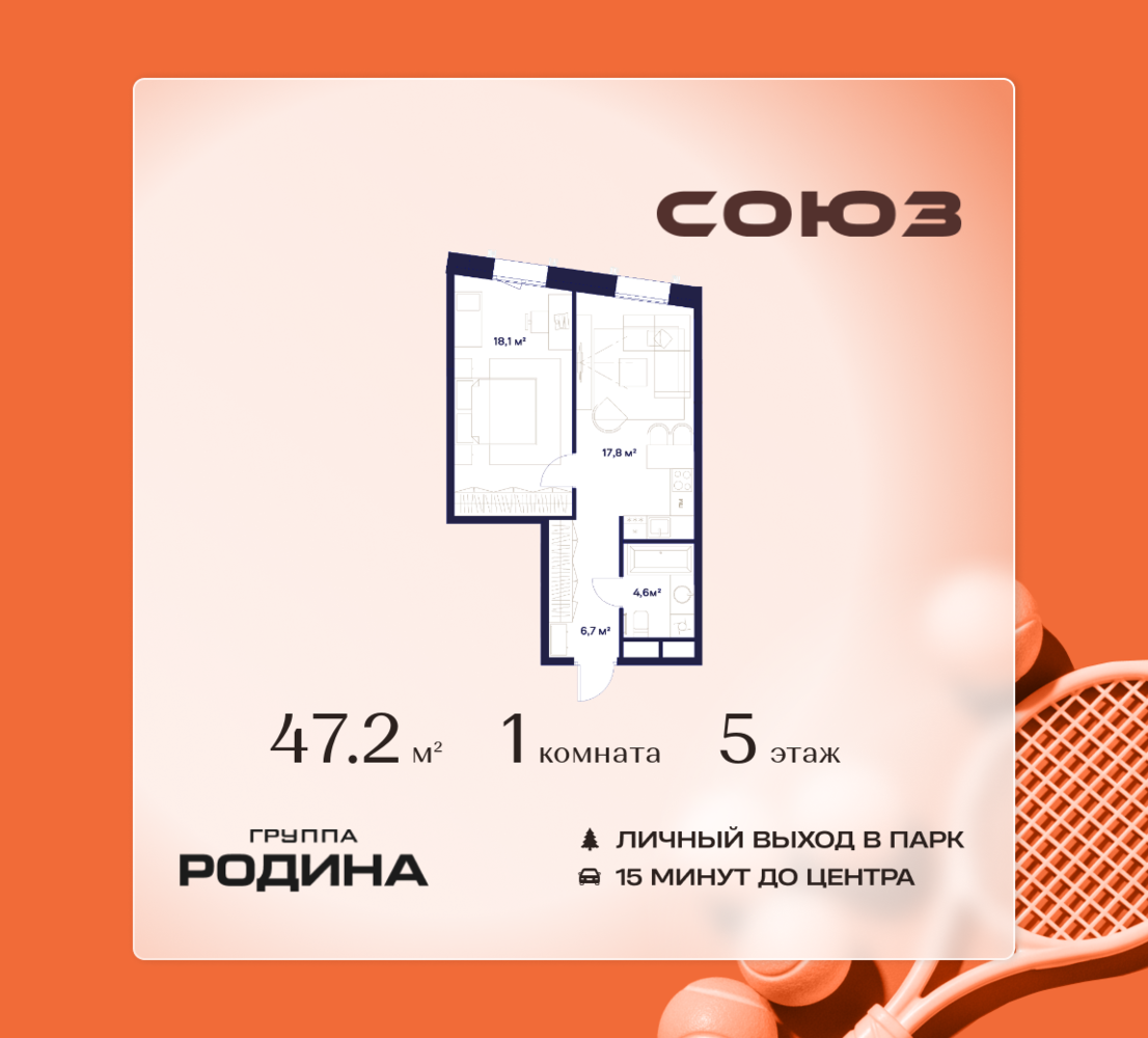 Рассрочка 0% <p> </p> Продаётся 1-комнатная квартира площадью 47.2 м² на 5 этаже в Жилом Комплексе «Союз». <p> </p> Квартал здоровой жизни премиум-класса с рекордным количеством олимпийских видов спорта: <p> </p> - Ледовая арена для хоккея и фигурного катания, - Футбольные поля для тренировок, - Спортивный зал для фехтования, - Бассейн на 6 дорожек, - Центр единоборств, - 4 крытых площадки для настольного тенниса, - 7 теннисных кортов (крытых и открытых), - 4 крытых площадки для сквоша, - Легкоатлетический стадион, - Площадки для баскетбола и волейбола. <p> </p> <p> </p> Уникальные форматы квартир с мастер-спальнями, приватными террасами, балконами, а также пентхаусы с открыточными видами на город. <p> </p> Все квартиры продаются с отделкой Shell&Core и панорамным остеклением. <p> </p> <p> </p> Расположение <p> </p> Пешком: <p> </p> - 2 мин. до парка «Сад Будущего»; - 6 мин. до ст. м. «Ботанический сад»; - 6 мин. до ст. МЦК «Ботанический сад»; - 6 мин. до парка «Леоновская роща»; <p> </p> <p> </p> На автомобиле: <p> </p> - 2 мин. до СВХ (МСД); - 5 мин. до Проспекта Мира; - 10 мин. до ТТК; - 15 мин. до Садового кольца; - 25 мин. до аэропорта «Шереметьево». <p> </p> <p> </p> Благоустройство <p> </p> - собственная спортивная инфраструктура 7 Га; - зона для пикников; - игровые и спортивные площадки для детей всех возрастов; - розарий, а также сосновые, каштановые и дубовые аллеи; - площадки под открытым небом для занятий спортом и йоги; - игровые комнаты для детей; - лаунж-зона для резидентов; - просторная переговорная для деловых встреч; - премиальный ресторан «Шабада» Сосо Павлиашвили с водными арт-объектами на прогулочной аллее, садом ароматных трав и сценой под открытым небом; - кафе, химчистки, аптеки и супермаркеты рядом с домом. <p> </p> <p> </p> Окружение <p> </p> - 8 парков: Сад Будущего, Леоновская роща, Хуамин, Главный ботанический сад РАН, Шереметьевская дубрава, Останкино, парк спорта «Яуза», пойма реки Яуза и музей-усадьба «Останкино»; - 3 ВУЗа: ВГИК, РГСУ, МГПУ; - 12 школ, в том числе: школа 1499 им. И.А. Докукина (топ 100), Brookes Moscow, IThub школа; - 18 детских садов, в том числе билингвальный ALERTUM KIDS; - один из крупнейших океанариумов Европы «Москвариум»; - один из крупнейших в Европе торгово-развлекательных центров «Европолис».