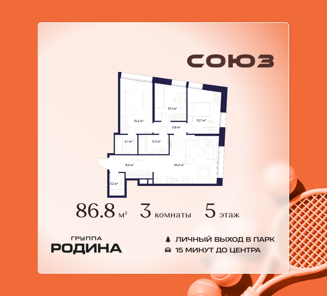 Рассрочка 0% <p> </p> Продаётся 3-комнатная квартира площадью 86.8 м² на 5 этаже в Жилом Комплексе «Союз». <p> </p> Квартал здоровой жизни премиум-класса с рекордным количеством олимпийских видов спорта: <p> </p> - Ледовая арена для хоккея и фигурного катания, - Футбольные поля для тренировок, - Спортивный зал для фехтования, - Бассейн на 6 дорожек, - Центр единоборств, - 4 крытых площадки для настольного тенниса, - 7 теннисных кортов (крытых и открытых), - 4 крытых площадки для сквоша, - Легкоатлетический стадион, - Площадки для баскетбола и волейбола. <p> </p> <p> </p> Уникальные форматы квартир с мастер-спальнями, приватными террасами, балконами, а также пентхаусы с открыточными видами на город. <p> </p> Все квартиры продаются с отделкой Shell&Core и панорамным остеклением. <p> </p> <p> </p> Расположение <p> </p> Пешком: <p> </p> - 2 мин. до парка «Сад Будущего»; - 6 мин. до ст. м. «Ботанический сад»; - 6 мин. до ст. МЦК «Ботанический сад»; - 6 мин. до парка «Леоновская роща»; <p> </p> <p> </p> На автомобиле: <p> </p> - 2 мин. до СВХ (МСД); - 5 мин. до Проспекта Мира; - 10 мин. до ТТК; - 15 мин. до Садового кольца; - 25 мин. до аэропорта «Шереметьево». <p> </p> <p> </p> Благоустройство <p> </p> - собственная спортивная инфраструктура 7 Га; - зона для пикников; - игровые и спортивные площадки для детей всех возрастов; - розарий, а также сосновые, каштановые и дубовые аллеи; - площадки под открытым небом для занятий спортом и йоги; - игровые комнаты для детей; - лаунж-зона для резидентов; - просторная переговорная для деловых встреч; - премиальный ресторан «Шабада» Сосо Павлиашвили с водными арт-объектами на прогулочной аллее, садом ароматных трав и сценой под открытым небом; - кафе, химчистки, аптеки и супермаркеты рядом с домом. <p> </p> <p> </p> Окружение <p> </p> - 8 парков: Сад Будущего, Леоновская роща, Хуамин, Главный ботанический сад РАН, Шереметьевская дубрава, Останкино, парк спорта «Яуза», пойма реки Яуза и музей-усадьба «Останкино»; - 3 ВУЗа: ВГИК, РГСУ, МГПУ; - 12 школ, в том числе: школа 1499 им. И.А. Докукина (топ 100), Brookes Moscow, IThub школа; - 18 детских садов, в том числе билингвальный ALERTUM KIDS; - один из крупнейших океанариумов Европы «Москвариум»; - один из крупнейших в Европе торгово-развлекательных центров «Европолис».