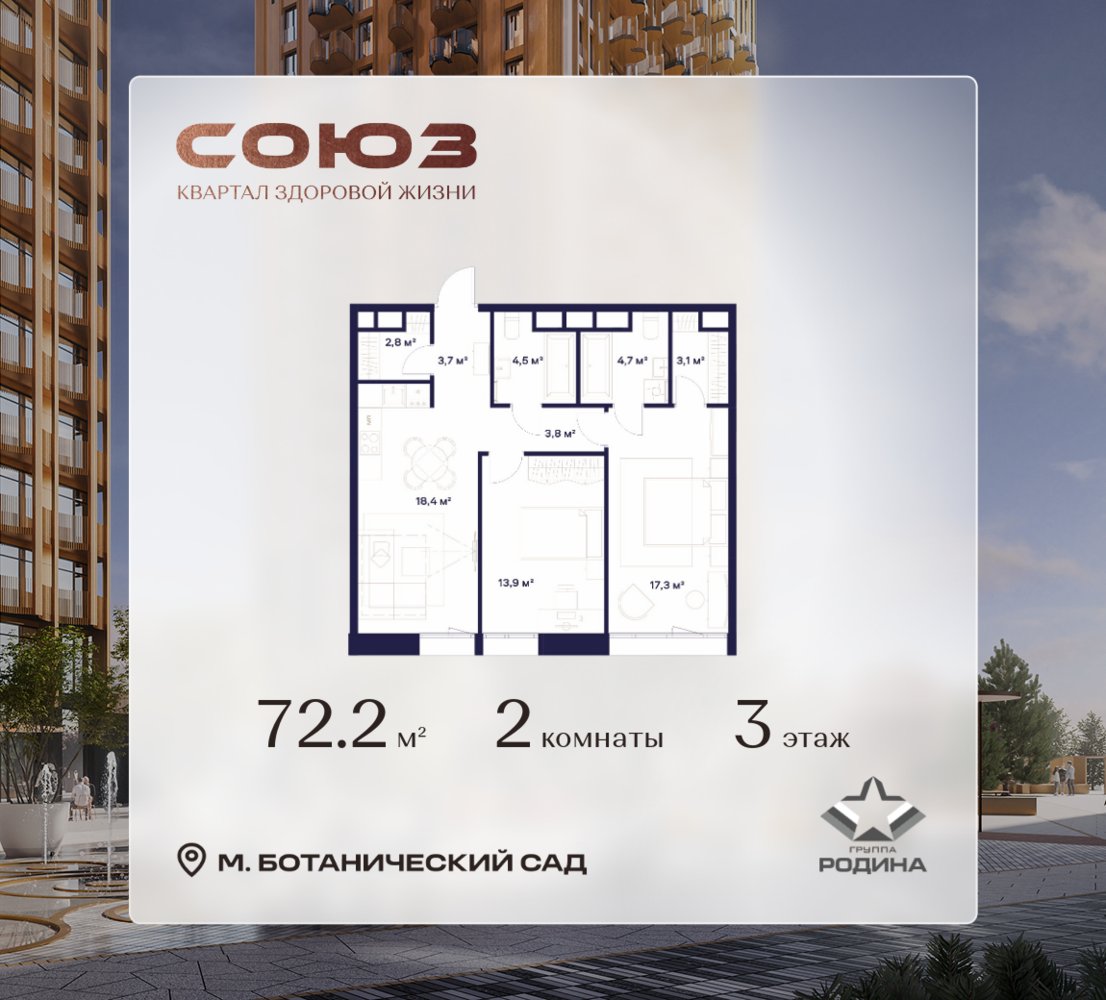 Рассрочка 0% <p> </p> Продаётся 2-комнатная квартира площадью 72.2 м² на 3 этаже в Жилом Комплексе «Союз». <p> </p> Квартал здоровой жизни премиум-класса с рекордным количеством олимпийских видов спорта: <p> </p> - Ледовая арена для хоккея и фигурного катания, - Футбольные поля для тренировок, - Спортивный зал для фехтования, - Бассейн на 6 дорожек, - Центр единоборств, - 4 крытых площадки для настольного тенниса, - 7 теннисных кортов (крытых и открытых), - 4 крытых площадки для сквоша, - Легкоатлетический стадион, - Площадки для баскетбола и волейбола. <p> </p> <p> </p> Уникальные форматы квартир с мастер-спальнями, приватными террасами, балконами, а также пентхаусы с открыточными видами на город. <p> </p> Все квартиры продаются с отделкой Shell&Core и панорамным остеклением. <p> </p> <p> </p> Расположение <p> </p> Пешком: <p> </p> - 2 мин. до парка «Сад Будущего»; - 6 мин. до ст. м. «Ботанический сад»; - 6 мин. до ст. МЦК «Ботанический сад»; - 6 мин. до парка «Леоновская роща»; <p> </p> <p> </p> На автомобиле: <p> </p> - 2 мин. до СВХ (МСД); - 5 мин. до Проспекта Мира; - 10 мин. до ТТК; - 15 мин. до Садового кольца; - 25 мин. до аэропорта «Шереметьево». <p> </p> <p> </p> Благоустройство <p> </p> - собственная спортивная инфраструктура 7 Га; - зона для пикников; - игровые и спортивные площадки для детей всех возрастов; - розарий, а также сосновые, каштановые и дубовые аллеи; - площадки под открытым небом для занятий спортом и йоги; - игровые комнаты для детей; - лаунж-зона для резидентов; - просторная переговорная для деловых встреч; - премиальный ресторан «Шабада» Сосо Павлиашвили с водными арт-объектами на прогулочной аллее, садом ароматных трав и сценой под открытым небом; - кафе, химчистки, аптеки и супермаркеты рядом с домом. <p> </p> <p> </p> Окружение <p> </p> - 8 парков: Сад Будущего, Леоновская роща, Хуамин, Главный ботанический сад РАН, Шереметьевская дубрава, Останкино, парк спорта «Яуза», пойма реки Яуза и музей-усадьба «Останкино»; - 3 ВУЗа: ВГИК, РГСУ, МГПУ; - 12 школ, в том числе: школа 1499 им. И.А. Докукина (топ 100), Brookes Moscow, IThub школа; - 18 детских садов, в том числе билингвальный ALERTUM KIDS; - один из крупнейших океанариумов Европы «Москвариум»; - один из крупнейших в Европе торгово-развлекательных центров «Европолис».