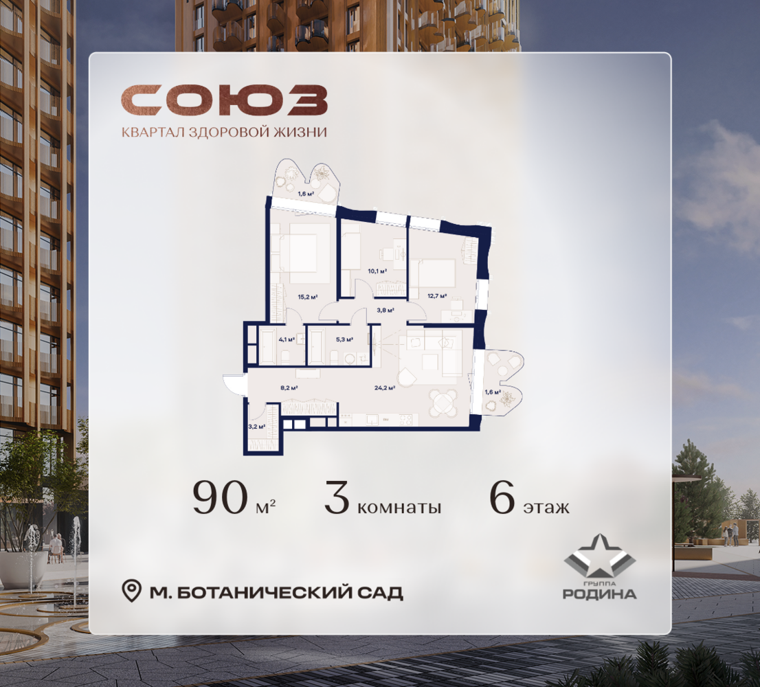 Рассрочка 0% <p> </p> Продаётся 3-комнатная квартира площадью 90 м² на 6 этаже в Жилом Комплексе «Союз». <p> </p> Квартал здоровой жизни премиум-класса с рекордным количеством олимпийских видов спорта: <p> </p> - Ледовая арена для хоккея и фигурного катания, - Футбольные поля для тренировок, - Спортивный зал для фехтования, - Бассейн на 6 дорожек, - Центр единоборств, - 4 крытых площадки для настольного тенниса, - 7 теннисных кортов (крытых и открытых), - 4 крытых площадки для сквоша, - Легкоатлетический стадион, - Площадки для баскетбола и волейбола. <p> </p> <p> </p> Уникальные форматы квартир с мастер-спальнями, приватными террасами, балконами, а также пентхаусы с открыточными видами на город. <p> </p> Все квартиры продаются с отделкой Shell&Core и панорамным остеклением. <p> </p> <p> </p> Расположение <p> </p> Пешком: <p> </p> - 2 мин. до парка «Сад Будущего»; - 6 мин. до ст. м. «Ботанический сад»; - 6 мин. до ст. МЦК «Ботанический сад»; - 6 мин. до парка «Леоновская роща»; <p> </p> <p> </p> На автомобиле: <p> </p> - 2 мин. до СВХ (МСД); - 5 мин. до Проспекта Мира; - 10 мин. до ТТК; - 15 мин. до Садового кольца; - 25 мин. до аэропорта «Шереметьево». <p> </p> <p> </p> Благоустройство <p> </p> - собственная спортивная инфраструктура 7 Га; - зона для пикников; - игровые и спортивные площадки для детей всех возрастов; - розарий, а также сосновые, каштановые и дубовые аллеи; - площадки под открытым небом для занятий спортом и йоги; - игровые комнаты для детей; - лаунж-зона для резидентов; - просторная переговорная для деловых встреч; - премиальный ресторан «Шабада» Сосо Павлиашвили с водными арт-объектами на прогулочной аллее, садом ароматных трав и сценой под открытым небом; - кафе, химчистки, аптеки и супермаркеты рядом с домом. <p> </p> <p> </p> Окружение <p> </p> - 8 парков: Сад Будущего, Леоновская роща, Хуамин, Главный ботанический сад РАН, Шереметьевская дубрава, Останкино, парк спорта «Яуза», пойма реки Яуза и музей-усадьба «Останкино»; - 3 ВУЗа: ВГИК, РГСУ, МГПУ; - 12 школ, в том числе: школа 1499 им. И.А. Докукина (топ 100), Brookes Moscow, IThub школа; - 18 детских садов, в том числе билингвальный ALERTUM KIDS; - один из крупнейших океанариумов Европы «Москвариум»; - один из крупнейших в Европе торгово-развлекательных центров «Европолис».