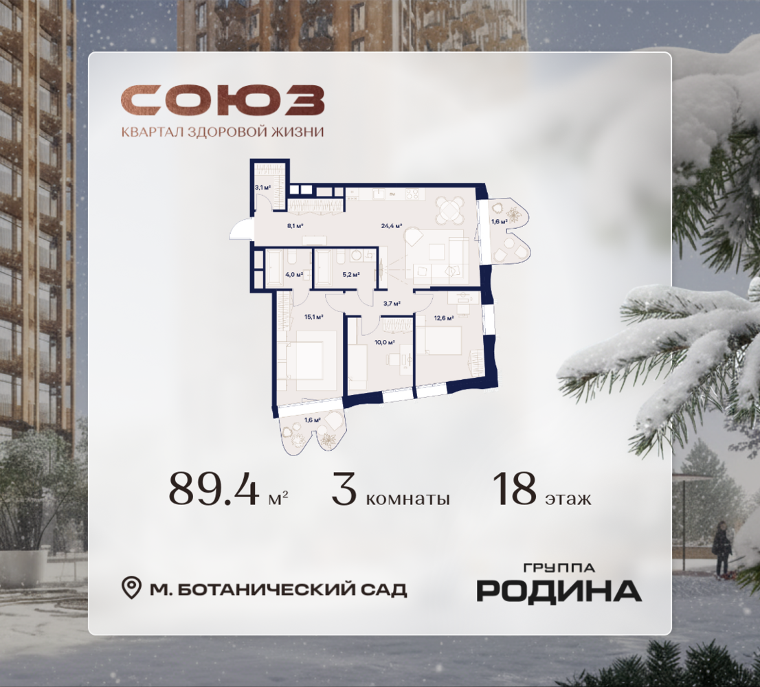 Рассрочка 0% <p> </p> Продаётся 3-комнатная квартира площадью 89.4 м² на 18 этаже в Жилом Комплексе «Союз». <p> </p> Квартал здоровой жизни премиум-класса с рекордным количеством олимпийских видов спорта: <p> </p> - Ледовая арена для хоккея и фигурного катания, - Футбольные поля для тренировок, - Спортивный зал для фехтования, - Бассейн на 6 дорожек, - Центр единоборств, - 4 крытых площадки для настольного тенниса, - 7 теннисных кортов (крытых и открытых), - 4 крытых площадки для сквоша, - Легкоатлетический стадион, - Площадки для баскетбола и волейбола. <p> </p> <p> </p> Уникальные форматы квартир с мастер-спальнями, приватными террасами, балконами, а также пентхаусы с открыточными видами на город. <p> </p> Все квартиры продаются с отделкой Shell&Core и панорамным остеклением. <p> </p> <p> </p> Расположение <p> </p> Пешком: <p> </p> - 2 мин. до парка «Сад Будущего»; - 6 мин. до ст. м. «Ботанический сад»; - 6 мин. до ст. МЦК «Ботанический сад»; - 6 мин. до парка «Леоновская роща»; <p> </p> <p> </p> На автомобиле: <p> </p> - 2 мин. до СВХ (МСД); - 5 мин. до Проспекта Мира; - 10 мин. до ТТК; - 15 мин. до Садового кольца; - 25 мин. до аэропорта «Шереметьево». <p> </p> <p> </p> Благоустройство <p> </p> - собственная спортивная инфраструктура 7 Га; - зона для пикников; - игровые и спортивные площадки для детей всех возрастов; - розарий, а также сосновые, каштановые и дубовые аллеи; - площадки под открытым небом для занятий спортом и йоги; - игровые комнаты для детей; - лаунж-зона для резидентов; - просторная переговорная для деловых встреч; - премиальный ресторан «Шабада» Сосо Павлиашвили с водными арт-объектами на прогулочной аллее, садом ароматных трав и сценой под открытым небом; - кафе, химчистки, аптеки и супермаркеты рядом с домом. <p> </p> <p> </p> Окружение <p> </p> - 8 парков: Сад Будущего, Леоновская роща, Хуамин, Главный ботанический сад РАН, Шереметьевская дубрава, Останкино, парк спорта «Яуза», пойма реки Яуза и музей-усадьба «Останкино»; - 3 ВУЗа: ВГИК, РГСУ, МГПУ; - 12 школ, в том числе: школа 1499 им. И.А. Докукина (топ 100), Brookes Moscow, IThub школа; - 18 детских садов, в том числе билингвальный ALERTUM KIDS; - один из крупнейших океанариумов Европы «Москвариум»; - один из крупнейших в Европе торгово-развлекательных центров «Европолис».