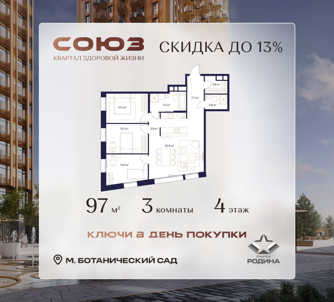 Готовые дома и ключи в день покупки <p> </p> Рассрочка 0% <p> </p> Продаётся 3-комнатная квартира площадью 97 м² на 4 этаже в Жилом Комплексе «Союз». <p> </p> Квартал здоровой жизни премиум-класса с рекордным количеством олимпийских видов спорта: <p> </p> - Ледовая арена для хоккея и фигурного катания, - Футбольные поля для тренировок, - Спортивный зал для фехтования, - Бассейн на 6 дорожек, - Центр единоборств, - 4 крытых площадки для настольного тенниса, - 7 теннисных кортов (крытых и открытых), - 4 крытых площадки для сквоша, - Легкоатлетический стадион, - Площадки для баскетбола и волейбола. <p> </p> <p> </p> Уникальные форматы квартир с мастер-спальнями, приватными террасами, балконами, а также пентхаусы с открыточными видами на город. <p> </p> Все квартиры продаются с отделкой Shell&Core и панорамным остеклением. <p> </p> <p> </p> Расположение <p> </p> Пешком: <p> </p> - 2 мин. до парка «Сад Будущего»; - 6 мин. до ст. м. «Ботанический сад»; - 6 мин. до ст. МЦК «Ботанический сад»; - 6 мин. до парка «Леоновская роща»; <p> </p> <p> </p> На автомобиле: <p> </p> - 2 мин. до СВХ (МСД); - 5 мин. до Проспекта Мира; - 10 мин. до ТТК; - 15 мин. до Садового кольца; - 25 мин. до аэропорта «Шереметьево». <p> </p> <p> </p> Благоустройство <p> </p> - собственная спортивная инфраструктура 7 Га; - зона для пикников; - игровые и спортивные площадки для детей всех возрастов; - розарий, а также сосновые, каштановые и дубовые аллеи; - площадки под открытым небом для занятий спортом и йоги; - игровые комнаты для детей; - лаунж-зона для резидентов; - просторная переговорная для деловых встреч; - премиальный ресторан «Шабада» Сосо Павлиашвили с водными арт-объектами на прогулочной аллее, садом ароматных трав и сценой под открытым небом; - кафе, химчистки, аптеки и супермаркеты рядом с домом. <p> </p> <p> </p> Окружение <p> </p> - 8 парков: Сад Будущего, Леоновская роща, Хуамин, Главный ботанический сад РАН, Шереметьевская дубрава, Останкино, парк спорта «Яуза», пойма реки Яуза и музей-усадьба «Останкино»; - 3 ВУЗа: ВГИК, РГСУ, МГПУ; - 12 школ, в том числе: школа 1499 им. И.А. Докукина (топ 100), Brookes Moscow, IThub школа; - 18 детских садов, в том числе билингвальный ALERTUM KIDS; - один из крупнейших океанариумов Европы «Москвариум»; - один из крупнейших в Европе торгово-развлекательных центров «Европолис».