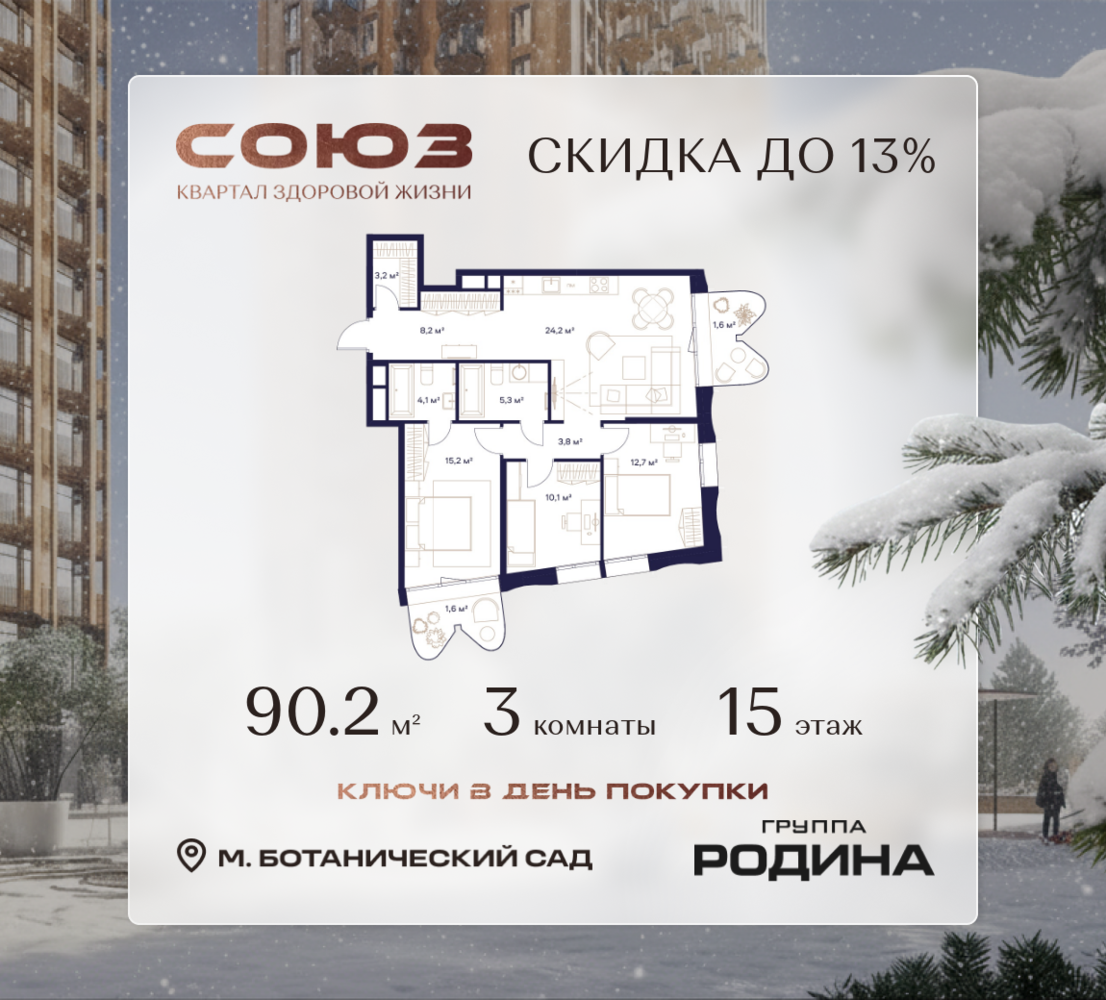 Готовые дома и ключи в день покупки <p> </p> Рассрочка 0% <p> </p> Продаётся 3-комнатная квартира площадью 90.2 м² на 15 этаже в Жилом Комплексе «Союз». <p> </p> Квартал здоровой жизни премиум-класса с рекордным количеством олимпийских видов спорта: <p> </p> - Ледовая арена для хоккея и фигурного катания, - Футбольные поля для тренировок, - Спортивный зал для фехтования, - Бассейн на 6 дорожек, - Центр единоборств, - 4 крытых площадки для настольного тенниса, - 7 теннисных кортов (крытых и открытых), - 4 крытых площадки для сквоша, - Легкоатлетический стадион, - Площадки для баскетбола и волейбола. <p> </p> <p> </p> Уникальные форматы квартир с мастер-спальнями, приватными террасами, балконами, а также пентхаусы с открыточными видами на город. <p> </p> Все квартиры продаются с отделкой Shell&Core и панорамным остеклением. <p> </p> <p> </p> Расположение <p> </p> Пешком: <p> </p> - 2 мин. до парка «Сад Будущего»; - 6 мин. до ст. м. «Ботанический сад»; - 6 мин. до ст. МЦК «Ботанический сад»; - 6 мин. до парка «Леоновская роща»; <p> </p> <p> </p> На автомобиле: <p> </p> - 2 мин. до СВХ (МСД); - 5 мин. до Проспекта Мира; - 10 мин. до ТТК; - 15 мин. до Садового кольца; - 25 мин. до аэропорта «Шереметьево». <p> </p> <p> </p> Благоустройство <p> </p> - собственная спортивная инфраструктура 7 Га; - зона для пикников; - игровые и спортивные площадки для детей всех возрастов; - розарий, а также сосновые, каштановые и дубовые аллеи; - площадки под открытым небом для занятий спортом и йоги; - игровые комнаты для детей; - лаунж-зона для резидентов; - просторная переговорная для деловых встреч; - премиальный ресторан «Шабада» Сосо Павлиашвили с водными арт-объектами на прогулочной аллее, садом ароматных трав и сценой под открытым небом; - кафе, химчистки, аптеки и супермаркеты рядом с домом. <p> </p> <p> </p> Окружение <p> </p> - 8 парков: Сад Будущего, Леоновская роща, Хуамин, Главный ботанический сад РАН, Шереметьевская дубрава, Останкино, парк спорта «Яуза», пойма реки Яуза и музей-усадьба «Останкино»; - 3 ВУЗа: ВГИК, РГСУ, МГПУ; - 12 школ, в том числе: школа 1499 им. И.А. Докукина (топ 100), Brookes Moscow, IThub школа; - 18 детских садов, в том числе билингвальный ALERTUM KIDS; - один из крупнейших океанариумов Европы «Москвариум»; - один из крупнейших в Европе торгово-развлекательных центров «Европолис».