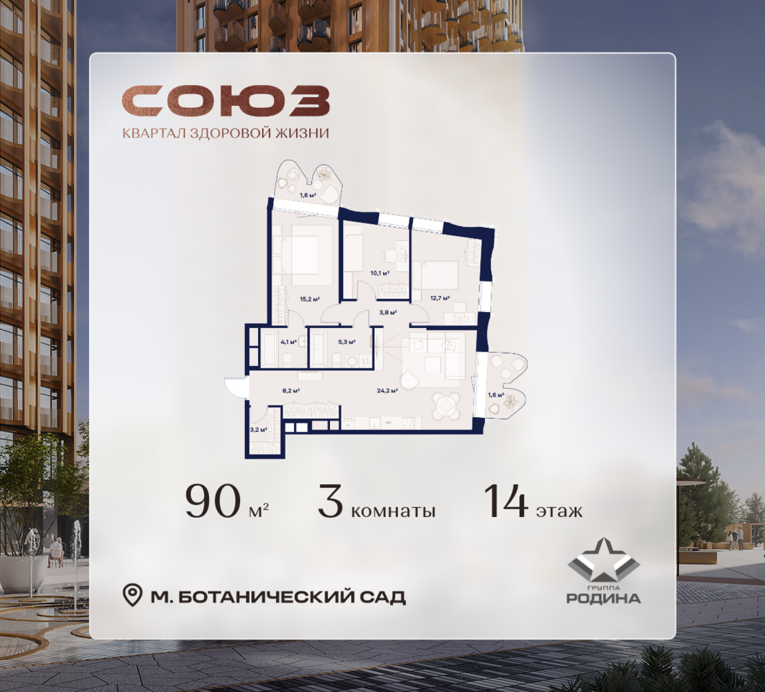 Рассрочка 0% <p> </p> Продаётся 3-комнатная квартира площадью 90 м² на 14 этаже в Жилом Комплексе «Союз». <p> </p> Квартал здоровой жизни премиум-класса с рекордным количеством олимпийских видов спорта: <p> </p> - Ледовая арена для хоккея и фигурного катания, - Футбольные поля для тренировок, - Спортивный зал для фехтования, - Бассейн на 6 дорожек, - Центр единоборств, - 4 крытых площадки для настольного тенниса, - 7 теннисных кортов (крытых и открытых), - 4 крытых площадки для сквоша, - Легкоатлетический стадион, - Площадки для баскетбола и волейбола. <p> </p> <p> </p> Уникальные форматы квартир с мастер-спальнями, приватными террасами, балконами, а также пентхаусы с открыточными видами на город. <p> </p> Все квартиры продаются с отделкой Shell&Core и панорамным остеклением. <p> </p> <p> </p> Расположение <p> </p> Пешком: <p> </p> - 2 мин. до парка «Сад Будущего»; - 6 мин. до ст. м. «Ботанический сад»; - 6 мин. до ст. МЦК «Ботанический сад»; - 6 мин. до парка «Леоновская роща»; <p> </p> <p> </p> На автомобиле: <p> </p> - 2 мин. до СВХ (МСД); - 5 мин. до Проспекта Мира; - 10 мин. до ТТК; - 15 мин. до Садового кольца; - 25 мин. до аэропорта «Шереметьево». <p> </p> <p> </p> Благоустройство <p> </p> - собственная спортивная инфраструктура 7 Га; - зона для пикников; - игровые и спортивные площадки для детей всех возрастов; - розарий, а также сосновые, каштановые и дубовые аллеи; - площадки под открытым небом для занятий спортом и йоги; - игровые комнаты для детей; - лаунж-зона для резидентов; - просторная переговорная для деловых встреч; - премиальный ресторан «Шабада» Сосо Павлиашвили с водными арт-объектами на прогулочной аллее, садом ароматных трав и сценой под открытым небом; - кафе, химчистки, аптеки и супермаркеты рядом с домом. <p> </p> <p> </p> Окружение <p> </p> - 8 парков: Сад Будущего, Леоновская роща, Хуамин, Главный ботанический сад РАН, Шереметьевская дубрава, Останкино, парк спорта «Яуза», пойма реки Яуза и музей-усадьба «Останкино»; - 3 ВУЗа: ВГИК, РГСУ, МГПУ; - 12 школ, в том числе: школа 1499 им. И.А. Докукина (топ 100), Brookes Moscow, IThub школа; - 18 детских садов, в том числе билингвальный ALERTUM KIDS; - один из крупнейших океанариумов Европы «Москвариум»; - один из крупнейших в Европе торгово-развлекательных центров «Европолис».