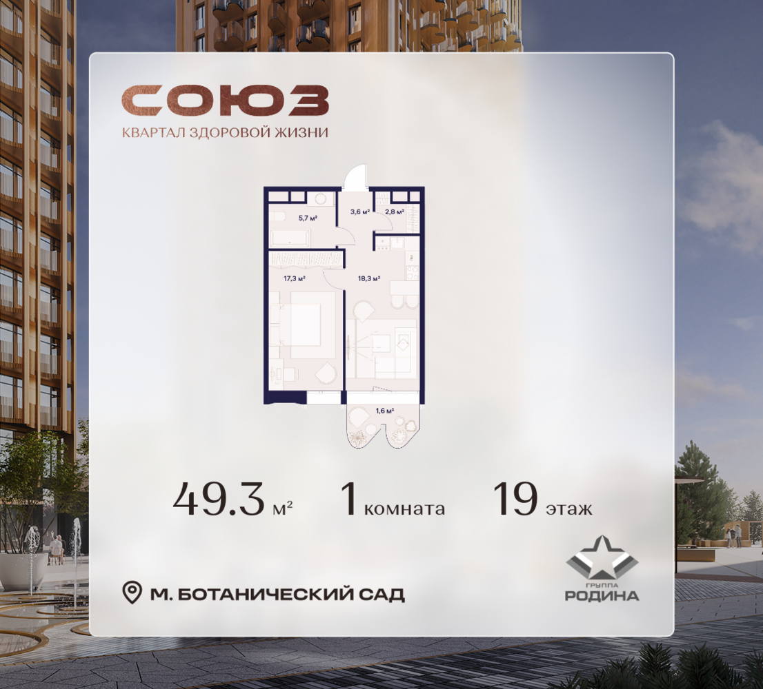 Рассрочка 0% <p> </p> Продаётся 1-комнатная квартира площадью 49.3 м² на 19 этаже в Жилом Комплексе «Союз». <p> </p> Квартал здоровой жизни премиум-класса с рекордным количеством олимпийских видов спорта: <p> </p> - Ледовая арена для хоккея и фигурного катания, - Футбольные поля для тренировок, - Спортивный зал для фехтования, - Бассейн на 6 дорожек, - Центр единоборств, - 4 крытых площадки для настольного тенниса, - 7 теннисных кортов (крытых и открытых), - 4 крытых площадки для сквоша, - Легкоатлетический стадион, - Площадки для баскетбола и волейбола. <p> </p> <p> </p> Уникальные форматы квартир с мастер-спальнями, приватными террасами, балконами, а также пентхаусы с открыточными видами на город. <p> </p> Все квартиры продаются с отделкой Shell&Core и панорамным остеклением. <p> </p> <p> </p> Расположение <p> </p> Пешком: <p> </p> - 2 мин. до парка «Сад Будущего»; - 6 мин. до ст. м. «Ботанический сад»; - 6 мин. до ст. МЦК «Ботанический сад»; - 6 мин. до парка «Леоновская роща»; <p> </p> <p> </p> На автомобиле: <p> </p> - 2 мин. до СВХ (МСД); - 5 мин. до Проспекта Мира; - 10 мин. до ТТК; - 15 мин. до Садового кольца; - 25 мин. до аэропорта «Шереметьево». <p> </p> <p> </p> Благоустройство <p> </p> - собственная спортивная инфраструктура 7 Га; - зона для пикников; - игровые и спортивные площадки для детей всех возрастов; - розарий, а также сосновые, каштановые и дубовые аллеи; - площадки под открытым небом для занятий спортом и йоги; - игровые комнаты для детей; - лаунж-зона для резидентов; - просторная переговорная для деловых встреч; - премиальный ресторан «Шабада» Сосо Павлиашвили с водными арт-объектами на прогулочной аллее, садом ароматных трав и сценой под открытым небом; - кафе, химчистки, аптеки и супермаркеты рядом с домом. <p> </p> <p> </p> Окружение <p> </p> - 8 парков: Сад Будущего, Леоновская роща, Хуамин, Главный ботанический сад РАН, Шереметьевская дубрава, Останкино, парк спорта «Яуза», пойма реки Яуза и музей-усадьба «Останкино»; - 3 ВУЗа: ВГИК, РГСУ, МГПУ; - 12 школ, в том числе: школа 1499 им. И.А. Докукина (топ 100), Brookes Moscow, IThub школа; - 18 детских садов, в том числе билингвальный ALERTUM KIDS; - один из крупнейших океанариумов Европы «Москвариум»; - один из крупнейших в Европе торгово-развлекательных центров «Европолис».