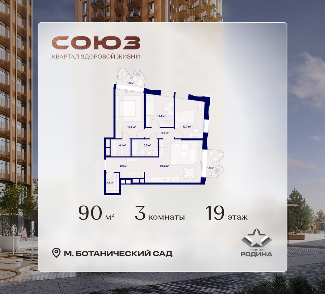 Рассрочка 0% <p> </p> Продаётся 3-комнатная квартира площадью 90 м² на 19 этаже в Жилом Комплексе «Союз». <p> </p> Квартал здоровой жизни премиум-класса с рекордным количеством олимпийских видов спорта: <p> </p> - Ледовая арена для хоккея и фигурного катания, - Футбольные поля для тренировок, - Спортивный зал для фехтования, - Бассейн на 6 дорожек, - Центр единоборств, - 4 крытых площадки для настольного тенниса, - 7 теннисных кортов (крытых и открытых), - 4 крытых площадки для сквоша, - Легкоатлетический стадион, - Площадки для баскетбола и волейбола. <p> </p> <p> </p> Уникальные форматы квартир с мастер-спальнями, приватными террасами, балконами, а также пентхаусы с открыточными видами на город. <p> </p> Все квартиры продаются с отделкой Shell&Core и панорамным остеклением. <p> </p> <p> </p> Расположение <p> </p> Пешком: <p> </p> - 2 мин. до парка «Сад Будущего»; - 6 мин. до ст. м. «Ботанический сад»; - 6 мин. до ст. МЦК «Ботанический сад»; - 6 мин. до парка «Леоновская роща»; <p> </p> <p> </p> На автомобиле: <p> </p> - 2 мин. до СВХ (МСД); - 5 мин. до Проспекта Мира; - 10 мин. до ТТК; - 15 мин. до Садового кольца; - 25 мин. до аэропорта «Шереметьево». <p> </p> <p> </p> Благоустройство <p> </p> - собственная спортивная инфраструктура 7 Га; - зона для пикников; - игровые и спортивные площадки для детей всех возрастов; - розарий, а также сосновые, каштановые и дубовые аллеи; - площадки под открытым небом для занятий спортом и йоги; - игровые комнаты для детей; - лаунж-зона для резидентов; - просторная переговорная для деловых встреч; - премиальный ресторан «Шабада» Сосо Павлиашвили с водными арт-объектами на прогулочной аллее, садом ароматных трав и сценой под открытым небом; - кафе, химчистки, аптеки и супермаркеты рядом с домом. <p> </p> <p> </p> Окружение <p> </p> - 8 парков: Сад Будущего, Леоновская роща, Хуамин, Главный ботанический сад РАН, Шереметьевская дубрава, Останкино, парк спорта «Яуза», пойма реки Яуза и музей-усадьба «Останкино»; - 3 ВУЗа: ВГИК, РГСУ, МГПУ; - 12 школ, в том числе: школа 1499 им. И.А. Докукина (топ 100), Brookes Moscow, IThub школа; - 18 детских садов, в том числе билингвальный ALERTUM KIDS; - один из крупнейших океанариумов Европы «Москвариум»; - один из крупнейших в Европе торгово-развлекательных центров «Европолис».