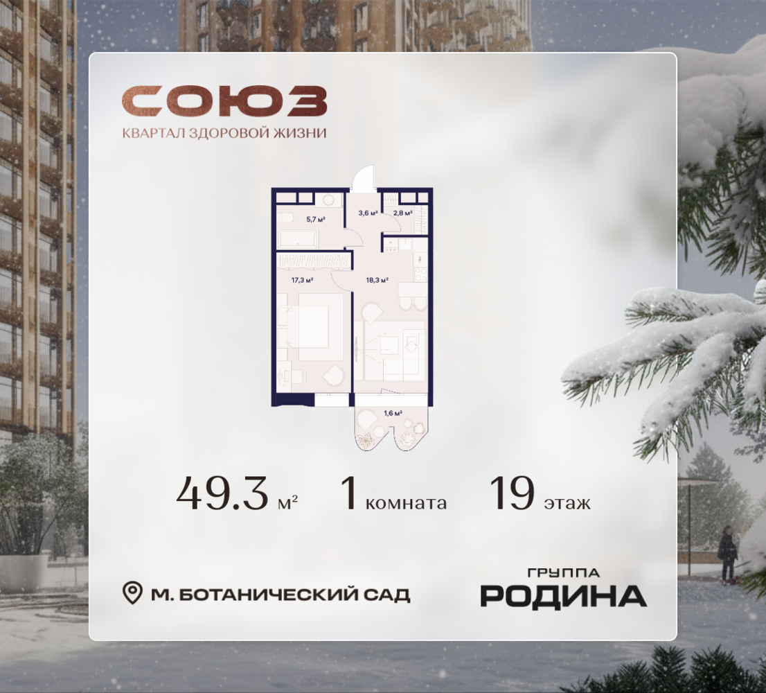 Рассрочка 0% <p> </p> Продаётся 1-комнатная квартира площадью 49.3 м² на 19 этаже в Жилом Комплексе «Союз». <p> </p> Квартал здоровой жизни премиум-класса с рекордным количеством олимпийских видов спорта: <p> </p> - Ледовая арена для хоккея и фигурного катания, - Футбольные поля для тренировок, - Спортивный зал для фехтования, - Бассейн на 6 дорожек, - Центр единоборств, - 4 крытых площадки для настольного тенниса, - 7 теннисных кортов (крытых и открытых), - 4 крытых площадки для сквоша, - Легкоатлетический стадион, - Площадки для баскетбола и волейбола. <p> </p> <p> </p> Уникальные форматы квартир с мастер-спальнями, приватными террасами, балконами, а также пентхаусы с открыточными видами на город. <p> </p> Все квартиры продаются с отделкой Shell&Core и панорамным остеклением. <p> </p> <p> </p> Расположение <p> </p> Пешком: <p> </p> - 2 мин. до парка «Сад Будущего»; - 6 мин. до ст. м. «Ботанический сад»; - 6 мин. до ст. МЦК «Ботанический сад»; - 6 мин. до парка «Леоновская роща»; <p> </p> <p> </p> На автомобиле: <p> </p> - 2 мин. до СВХ (МСД); - 5 мин. до Проспекта Мира; - 10 мин. до ТТК; - 15 мин. до Садового кольца; - 25 мин. до аэропорта «Шереметьево». <p> </p> <p> </p> Благоустройство <p> </p> - собственная спортивная инфраструктура 7 Га; - зона для пикников; - игровые и спортивные площадки для детей всех возрастов; - розарий, а также сосновые, каштановые и дубовые аллеи; - площадки под открытым небом для занятий спортом и йоги; - игровые комнаты для детей; - лаунж-зона для резидентов; - просторная переговорная для деловых встреч; - премиальный ресторан «Шабада» Сосо Павлиашвили с водными арт-объектами на прогулочной аллее, садом ароматных трав и сценой под открытым небом; - кафе, химчистки, аптеки и супермаркеты рядом с домом. <p> </p> <p> </p> Окружение <p> </p> - 8 парков: Сад Будущего, Леоновская роща, Хуамин, Главный ботанический сад РАН, Шереметьевская дубрава, Останкино, парк спорта «Яуза», пойма реки Яуза и музей-усадьба «Останкино»; - 3 ВУЗа: ВГИК, РГСУ, МГПУ; - 12 школ, в том числе: школа 1499 им. И.А. Докукина (топ 100), Brookes Moscow, IThub школа; - 18 детских садов, в том числе билингвальный ALERTUM KIDS; - один из крупнейших океанариумов Европы «Москвариум»; - один из крупнейших в Европе торгово-развлекательных центров «Европолис».