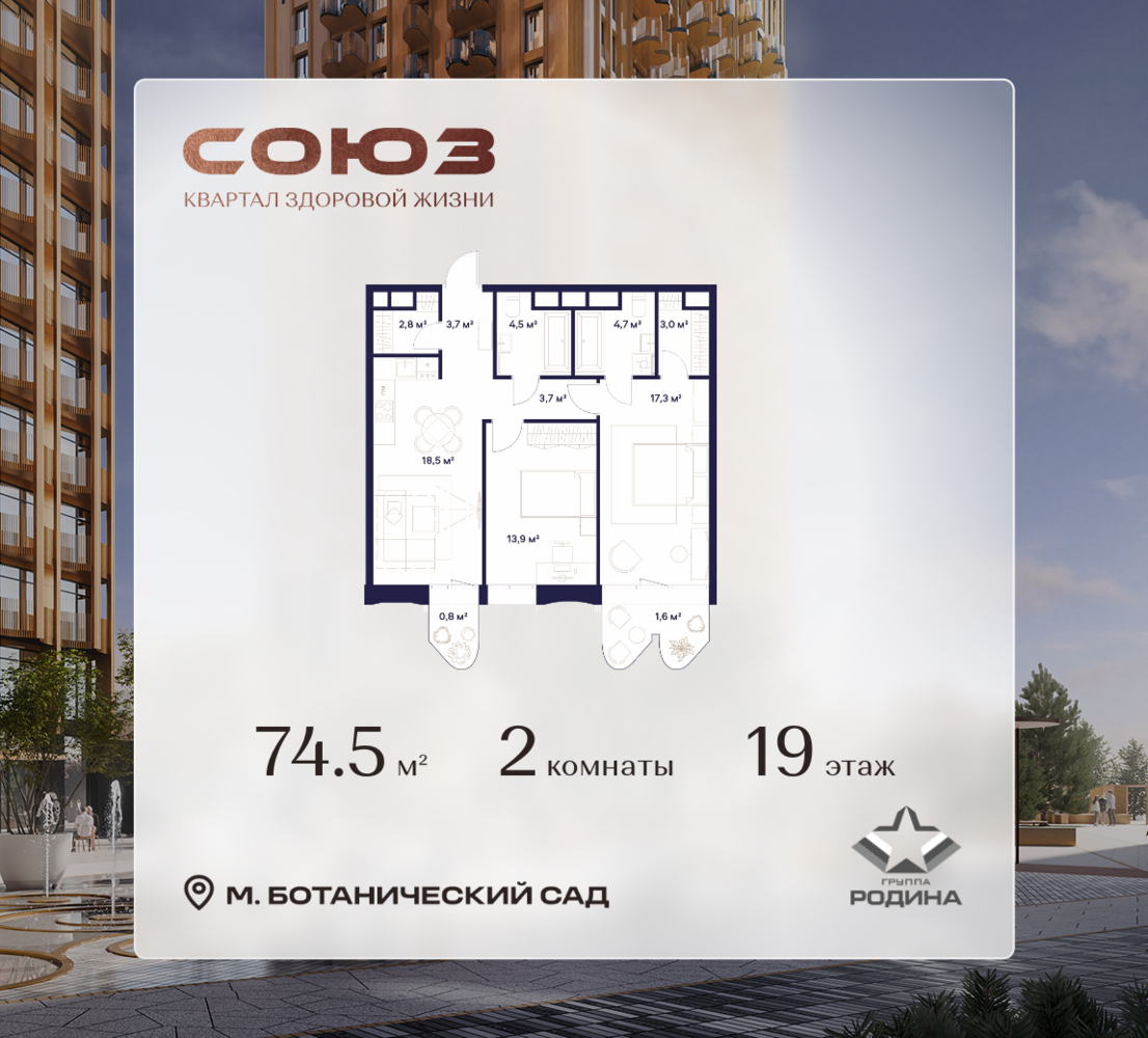 Рассрочка 0% <p> </p> Продаётся 2-комнатная квартира площадью 74.5 м² на 19 этаже в Жилом Комплексе «Союз». <p> </p> Квартал здоровой жизни премиум-класса с рекордным количеством олимпийских видов спорта: <p> </p> - Ледовая арена для хоккея и фигурного катания, - Футбольные поля для тренировок, - Спортивный зал для фехтования, - Бассейн на 6 дорожек, - Центр единоборств, - 4 крытых площадки для настольного тенниса, - 7 теннисных кортов (крытых и открытых), - 4 крытых площадки для сквоша, - Легкоатлетический стадион, - Площадки для баскетбола и волейбола. <p> </p> <p> </p> Уникальные форматы квартир с мастер-спальнями, приватными террасами, балконами, а также пентхаусы с открыточными видами на город. <p> </p> Все квартиры продаются с отделкой Shell&Core и панорамным остеклением. <p> </p> <p> </p> Расположение <p> </p> Пешком: <p> </p> - 2 мин. до парка «Сад Будущего»; - 6 мин. до ст. м. «Ботанический сад»; - 6 мин. до ст. МЦК «Ботанический сад»; - 6 мин. до парка «Леоновская роща»; <p> </p> <p> </p> На автомобиле: <p> </p> - 2 мин. до СВХ (МСД); - 5 мин. до Проспекта Мира; - 10 мин. до ТТК; - 15 мин. до Садового кольца; - 25 мин. до аэропорта «Шереметьево». <p> </p> <p> </p> Благоустройство <p> </p> - собственная спортивная инфраструктура 7 Га; - зона для пикников; - игровые и спортивные площадки для детей всех возрастов; - розарий, а также сосновые, каштановые и дубовые аллеи; - площадки под открытым небом для занятий спортом и йоги; - игровые комнаты для детей; - лаунж-зона для резидентов; - просторная переговорная для деловых встреч; - премиальный ресторан «Шабада» Сосо Павлиашвили с водными арт-объектами на прогулочной аллее, садом ароматных трав и сценой под открытым небом; - кафе, химчистки, аптеки и супермаркеты рядом с домом. <p> </p> <p> </p> Окружение <p> </p> - 8 парков: Сад Будущего, Леоновская роща, Хуамин, Главный ботанический сад РАН, Шереметьевская дубрава, Останкино, парк спорта «Яуза», пойма реки Яуза и музей-усадьба «Останкино»; - 3 ВУЗа: ВГИК, РГСУ, МГПУ; - 12 школ, в том числе: школа 1499 им. И.А. Докукина (топ 100), Brookes Moscow, IThub школа; - 18 детских садов, в том числе билингвальный ALERTUM KIDS; - один из крупнейших океанариумов Европы «Москвариум»; - один из крупнейших в Европе торгово-развлекательных центров «Европолис».