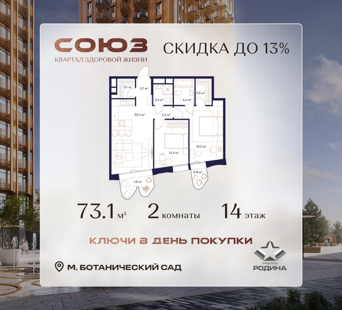 Готовые дома и ключи в день покупки <p> </p> Рассрочка 0% <p> </p> Продаётся 2-комнатная квартира площадью 73.1 м² на 14 этаже в Жилом Комплексе «Союз». <p> </p> Квартал здоровой жизни премиум-класса с рекордным количеством олимпийских видов спорта: <p> </p> - Ледовая арена для хоккея и фигурного катания, - Футбольные поля для тренировок, - Спортивный зал для фехтования, - Бассейн на 6 дорожек, - Центр единоборств, - 4 крытых площадки для настольного тенниса, - 7 теннисных кортов (крытых и открытых), - 4 крытых площадки для сквоша, - Легкоатлетический стадион, - Площадки для баскетбола и волейбола. <p> </p> <p> </p> Уникальные форматы квартир с мастер-спальнями, приватными террасами, балконами, а также пентхаусы с открыточными видами на город. <p> </p> Все квартиры продаются с отделкой Shell&Core и панорамным остеклением. <p> </p> <p> </p> Расположение <p> </p> Пешком: <p> </p> - 2 мин. до парка «Сад Будущего»; - 6 мин. до ст. м. «Ботанический сад»; - 6 мин. до ст. МЦК «Ботанический сад»; - 6 мин. до парка «Леоновская роща»; <p> </p> <p> </p> На автомобиле: <p> </p> - 2 мин. до СВХ (МСД); - 5 мин. до Проспекта Мира; - 10 мин. до ТТК; - 15 мин. до Садового кольца; - 25 мин. до аэропорта «Шереметьево». <p> </p> <p> </p> Благоустройство <p> </p> - собственная спортивная инфраструктура 7 Га; - зона для пикников; - игровые и спортивные площадки для детей всех возрастов; - розарий, а также сосновые, каштановые и дубовые аллеи; - площадки под открытым небом для занятий спортом и йоги; - игровые комнаты для детей; - лаунж-зона для резидентов; - просторная переговорная для деловых встреч; - премиальный ресторан «Шабада» Сосо Павлиашвили с водными арт-объектами на прогулочной аллее, садом ароматных трав и сценой под открытым небом; - кафе, химчистки, аптеки и супермаркеты рядом с домом. <p> </p> <p> </p> Окружение <p> </p> - 8 парков: Сад Будущего, Леоновская роща, Хуамин, Главный ботанический сад РАН, Шереметьевская дубрава, Останкино, парк спорта «Яуза», пойма реки Яуза и музей-усадьба «Останкино»; - 3 ВУЗа: ВГИК, РГСУ, МГПУ; - 12 школ, в том числе: школа 1499 им. И.А. Докукина (топ 100), Brookes Moscow, IThub школа; - 18 детских садов, в том числе билингвальный ALERTUM KIDS; - один из крупнейших океанариумов Европы «Москвариум»; - один из крупнейших в Европе торгово-развлекательных центров «Европолис».