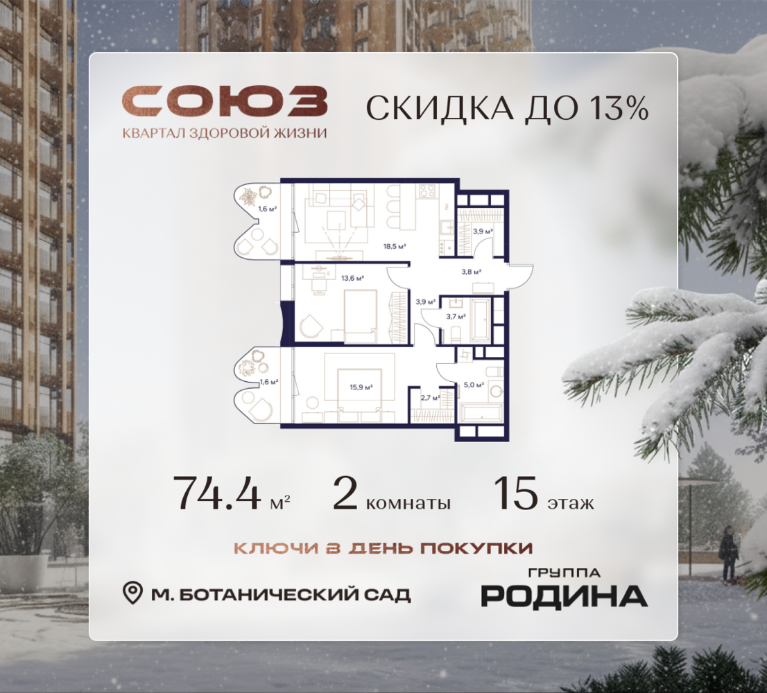 Готовые дома и ключи в день покупки <p> </p> Рассрочка 0% <p> </p> Продаётся 2-комнатная квартира площадью 74.4 м² на 15 этаже в Жилом Комплексе «Союз». <p> </p> Квартал здоровой жизни премиум-класса с рекордным количеством олимпийских видов спорта: <p> </p> - Ледовая арена для хоккея и фигурного катания, - Футбольные поля для тренировок, - Спортивный зал для фехтования, - Бассейн на 6 дорожек, - Центр единоборств, - 4 крытых площадки для настольного тенниса, - 7 теннисных кортов (крытых и открытых), - 4 крытых площадки для сквоша, - Легкоатлетический стадион, - Площадки для баскетбола и волейбола. <p> </p> <p> </p> Уникальные форматы квартир с мастер-спальнями, приватными террасами, балконами, а также пентхаусы с открыточными видами на город. <p> </p> Все квартиры продаются с отделкой Shell&Core и панорамным остеклением. <p> </p> <p> </p> Расположение <p> </p> Пешком: <p> </p> - 2 мин. до парка «Сад Будущего»; - 6 мин. до ст. м. «Ботанический сад»; - 6 мин. до ст. МЦК «Ботанический сад»; - 6 мин. до парка «Леоновская роща»; <p> </p> <p> </p> На автомобиле: <p> </p> - 2 мин. до СВХ (МСД); - 5 мин. до Проспекта Мира; - 10 мин. до ТТК; - 15 мин. до Садового кольца; - 25 мин. до аэропорта «Шереметьево». <p> </p> <p> </p> Благоустройство <p> </p> - собственная спортивная инфраструктура 7 Га; - зона для пикников; - игровые и спортивные площадки для детей всех возрастов; - розарий, а также сосновые, каштановые и дубовые аллеи; - площадки под открытым небом для занятий спортом и йоги; - игровые комнаты для детей; - лаунж-зона для резидентов; - просторная переговорная для деловых встреч; - премиальный ресторан «Шабада» Сосо Павлиашвили с водными арт-объектами на прогулочной аллее, садом ароматных трав и сценой под открытым небом; - кафе, химчистки, аптеки и супермаркеты рядом с домом. <p> </p> <p> </p> Окружение <p> </p> - 8 парков: Сад Будущего, Леоновская роща, Хуамин, Главный ботанический сад РАН, Шереметьевская дубрава, Останкино, парк спорта «Яуза», пойма реки Яуза и музей-усадьба «Останкино»; - 3 ВУЗа: ВГИК, РГСУ, МГПУ; - 12 школ, в том числе: школа 1499 им. И.А. Докукина (топ 100), Brookes Moscow, IThub школа; - 18 детских садов, в том числе билингвальный ALERTUM KIDS; - один из крупнейших океанариумов Европы «Москвариум»; - один из крупнейших в Европе торгово-развлекательных центров «Европолис».