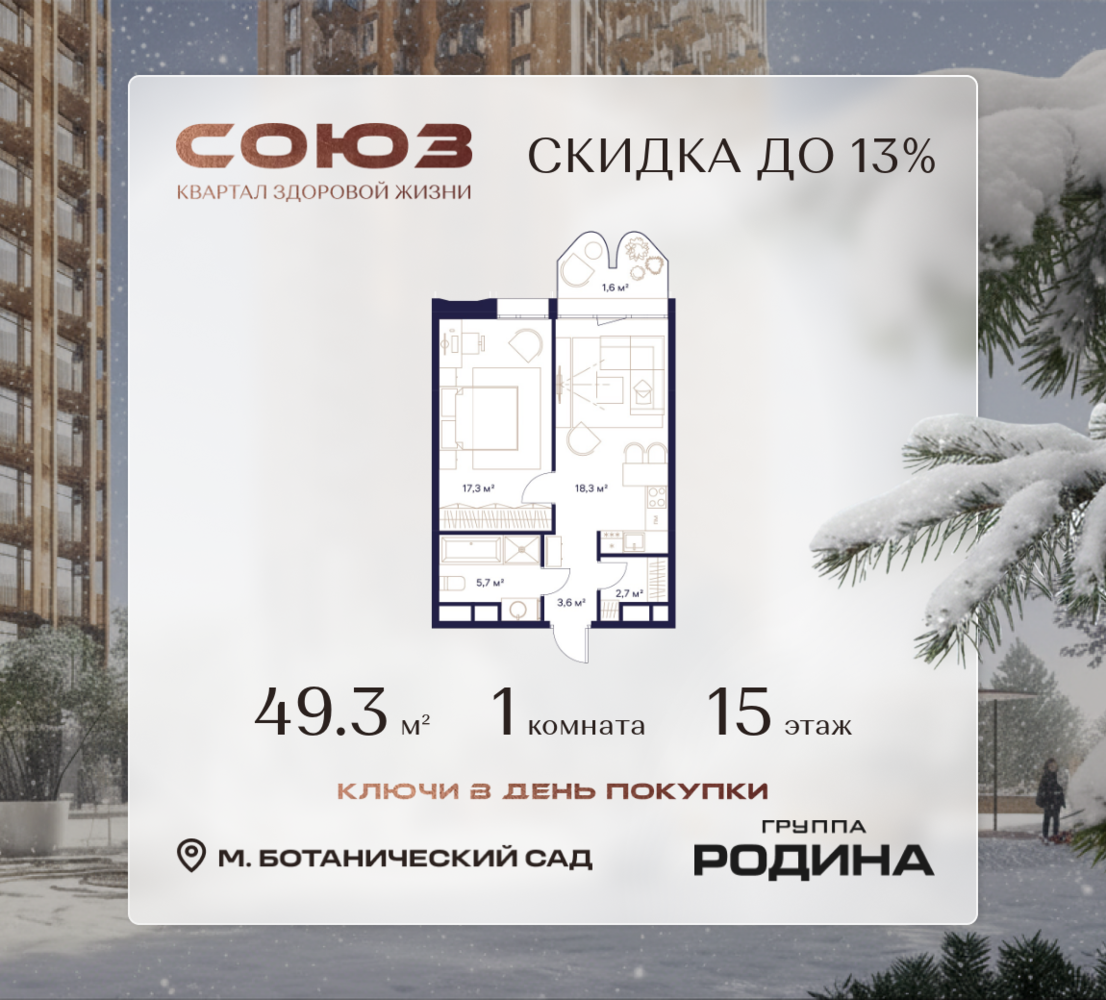Готовые дома и ключи в день покупки <p> </p> Рассрочка 0% <p> </p> Продаётся 1-комнатная квартира площадью 49.3 м² на 15 этаже в Жилом Комплексе «Союз». <p> </p> Квартал здоровой жизни премиум-класса с рекордным количеством олимпийских видов спорта: <p> </p> - Ледовая арена для хоккея и фигурного катания, - Футбольные поля для тренировок, - Спортивный зал для фехтования, - Бассейн на 6 дорожек, - Центр единоборств, - 4 крытых площадки для настольного тенниса, - 7 теннисных кортов (крытых и открытых), - 4 крытых площадки для сквоша, - Легкоатлетический стадион, - Площадки для баскетбола и волейбола. <p> </p> <p> </p> Уникальные форматы квартир с мастер-спальнями, приватными террасами, балконами, а также пентхаусы с открыточными видами на город. <p> </p> Все квартиры продаются с отделкой Shell&Core и панорамным остеклением. <p> </p> <p> </p> Расположение <p> </p> Пешком: <p> </p> - 2 мин. до парка «Сад Будущего»; - 6 мин. до ст. м. «Ботанический сад»; - 6 мин. до ст. МЦК «Ботанический сад»; - 6 мин. до парка «Леоновская роща»; <p> </p> <p> </p> На автомобиле: <p> </p> - 2 мин. до СВХ (МСД); - 5 мин. до Проспекта Мира; - 10 мин. до ТТК; - 15 мин. до Садового кольца; - 25 мин. до аэропорта «Шереметьево». <p> </p> <p> </p> Благоустройство <p> </p> - собственная спортивная инфраструктура 7 Га; - зона для пикников; - игровые и спортивные площадки для детей всех возрастов; - розарий, а также сосновые, каштановые и дубовые аллеи; - площадки под открытым небом для занятий спортом и йоги; - игровые комнаты для детей; - лаунж-зона для резидентов; - просторная переговорная для деловых встреч; - премиальный ресторан «Шабада» Сосо Павлиашвили с водными арт-объектами на прогулочной аллее, садом ароматных трав и сценой под открытым небом; - кафе, химчистки, аптеки и супермаркеты рядом с домом. <p> </p> <p> </p> Окружение <p> </p> - 8 парков: Сад Будущего, Леоновская роща, Хуамин, Главный ботанический сад РАН, Шереметьевская дубрава, Останкино, парк спорта «Яуза», пойма реки Яуза и музей-усадьба «Останкино»; - 3 ВУЗа: ВГИК, РГСУ, МГПУ; - 12 школ, в том числе: школа 1499 им. И.А. Докукина (топ 100), Brookes Moscow, IThub школа; - 18 детских садов, в том числе билингвальный ALERTUM KIDS; - один из крупнейших океанариумов Европы «Москвариум»; - один из крупнейших в Европе торгово-развлекательных центров «Европолис».