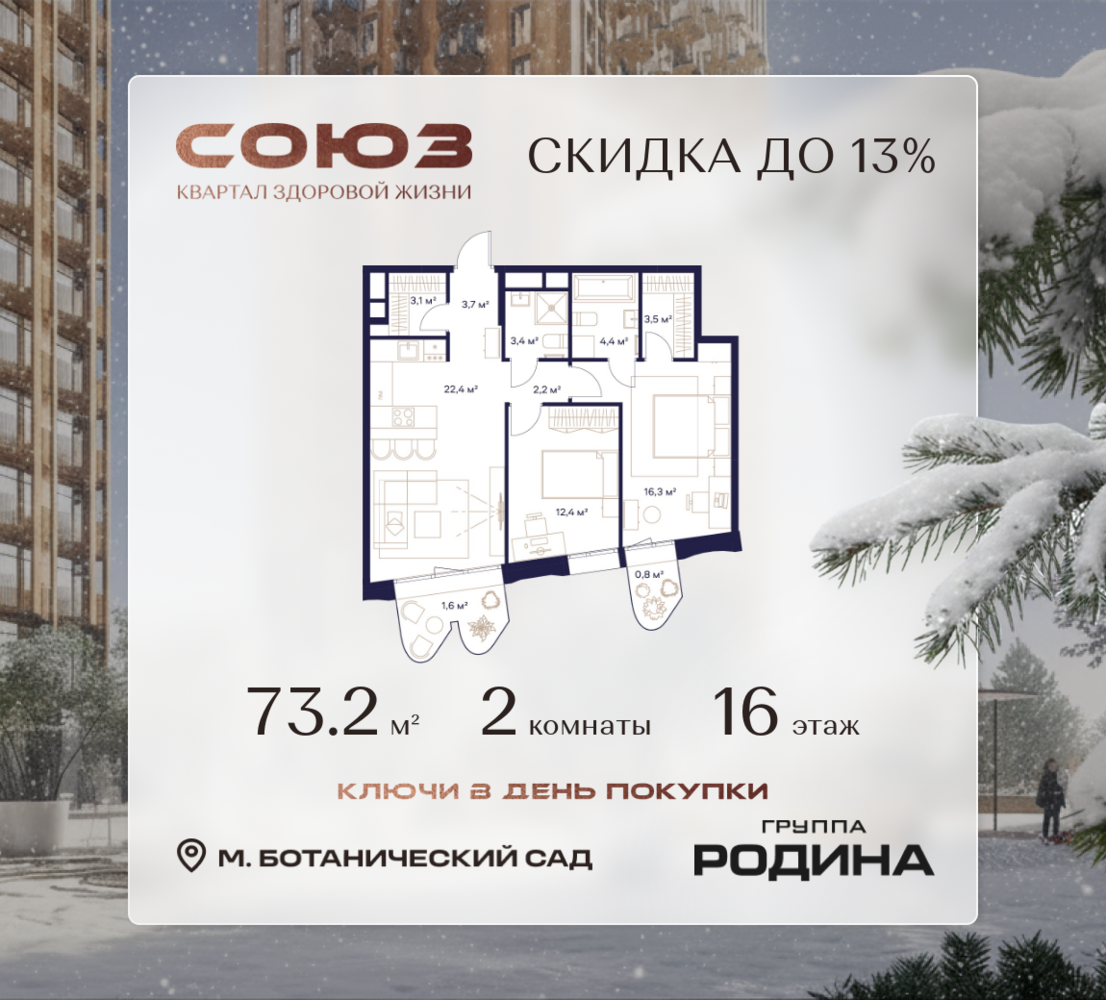Готовые дома и ключи в день покупки <p> </p> Рассрочка 0% <p> </p> Продаётся 2-комнатная квартира площадью 73.2 м² на 16 этаже в Жилом Комплексе «Союз». <p> </p> Квартал здоровой жизни премиум-класса с рекордным количеством олимпийских видов спорта: <p> </p> - Ледовая арена для хоккея и фигурного катания, - Футбольные поля для тренировок, - Спортивный зал для фехтования, - Бассейн на 6 дорожек, - Центр единоборств, - 4 крытых площадки для настольного тенниса, - 7 теннисных кортов (крытых и открытых), - 4 крытых площадки для сквоша, - Легкоатлетический стадион, - Площадки для баскетбола и волейбола. <p> </p> <p> </p> Уникальные форматы квартир с мастер-спальнями, приватными террасами, балконами, а также пентхаусы с открыточными видами на город. <p> </p> Все квартиры продаются с отделкой Shell&Core и панорамным остеклением. <p> </p> <p> </p> Расположение <p> </p> Пешком: <p> </p> - 2 мин. до парка «Сад Будущего»; - 6 мин. до ст. м. «Ботанический сад»; - 6 мин. до ст. МЦК «Ботанический сад»; - 6 мин. до парка «Леоновская роща»; <p> </p> <p> </p> На автомобиле: <p> </p> - 2 мин. до СВХ (МСД); - 5 мин. до Проспекта Мира; - 10 мин. до ТТК; - 15 мин. до Садового кольца; - 25 мин. до аэропорта «Шереметьево». <p> </p> <p> </p> Благоустройство <p> </p> - собственная спортивная инфраструктура 7 Га; - зона для пикников; - игровые и спортивные площадки для детей всех возрастов; - розарий, а также сосновые, каштановые и дубовые аллеи; - площадки под открытым небом для занятий спортом и йоги; - игровые комнаты для детей; - лаунж-зона для резидентов; - просторная переговорная для деловых встреч; - премиальный ресторан «Шабада» Сосо Павлиашвили с водными арт-объектами на прогулочной аллее, садом ароматных трав и сценой под открытым небом; - кафе, химчистки, аптеки и супермаркеты рядом с домом. <p> </p> <p> </p> Окружение <p> </p> - 8 парков: Сад Будущего, Леоновская роща, Хуамин, Главный ботанический сад РАН, Шереметьевская дубрава, Останкино, парк спорта «Яуза», пойма реки Яуза и музей-усадьба «Останкино»; - 3 ВУЗа: ВГИК, РГСУ, МГПУ; - 12 школ, в том числе: школа 1499 им. И.А. Докукина (топ 100), Brookes Moscow, IThub школа; - 18 детских садов, в том числе билингвальный ALERTUM KIDS; - один из крупнейших океанариумов Европы «Москвариум»; - один из крупнейших в Европе торгово-развлекательных центров «Европолис».