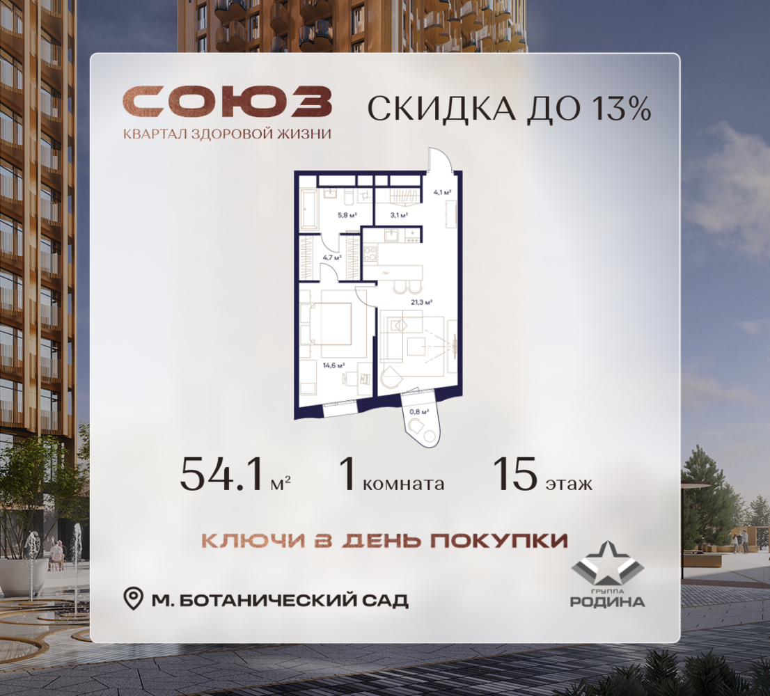 Готовые дома и ключи в день покупки <p> </p> Рассрочка 0% <p> </p> Продаётся 1-комнатная квартира площадью 54.1 м² на 15 этаже в Жилом Комплексе «Союз». <p> </p> Квартал здоровой жизни премиум-класса с рекордным количеством олимпийских видов спорта: <p> </p> - Ледовая арена для хоккея и фигурного катания, - Футбольные поля для тренировок, - Спортивный зал для фехтования, - Бассейн на 6 дорожек, - Центр единоборств, - 4 крытых площадки для настольного тенниса, - 7 теннисных кортов (крытых и открытых), - 4 крытых площадки для сквоша, - Легкоатлетический стадион, - Площадки для баскетбола и волейбола. <p> </p> <p> </p> Уникальные форматы квартир с мастер-спальнями, приватными террасами, балконами, а также пентхаусы с открыточными видами на город. <p> </p> Все квартиры продаются с отделкой Shell&Core и панорамным остеклением. <p> </p> <p> </p> Расположение <p> </p> Пешком: <p> </p> - 2 мин. до парка «Сад Будущего»; - 6 мин. до ст. м. «Ботанический сад»; - 6 мин. до ст. МЦК «Ботанический сад»; - 6 мин. до парка «Леоновская роща»; <p> </p> <p> </p> На автомобиле: <p> </p> - 2 мин. до СВХ (МСД); - 5 мин. до Проспекта Мира; - 10 мин. до ТТК; - 15 мин. до Садового кольца; - 25 мин. до аэропорта «Шереметьево». <p> </p> <p> </p> Благоустройство <p> </p> - собственная спортивная инфраструктура 7 Га; - зона для пикников; - игровые и спортивные площадки для детей всех возрастов; - розарий, а также сосновые, каштановые и дубовые аллеи; - площадки под открытым небом для занятий спортом и йоги; - игровые комнаты для детей; - лаунж-зона для резидентов; - просторная переговорная для деловых встреч; - премиальный ресторан «Шабада» Сосо Павлиашвили с водными арт-объектами на прогулочной аллее, садом ароматных трав и сценой под открытым небом; - кафе, химчистки, аптеки и супермаркеты рядом с домом. <p> </p> <p> </p> Окружение <p> </p> - 8 парков: Сад Будущего, Леоновская роща, Хуамин, Главный ботанический сад РАН, Шереметьевская дубрава, Останкино, парк спорта «Яуза», пойма реки Яуза и музей-усадьба «Останкино»; - 3 ВУЗа: ВГИК, РГСУ, МГПУ; - 12 школ, в том числе: школа 1499 им. И.А. Докукина (топ 100), Brookes Moscow, IThub школа; - 18 детских садов, в том числе билингвальный ALERTUM KIDS; - один из крупнейших океанариумов Европы «Москвариум»; - один из крупнейших в Европе торгово-развлекательных центров «Европолис».