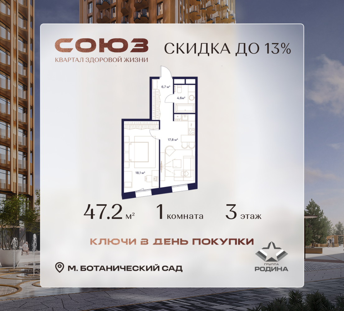 Готовые дома и ключи в день покупки <p> </p> Рассрочка 0% <p> </p> Продаётся 1-комнатная квартира площадью 47.2 м² на 3 этаже в Жилом Комплексе «Союз». <p> </p> Квартал здоровой жизни премиум-класса с рекордным количеством олимпийских видов спорта: <p> </p> - Ледовая арена для хоккея и фигурного катания, - Футбольные поля для тренировок, - Спортивный зал для фехтования, - Бассейн на 6 дорожек, - Центр единоборств, - 4 крытых площадки для настольного тенниса, - 7 теннисных кортов (крытых и открытых), - 4 крытых площадки для сквоша, - Легкоатлетический стадион, - Площадки для баскетбола и волейбола. <p> </p> <p> </p> Уникальные форматы квартир с мастер-спальнями, приватными террасами, балконами, а также пентхаусы с открыточными видами на город. <p> </p> Все квартиры продаются с отделкой Shell&Core и панорамным остеклением. <p> </p> <p> </p> Расположение <p> </p> Пешком: <p> </p> - 2 мин. до парка «Сад Будущего»; - 6 мин. до ст. м. «Ботанический сад»; - 6 мин. до ст. МЦК «Ботанический сад»; - 6 мин. до парка «Леоновская роща»; <p> </p> <p> </p> На автомобиле: <p> </p> - 2 мин. до СВХ (МСД); - 5 мин. до Проспекта Мира; - 10 мин. до ТТК; - 15 мин. до Садового кольца; - 25 мин. до аэропорта «Шереметьево». <p> </p> <p> </p> Благоустройство <p> </p> - собственная спортивная инфраструктура 7 Га; - зона для пикников; - игровые и спортивные площадки для детей всех возрастов; - розарий, а также сосновые, каштановые и дубовые аллеи; - площадки под открытым небом для занятий спортом и йоги; - игровые комнаты для детей; - лаунж-зона для резидентов; - просторная переговорная для деловых встреч; - премиальный ресторан «Шабада» Сосо Павлиашвили с водными арт-объектами на прогулочной аллее, садом ароматных трав и сценой под открытым небом; - кафе, химчистки, аптеки и супермаркеты рядом с домом. <p> </p> <p> </p> Окружение <p> </p> - 8 парков: Сад Будущего, Леоновская роща, Хуамин, Главный ботанический сад РАН, Шереметьевская дубрава, Останкино, парк спорта «Яуза», пойма реки Яуза и музей-усадьба «Останкино»; - 3 ВУЗа: ВГИК, РГСУ, МГПУ; - 12 школ, в том числе: школа 1499 им. И.А. Докукина (топ 100), Brookes Moscow, IThub школа; - 18 детских садов, в том числе билингвальный ALERTUM KIDS; - один из крупнейших океанариумов Европы «Москвариум»; - один из крупнейших в Европе торгово-развлекательных центров «Европолис».