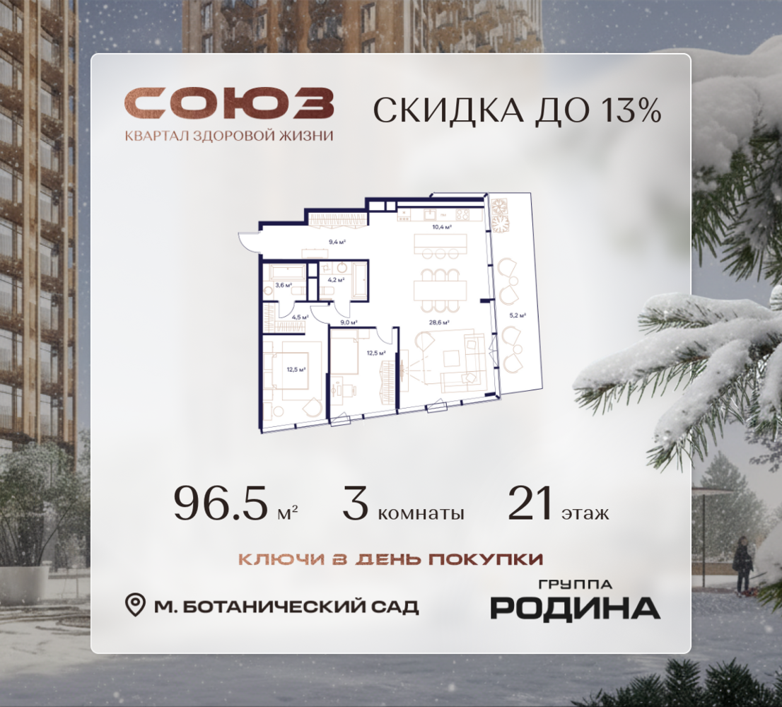 Готовые дома и ключи в день покупки <p> </p> Рассрочка 0% <p> </p> Продаётся 3-комнатная квартира площадью 96.5 м² на 21 этаже в Жилом Комплексе «Союз». <p> </p> Квартал здоровой жизни премиум-класса с рекордным количеством олимпийских видов спорта: <p> </p> - Ледовая арена для хоккея и фигурного катания, - Футбольные поля для тренировок, - Спортивный зал для фехтования, - Бассейн на 6 дорожек, - Центр единоборств, - 4 крытых площадки для настольного тенниса, - 7 теннисных кортов (крытых и открытых), - 4 крытых площадки для сквоша, - Легкоатлетический стадион, - Площадки для баскетбола и волейбола. <p> </p> <p> </p> Уникальные форматы квартир с мастер-спальнями, приватными террасами, балконами, а также пентхаусы с открыточными видами на город. <p> </p> Все квартиры продаются с отделкой Shell&Core и панорамным остеклением. <p> </p> <p> </p> Расположение <p> </p> Пешком: <p> </p> - 2 мин. до парка «Сад Будущего»; - 6 мин. до ст. м. «Ботанический сад»; - 6 мин. до ст. МЦК «Ботанический сад»; - 6 мин. до парка «Леоновская роща»; <p> </p> <p> </p> На автомобиле: <p> </p> - 2 мин. до СВХ (МСД); - 5 мин. до Проспекта Мира; - 10 мин. до ТТК; - 15 мин. до Садового кольца; - 25 мин. до аэропорта «Шереметьево». <p> </p> <p> </p> Благоустройство <p> </p> - собственная спортивная инфраструктура 7 Га; - зона для пикников; - игровые и спортивные площадки для детей всех возрастов; - розарий, а также сосновые, каштановые и дубовые аллеи; - площадки под открытым небом для занятий спортом и йоги; - игровые комнаты для детей; - лаунж-зона для резидентов; - просторная переговорная для деловых встреч; - премиальный ресторан «Шабада» Сосо Павлиашвили с водными арт-объектами на прогулочной аллее, садом ароматных трав и сценой под открытым небом; - кафе, химчистки, аптеки и супермаркеты рядом с домом. <p> </p> <p> </p> Окружение <p> </p> - 8 парков: Сад Будущего, Леоновская роща, Хуамин, Главный ботанический сад РАН, Шереметьевская дубрава, Останкино, парк спорта «Яуза», пойма реки Яуза и музей-усадьба «Останкино»; - 3 ВУЗа: ВГИК, РГСУ, МГПУ; - 12 школ, в том числе: школа 1499 им. И.А. Докукина (топ 100), Brookes Moscow, IThub школа; - 18 детских садов, в том числе билингвальный ALERTUM KIDS; - один из крупнейших океанариумов Европы «Москвариум»; - один из крупнейших в Европе торгово-развлекательных центров «Европолис».