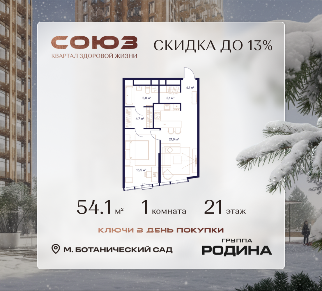 Готовые дома и ключи в день покупки <p> </p> Рассрочка 0% <p> </p> Продаётся 1-комнатная квартира площадью 54.1 м² на 21 этаже в Жилом Комплексе «Союз». <p> </p> Квартал здоровой жизни премиум-класса с рекордным количеством олимпийских видов спорта: <p> </p> - Ледовая арена для хоккея и фигурного катания, - Футбольные поля для тренировок, - Спортивный зал для фехтования, - Бассейн на 6 дорожек, - Центр единоборств, - 4 крытых площадки для настольного тенниса, - 7 теннисных кортов (крытых и открытых), - 4 крытых площадки для сквоша, - Легкоатлетический стадион, - Площадки для баскетбола и волейбола. <p> </p> <p> </p> Уникальные форматы квартир с мастер-спальнями, приватными террасами, балконами, а также пентхаусы с открыточными видами на город. <p> </p> Все квартиры продаются с отделкой Shell&Core и панорамным остеклением. <p> </p> <p> </p> Расположение <p> </p> Пешком: <p> </p> - 2 мин. до парка «Сад Будущего»; - 6 мин. до ст. м. «Ботанический сад»; - 6 мин. до ст. МЦК «Ботанический сад»; - 6 мин. до парка «Леоновская роща»; <p> </p> <p> </p> На автомобиле: <p> </p> - 2 мин. до СВХ (МСД); - 5 мин. до Проспекта Мира; - 10 мин. до ТТК; - 15 мин. до Садового кольца; - 25 мин. до аэропорта «Шереметьево». <p> </p> <p> </p> Благоустройство <p> </p> - собственная спортивная инфраструктура 7 Га; - зона для пикников; - игровые и спортивные площадки для детей всех возрастов; - розарий, а также сосновые, каштановые и дубовые аллеи; - площадки под открытым небом для занятий спортом и йоги; - игровые комнаты для детей; - лаунж-зона для резидентов; - просторная переговорная для деловых встреч; - премиальный ресторан «Шабада» Сосо Павлиашвили с водными арт-объектами на прогулочной аллее, садом ароматных трав и сценой под открытым небом; - кафе, химчистки, аптеки и супермаркеты рядом с домом. <p> </p> <p> </p> Окружение <p> </p> - 8 парков: Сад Будущего, Леоновская роща, Хуамин, Главный ботанический сад РАН, Шереметьевская дубрава, Останкино, парк спорта «Яуза», пойма реки Яуза и музей-усадьба «Останкино»; - 3 ВУЗа: ВГИК, РГСУ, МГПУ; - 12 школ, в том числе: школа 1499 им. И.А. Докукина (топ 100), Brookes Moscow, IThub школа; - 18 детских садов, в том числе билингвальный ALERTUM KIDS; - один из крупнейших океанариумов Европы «Москвариум»; - один из крупнейших в Европе торгово-развлекательных центров «Европолис».