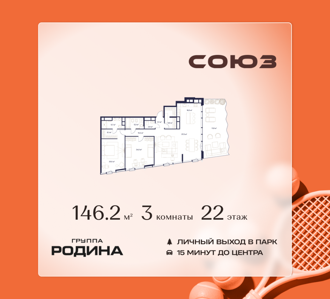 Готовые дома и ключи в день покупки <p> </p> Рассрочка 0% <p> </p> Продаётся 3-комнатная квартира площадью 146.2 м² на 22 этаже в Жилом Комплексе «Союз». <p> </p> Квартал здоровой жизни премиум-класса с рекордным количеством олимпийских видов спорта: <p> </p> - Ледовая арена для хоккея и фигурного катания, - Футбольные поля для тренировок, - Спортивный зал для фехтования, - Бассейн на 6 дорожек, - Центр единоборств, - 4 крытых площадки для настольного тенниса, - 7 теннисных кортов (крытых и открытых), - 4 крытых площадки для сквоша, - Легкоатлетический стадион, - Площадки для баскетбола и волейбола. <p> </p> <p> </p> Уникальные форматы квартир с мастер-спальнями, приватными террасами, балконами, а также пентхаусы с открыточными видами на город. <p> </p> Все квартиры продаются с отделкой Shell&Core и панорамным остеклением. <p> </p> <p> </p> Расположение <p> </p> Пешком: <p> </p> - 2 мин. до парка «Сад Будущего»; - 6 мин. до ст. м. «Ботанический сад»; - 6 мин. до ст. МЦК «Ботанический сад»; - 6 мин. до парка «Леоновская роща»; <p> </p> <p> </p> На автомобиле: <p> </p> - 2 мин. до СВХ (МСД); - 5 мин. до Проспекта Мира; - 10 мин. до ТТК; - 15 мин. до Садового кольца; - 25 мин. до аэропорта «Шереметьево». <p> </p> <p> </p> Благоустройство <p> </p> - собственная спортивная инфраструктура 7 Га; - зона для пикников; - игровые и спортивные площадки для детей всех возрастов; - розарий, а также сосновые, каштановые и дубовые аллеи; - площадки под открытым небом для занятий спортом и йоги; - игровые комнаты для детей; - лаунж-зона для резидентов; - просторная переговорная для деловых встреч; - премиальный ресторан «Шабада» Сосо Павлиашвили с водными арт-объектами на прогулочной аллее, садом ароматных трав и сценой под открытым небом; - кафе, химчистки, аптеки и супермаркеты рядом с домом. <p> </p> <p> </p> Окружение <p> </p> - 8 парков: Сад Будущего, Леоновская роща, Хуамин, Главный ботанический сад РАН, Шереметьевская дубрава, Останкино, парк спорта «Яуза», пойма реки Яуза и музей-усадьба «Останкино»; - 3 ВУЗа: ВГИК, РГСУ, МГПУ; - 12 школ, в том числе: школа 1499 им. И.А. Докукина (топ 100), Brookes Moscow, IThub школа; - 18 детских садов, в том числе билингвальный ALERTUM KIDS; - один из крупнейших океанариумов Европы «Москвариум»; - один из крупнейших в Европе торгово-развлекательных центров «Европолис».