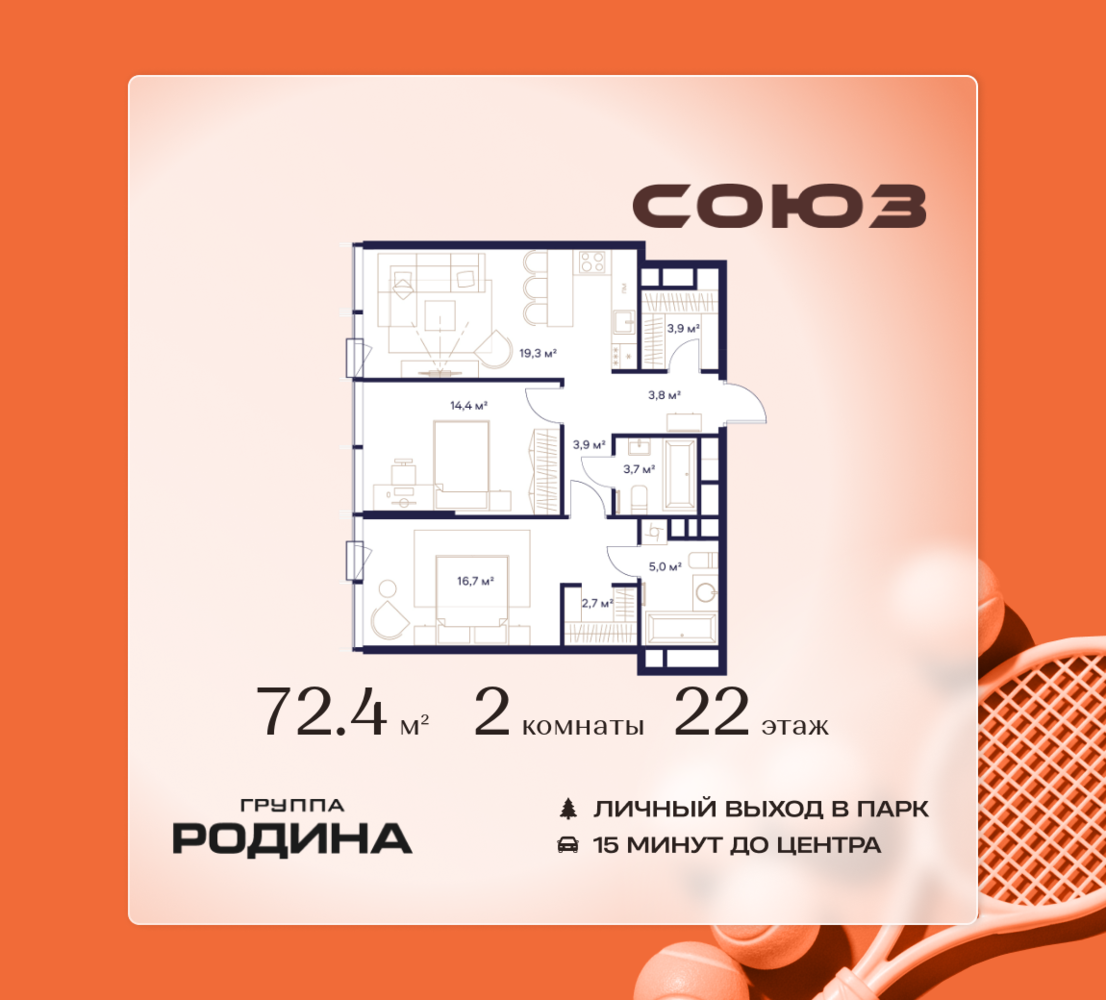 Готовые дома и ключи в день покупки <p> </p> Рассрочка 0% <p> </p> Продаётся 2-комнатная квартира площадью 72.4 м² на 22 этаже в Жилом Комплексе «Союз». <p> </p> Квартал здоровой жизни премиум-класса с рекордным количеством олимпийских видов спорта: <p> </p> - Ледовая арена для хоккея и фигурного катания, - Футбольные поля для тренировок, - Спортивный зал для фехтования, - Бассейн на 6 дорожек, - Центр единоборств, - 4 крытых площадки для настольного тенниса, - 7 теннисных кортов (крытых и открытых), - 4 крытых площадки для сквоша, - Легкоатлетический стадион, - Площадки для баскетбола и волейбола. <p> </p> <p> </p> Уникальные форматы квартир с мастер-спальнями, приватными террасами, балконами, а также пентхаусы с открыточными видами на город. <p> </p> Все квартиры продаются с отделкой Shell&Core и панорамным остеклением. <p> </p> <p> </p> Расположение <p> </p> Пешком: <p> </p> - 2 мин. до парка «Сад Будущего»; - 6 мин. до ст. м. «Ботанический сад»; - 6 мин. до ст. МЦК «Ботанический сад»; - 6 мин. до парка «Леоновская роща»; <p> </p> <p> </p> На автомобиле: <p> </p> - 2 мин. до СВХ (МСД); - 5 мин. до Проспекта Мира; - 10 мин. до ТТК; - 15 мин. до Садового кольца; - 25 мин. до аэропорта «Шереметьево». <p> </p> <p> </p> Благоустройство <p> </p> - собственная спортивная инфраструктура 7 Га; - зона для пикников; - игровые и спортивные площадки для детей всех возрастов; - розарий, а также сосновые, каштановые и дубовые аллеи; - площадки под открытым небом для занятий спортом и йоги; - игровые комнаты для детей; - лаунж-зона для резидентов; - просторная переговорная для деловых встреч; - премиальный ресторан «Шабада» Сосо Павлиашвили с водными арт-объектами на прогулочной аллее, садом ароматных трав и сценой под открытым небом; - кафе, химчистки, аптеки и супермаркеты рядом с домом. <p> </p> <p> </p> Окружение <p> </p> - 8 парков: Сад Будущего, Леоновская роща, Хуамин, Главный ботанический сад РАН, Шереметьевская дубрава, Останкино, парк спорта «Яуза», пойма реки Яуза и музей-усадьба «Останкино»; - 3 ВУЗа: ВГИК, РГСУ, МГПУ; - 12 школ, в том числе: школа 1499 им. И.А. Докукина (топ 100), Brookes Moscow, IThub школа; - 18 детских садов, в том числе билингвальный ALERTUM KIDS; - один из крупнейших океанариумов Европы «Москвариум»; - один из крупнейших в Европе торгово-развлекательных центров «Европолис».