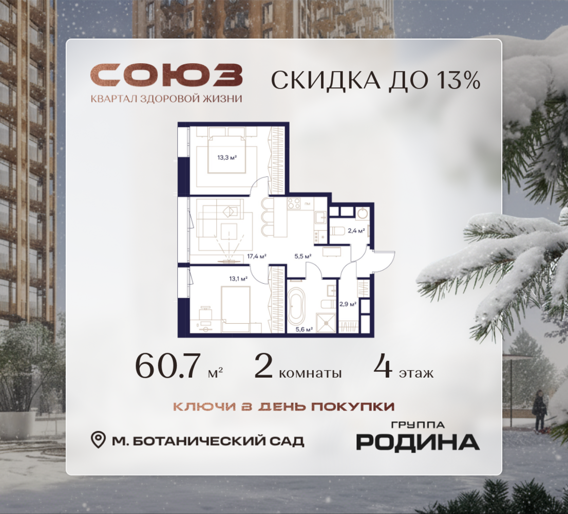 Готовые дома и ключи в день покупки <p> </p> Рассрочка 0% <p> </p> Продаётся 2-комнатная квартира площадью 60.7 м² на 4 этаже в Жилом Комплексе «Союз». <p> </p> Квартал здоровой жизни премиум-класса с рекордным количеством олимпийских видов спорта: <p> </p> - Ледовая арена для хоккея и фигурного катания, - Футбольные поля для тренировок, - Спортивный зал для фехтования, - Бассейн на 6 дорожек, - Центр единоборств, - 4 крытых площадки для настольного тенниса, - 7 теннисных кортов (крытых и открытых), - 4 крытых площадки для сквоша, - Легкоатлетический стадион, - Площадки для баскетбола и волейбола. <p> </p> <p> </p> Уникальные форматы квартир с мастер-спальнями, приватными террасами, балконами, а также пентхаусы с открыточными видами на город. <p> </p> Все квартиры продаются с отделкой Shell&Core и панорамным остеклением. <p> </p> <p> </p> Расположение <p> </p> Пешком: <p> </p> - 2 мин. до парка «Сад Будущего»; - 6 мин. до ст. м. «Ботанический сад»; - 6 мин. до ст. МЦК «Ботанический сад»; - 6 мин. до парка «Леоновская роща»; <p> </p> <p> </p> На автомобиле: <p> </p> - 2 мин. до СВХ (МСД); - 5 мин. до Проспекта Мира; - 10 мин. до ТТК; - 15 мин. до Садового кольца; - 25 мин. до аэропорта «Шереметьево». <p> </p> <p> </p> Благоустройство <p> </p> - собственная спортивная инфраструктура 7 Га; - зона для пикников; - игровые и спортивные площадки для детей всех возрастов; - розарий, а также сосновые, каштановые и дубовые аллеи; - площадки под открытым небом для занятий спортом и йоги; - игровые комнаты для детей; - лаунж-зона для резидентов; - просторная переговорная для деловых встреч; - премиальный ресторан «Шабада» Сосо Павлиашвили с водными арт-объектами на прогулочной аллее, садом ароматных трав и сценой под открытым небом; - кафе, химчистки, аптеки и супермаркеты рядом с домом. <p> </p> <p> </p> Окружение <p> </p> - 8 парков: Сад Будущего, Леоновская роща, Хуамин, Главный ботанический сад РАН, Шереметьевская дубрава, Останкино, парк спорта «Яуза», пойма реки Яуза и музей-усадьба «Останкино»; - 3 ВУЗа: ВГИК, РГСУ, МГПУ; - 12 школ, в том числе: школа 1499 им. И.А. Докукина (топ 100), Brookes Moscow, IThub школа; - 18 детских садов, в том числе билингвальный ALERTUM KIDS; - один из крупнейших океанариумов Европы «Москвариум»; - один из крупнейших в Европе торгово-развлекательных центров «Европолис».