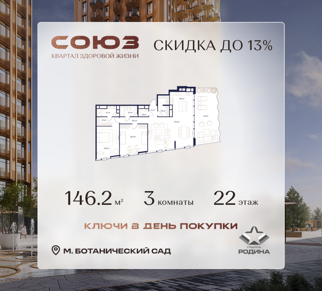 Готовые дома и ключи в день покупки <p> </p> Рассрочка 0% <p> </p> Продаётся 3-комнатная квартира площадью 146.2 м² на 22 этаже в Жилом Комплексе «Союз». <p> </p> Квартал здоровой жизни премиум-класса с рекордным количеством олимпийских видов спорта: <p> </p> - Ледовая арена для хоккея и фигурного катания, - Футбольные поля для тренировок, - Спортивный зал для фехтования, - Бассейн на 6 дорожек, - Центр единоборств, - 4 крытых площадки для настольного тенниса, - 7 теннисных кортов (крытых и открытых), - 4 крытых площадки для сквоша, - Легкоатлетический стадион, - Площадки для баскетбола и волейбола. <p> </p> <p> </p> Уникальные форматы квартир с мастер-спальнями, приватными террасами, балконами, а также пентхаусы с открыточными видами на город. <p> </p> Все квартиры продаются с отделкой Shell&Core и панорамным остеклением. <p> </p> <p> </p> Расположение <p> </p> Пешком: <p> </p> - 2 мин. до парка «Сад Будущего»; - 6 мин. до ст. м. «Ботанический сад»; - 6 мин. до ст. МЦК «Ботанический сад»; - 6 мин. до парка «Леоновская роща»; <p> </p> <p> </p> На автомобиле: <p> </p> - 2 мин. до СВХ (МСД); - 5 мин. до Проспекта Мира; - 10 мин. до ТТК; - 15 мин. до Садового кольца; - 25 мин. до аэропорта «Шереметьево». <p> </p> <p> </p> Благоустройство <p> </p> - собственная спортивная инфраструктура 7 Га; - зона для пикников; - игровые и спортивные площадки для детей всех возрастов; - розарий, а также сосновые, каштановые и дубовые аллеи; - площадки под открытым небом для занятий спортом и йоги; - игровые комнаты для детей; - лаунж-зона для резидентов; - просторная переговорная для деловых встреч; - премиальный ресторан «Шабада» Сосо Павлиашвили с водными арт-объектами на прогулочной аллее, садом ароматных трав и сценой под открытым небом; - кафе, химчистки, аптеки и супермаркеты рядом с домом. <p> </p> <p> </p> Окружение <p> </p> - 8 парков: Сад Будущего, Леоновская роща, Хуамин, Главный ботанический сад РАН, Шереметьевская дубрава, Останкино, парк спорта «Яуза», пойма реки Яуза и музей-усадьба «Останкино»; - 3 ВУЗа: ВГИК, РГСУ, МГПУ; - 12 школ, в том числе: школа 1499 им. И.А. Докукина (топ 100), Brookes Moscow, IThub школа; - 18 детских садов, в том числе билингвальный ALERTUM KIDS; - один из крупнейших океанариумов Европы «Москвариум»; - один из крупнейших в Европе торгово-развлекательных центров «Европолис».