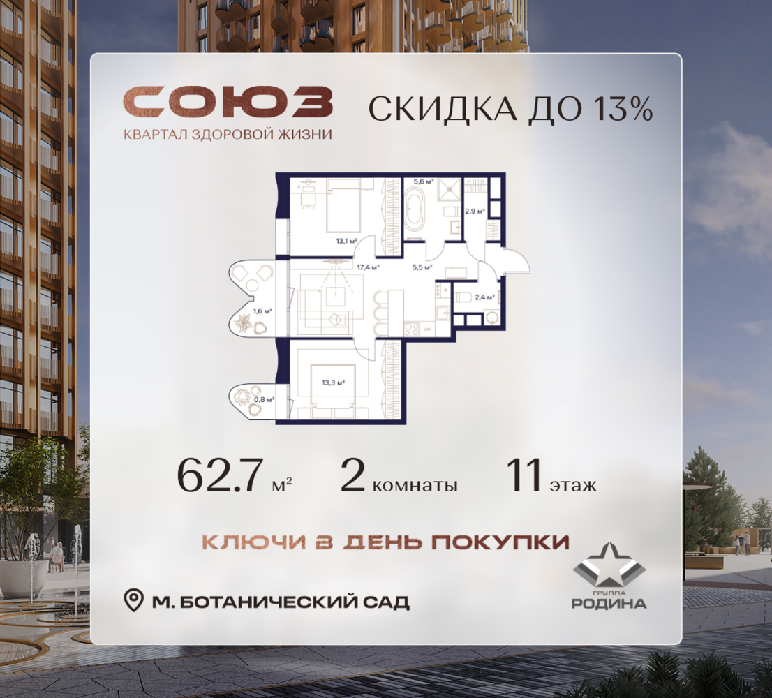Готовые дома и ключи в день покупки <p> </p> Рассрочка 0% <p> </p> Продаётся 2-комнатная квартира площадью 62.7 м² на 11 этаже в Жилом Комплексе «Союз». <p> </p> Квартал здоровой жизни премиум-класса с рекордным количеством олимпийских видов спорта: <p> </p> - Ледовая арена для хоккея и фигурного катания, - Футбольные поля для тренировок, - Спортивный зал для фехтования, - Бассейн на 6 дорожек, - Центр единоборств, - 4 крытых площадки для настольного тенниса, - 7 теннисных кортов (крытых и открытых), - 4 крытых площадки для сквоша, - Легкоатлетический стадион, - Площадки для баскетбола и волейбола. <p> </p> <p> </p> Уникальные форматы квартир с мастер-спальнями, приватными террасами, балконами, а также пентхаусы с открыточными видами на город. <p> </p> Все квартиры продаются с отделкой Shell&Core и панорамным остеклением. <p> </p> <p> </p> Расположение <p> </p> Пешком: <p> </p> - 2 мин. до парка «Сад Будущего»; - 6 мин. до ст. м. «Ботанический сад»; - 6 мин. до ст. МЦК «Ботанический сад»; - 6 мин. до парка «Леоновская роща»; <p> </p> <p> </p> На автомобиле: <p> </p> - 2 мин. до СВХ (МСД); - 5 мин. до Проспекта Мира; - 10 мин. до ТТК; - 15 мин. до Садового кольца; - 25 мин. до аэропорта «Шереметьево». <p> </p> <p> </p> Благоустройство <p> </p> - собственная спортивная инфраструктура 7 Га; - зона для пикников; - игровые и спортивные площадки для детей всех возрастов; - розарий, а также сосновые, каштановые и дубовые аллеи; - площадки под открытым небом для занятий спортом и йоги; - игровые комнаты для детей; - лаунж-зона для резидентов; - просторная переговорная для деловых встреч; - премиальный ресторан «Шабада» Сосо Павлиашвили с водными арт-объектами на прогулочной аллее, садом ароматных трав и сценой под открытым небом; - кафе, химчистки, аптеки и супермаркеты рядом с домом. <p> </p> <p> </p> Окружение <p> </p> - 8 парков: Сад Будущего, Леоновская роща, Хуамин, Главный ботанический сад РАН, Шереметьевская дубрава, Останкино, парк спорта «Яуза», пойма реки Яуза и музей-усадьба «Останкино»; - 3 ВУЗа: ВГИК, РГСУ, МГПУ; - 12 школ, в том числе: школа 1499 им. И.А. Докукина (топ 100), Brookes Moscow, IThub школа; - 18 детских садов, в том числе билингвальный ALERTUM KIDS; - один из крупнейших океанариумов Европы «Москвариум»; - один из крупнейших в Европе торгово-развлекательных центров «Европолис».